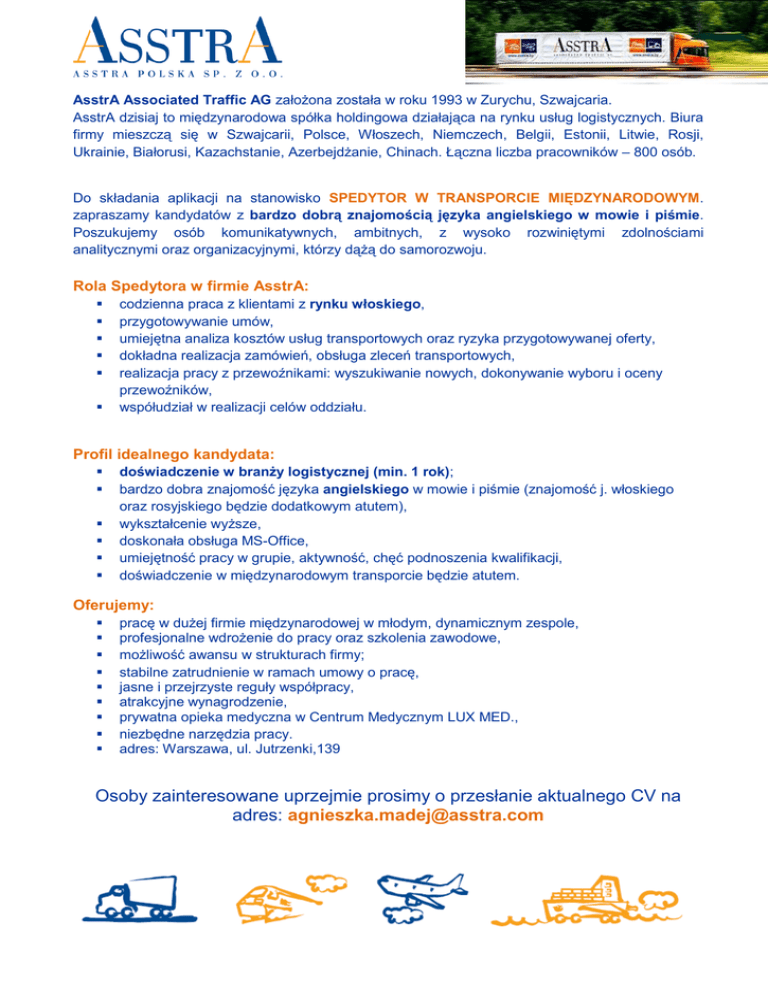 AsstrA Associated Traffic AG założona została w roku 1993 w Zurychu, Szwajcaria. AsstrA dzisiaj to międzynarodowa spółka holdingowa działająca na rynku usług logistycznych. Biura firmy mieszczą się w Szwajcarii, Polsce, Włoszech, Niemczech, Belgii, Estonii, Litwie, Rosji, Ukrainie, Białorusi, Kazachstanie, Azerbejdżanie, Chinach. Łączna liczba pracowników – 800 osób. Do składania aplikacji na stanowisko SPEDYTOR W TRANSPORCIE MIĘDZYNARODOWYM. zapraszamy kandydatów z bardzo dobrą znajomością języka angielskiego w mowie i piśmie. Poszukujemy osób komunikatywnych, ambitnych, z wysoko rozwiniętymi zdolnościami analitycznymi oraz organizacyjnymi, którzy dążą do samorozwoju. Rola Spedytora w firmie AsstrA: codzienna praca z klientami z rynku włoskiego, przygotowywanie umów, umiejętna analiza kosztów usług transportowych oraz ryzyka przygotowywanej oferty, dokładna realizacja zamówień, obsługa zleceń transportowych, realizacja pracy z przewoźnikami: wyszukiwanie nowych, dokonywanie wyboru i oceny przewoźników, współudział w realizacji celów oddziału. Profil idealnego kandydata: doświadczenie w branży logistycznej (min. 1 rok); bardzo dobra znajomość języka angielskiego w mowie i piśmie (znajomość j. włoskiego oraz rosyjskiego będzie dodatkowym atutem), wykształcenie wyższe, doskonała obsługa MS-Office, umiejętność pracy w grupie, aktywność, chęć podnoszenia kwalifikacji, doświadczenie w międzynarodowym transporcie będzie atutem. Oferujemy: pracę w dużej firmie międzynarodowej w młodym, dynamicznym zespole, profesjonalne wdrożenie do pracy oraz szkolenia zawodowe, możliwość awansu w strukturach firmy; stabilne zatrudnienie w ramach umowy o pracę, jasne i przejrzyste reguły współpracy, atrakcyjne wynagrodzenie, prywatna opieka medyczna w Centrum Medycznym LUX MED., niezbędne narzędzia pracy. adres: Warszawa, ul. Jutrzenki,139 Osoby zainteresowane uprzejmie prosimy o przesłanie aktualnego CV na adres: [email protected]