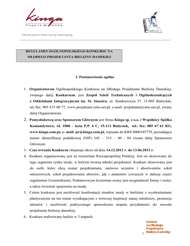 PRODUCENT BIELIZNY DAMSKIEJ _______________________________________________________________________________________________ REGULAMIN OGÓLNOPOLSKIEGO KONKURSU NA MŁODEGO PROJEKTANTA BIELIZNY DAMSKIEJ I. Postanowienia ogólne 1. Organizatorem Ogólnopolskiego Konkursu na Młodego Projektanta Bielizny Damskiej, zwanego dalej Konkursem, jest Zespół Szkół Technicznych i Ogólnokształcących z Oddziałami Integracyjnymi im. St. Staszica, ul. Sienkiewicza 57, 15-002 Białystok, tel./fax: 085 675 00 77, www.projektant.zstio.net.pl, e-mail: [email protected], zwany dalej Organizatorem. 2. Pomysłodawcą oraz Sponsorem Głównym jest firma Kinga sp. z o.o. i Wspólnicy Spółka Komandytowa, Al. 1000 – lecia P.P. 6 C, 15-111 Białystok, tel./ fax: 085 67 61 821, www.kinga.com.pl, e- mail: [email protected], wpisana do KRS 0000345779, posiadająca numer identyfikacji podatkowej (NIP) 542 – 315 – 40 - 84 zwana dalej Sponsorem Głównym. 3. Czas trwania Konkursu obejmuje okres od dnia 14.12.2012 r. do 13.06.2013 r. 4. Konkurs organizowany jest na terytorium Rzeczpospolitej Polskiej. Jest on skierowany do tego segmentu rynku mody, w którym tworzą młodzi projektanci. Konkurs skierowany jest do osób, które chcą zostać projektantami, zarówno uczniów i absolwentów szkół odzieżowych, szkół projektowania ubiorów, jak i amatorów (zwanych w dalszej części regulaminu Uczestnikiem). Podstawowym kryterium oceny jest oryginalność formy i treści, a także świeżość spojrzenia na modę. 5. Celem konkursu jest możliwość konfrontacji trendów mody w bieliźnie z wyobrażeniami plastycznymi na ten temat wynikającymi z twórczej inspiracji samej młodzieży, promocja talentów i możliwość praktycznego sprawdzenia stopnia przydatności do zawodu projektanta bielizny damskiej. 6. Konkurs realizowany będzie w 3 etapach. 1 PRODUCENT BIELIZNY DAMSKIEJ _______________________________________________________________________________________________ II. Warunki uczestnictwa w Konkursie 1. Uczestnik dokonuje zgłoszenia na Karcie Zgłoszenia do udziału w Ogólnopolskim Konkursie na Młodego Projektanta Bielizny Damskiej dostępnej na stronie internetowej Organizatora www.projektant.zstio.net.pl www.kinga.com.pl w dziale oraz Centrum na stronie Prasowe, a Głównego Sponsora także na stronie www.konkursnamlodegoprojektanta.pl w zakładce Regulamin. Karta Zgłoszenia powinna zawierać w szczególności: imię i nazwisko Uczestnika, datę i miejsce jego urodzenia, adres zamieszkania, numer telefonu kontaktowego, adres e-mail, miejsce nauki (adres i telefon, klasa) oraz imię i nazwisko desygnowanego opiekuna, a także datę i podpis. 2. Jeżeli zgłoszenie firmuje szkoła lub inna instytucja, obok podpisu zgłaszającego należy umieścić pieczątkę placówki i podpis jej Dyrektora. 3. Warunkiem wzięcia udziału w Konkursie przez nieletniego Uczestnika jest zgoda opiekunów ustawowych Uczestnika na wzięcie udziału w Konkursie, w tym na przyjazd i wystawienie projektu. 4. Udział w Konkursie i podanie związanych z udziałem danych osobowych jest całkowicie dobrowolne. III. Zasady Konkursu 1. Konkurs ma formę warsztatów, podczas których Uczestnicy zaprojektują, skroją oraz odszyją koszulkę nocną pod okiem specjalistów. 2. Konkurs realizowany jest w trzech etapach: 2 PRODUCENT BIELIZNY DAMSKIEJ _______________________________________________________________________________________________ ETAP 1 – NADSYŁANIE PRAC 1. Do konkursu każdy uczestnik może składać najwyżej 4 rysunki żurnalowe (2 rysunki kompletu bielizny, 2 rysunki koszulki nocnej). 2. Zgłoszeniem do konkursu jest wypełniona Karta Zgłoszenia, wraz z rysunkami zawierająca dane osobowe i wymagane w niej informacje, przesłana drogą pocztową na adres Sponsora Głównego, tj. Kinga sp. z o.o. i Wspólnicy Spółka Komandytowa, Al. 1000 – lecia Państwa Polskiego 6C; 15-111 Białystok do dnia 14 kwietnia 2013 r. z dopiskiem: Dział Marketingu. Decyduje data stempla pocztowego. 3. Uczestnik konkursu ma także możliwość wypełnić elektroniczną Kartę Zgłoszenia do udziału w Konkursie na stronie www.konkursnamlodegoprojektanta.pl w zakładce Zgłoszenie Prac. 4. Do każdego ze zgłoszonych rysunków (projekty formatu A– 4 wykonane odręcznie, w kolorze, technika dowolna) należy załączyć Kartę opisu projektu plastycznego, która zawiera: rodzaj tkaniny, dzianiny i innych materiałów do wykonania projektu rodzaj dodatków krawieckich np.: wstawki, elementy dekoracyjne wraz z rodzajem i ilością. opis kolorów 5. Prace, które zostały przesłane po terminie lub, do których nie dołączono Karty Zgłoszeniowej, nie będą brane pod uwagę w etapie kwalifikacyjnym. ETAP 2 – KWALIFIKACJA 1. Etap ten rozpoczyna się po zakończeniu etapu pierwszego i zakończy się do dnia 30.04.2013r. Profesjonalne Jury powołane przez Organizatora i Sponsora Głównego wybierze najciekawsze z prac. 2. Autorzy wybranych prac zostaną powiadomieni o tym fakcie przez Organizatora. 3 PRODUCENT BIELIZNY DAMSKIEJ _______________________________________________________________________________________________ 3. Dziesięciu autorów najciekawszych projektów zostanie zaproszonych na bezpłatne warsztaty projektowania i odszycia modelu koszulki nocnej pod okiem specjalistów. ETAP 3 – WARSZTATY 1. Warunkiem uczestnictwa w warsztatach jest potwierdzenie obecności do dnia 31 maja 2013 r. 2. Warsztaty odbędą się w dniach 12 – 13 czerwca 2013 r. w siedzibie Organizatora, tj. w Zespole Szkół Technicznych i Ogólnokształcących z Oddziałami Integracyjnymi im. Stanisława Staszica w Białymstoku, adres: ul. Sienkiewicza 57; 15-002 Białystok. 3. W warsztatach weźmie udział 10 osób (autorów). 4. Organizator, ani Sponsor Główny nie ponoszą kosztów przejazdu, ubezpieczenia, zakwaterowania oraz wyżywienia uczestników podczas warsztatów. 5. Organizator może zarezerwować noclegi i wyżywienie dojeżdża