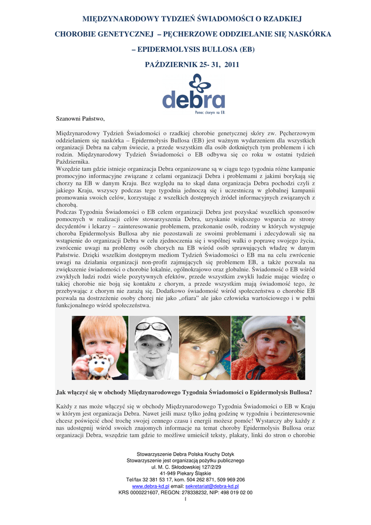 MIĘDZYNARODOWY TYDZIEŃ ŚWIADOMOŚCI O RZADKIEJ CHOROBIE GENETYCZNEJ – PĘCHERZOWE ODDZIELANIE SIĘ NASKÓRKA – EPIDERMOLYSIS BULLOSA (EB) PAŹDZIERNIK 25- 31, 2011 Szanowni Państwo, Międzynarodowy Tydzień Świadomości o rzadkiej chorobie genetycznej skóry zw. Pęcherzowym oddzielaniem się naskórka – Epidermolysis Bullosa (EB) jest ważnym wydarzeniem dla wszystkich organizacji Debra na całym świecie, a przede wszystkim dla osób dotkniętych tym problemem i ich rodzin. Międzynarodowy Tydzień Świadomości o EB odbywa się co roku w ostatni tydzień Października. Wszędzie tam gdzie istnieje organizacja Debra organizowane są w ciągu tego tygodnia różne kampanie promocyjno informacyjne związane z celami organizacji Debra i problemami z jakimi borykają się chorzy na EB w danym Kraju. Bez względu na to skąd dana organizacja Debra pochodzi czyli z jakiego Kraju, wszyscy podczas tego tygodnia jednoczą się i uczestniczą w globalnej kampanii promowania swoich celów, korzystając z wszelkich dostępnych źródeł informacyjnych związanych z chorobą. Podczas Tygodnia Świadomości o EB celem organizacji Debra jest pozyskać wszelkich sponsorów pomocnych w realizacji celów stowarzyszenia Debra, uzyskanie większego wsparcia ze strony decydentów i lekarzy – zainteresowanie problemem, przekonanie osób, rodziny w których występuje choroba Epidermolysis Bullosa aby nie pozostawali ze swoimi problemami i zdecydowali się na wstąpienie do organizacji Debra w celu zjednoczenia się i wspólnej walki o poprawę swojego życia, zwrócenie uwagi na problemy osób chorych na EB wśród osób sprawujących władzę w danym Państwie. Dzięki wszelkim dostępnym mediom Tydzień Świadomości o EB ma na celu zwrócenie uwagi na działania organizacji non-profit zajmujących się problemem EB, a także pozwala na zwiększenie świadomości o chorobie lokalnie, ogólnokrajowo oraz globalnie. Świadomość o EB wśród zwykłych ludzi rodzi wiele pozytywnych efektów, przede wszystkim zwykli ludzie mając wiedzę o takiej chorobie nie boją się kontaktu z chorym, a przede wszystkim mają świadomość tego, że przebywając z chorym nie zarażą się. Dodatkowo świadomość wśród społeczeństwa o chorobie EB pozwala na dostrzeżenie osoby chorej nie jako „ofiara” ale jako człowieka wartościowego i w pełni funkcjonalnego wśród społeczeństwa. Jak włączyć się w obchody Międzynarodowego Tygodnia Świadomości o Epidermolysis Bullosa? Każdy z nas może włączyć się w obchody Międzynarodowego Tygodnia Świadomości o EB w Kraju w którym jest organizacja Debra. Nawet jeśli masz tylko jedną godzinę w tygodniu i bezinteresownie chcesz poświęcić choć trochę swojej cennego czasu i energii możesz pomóc! Wystarczy aby każdy z nas udostępnij wśród swoich znajomych informacje na temat choroby Epidermolysis Bullosa oraz organizacji Debra, wszędzie tam gdzie to możliwe umieścił teksty, plakaty, linki do stron o chorobie Stowarzyszenie Debra Polska Kruchy Dotyk Stowarzyszenie jest organizacją pożytku publicznego ul. M. C. Skłodowskiej 127/2/29 41-949 Piekary Śląskie Tel/fax 32 381 53 17, kom. 504 262 871, 509 969 206 www.debra-kd.pl email: [email protected] KRS 0000221607, REGON: 278338232, NIP: 498 019 02 00 l lub po prostu jeśli czuje się na siłach skontaktował się z organizacją Debra i po prostu zapytaj jak może pomóc. Niech słowa Margaret Mead pozwolą każdemu z nas uświadomić sobie że „Nigdy nie wątp, że mała grupa myślących i oddanych obywateli może zmienić świat. Istotnie, to jedyny sposób, który kiedykolwiek mógł…” Co to jest Epidermolysis bullosa? Epidermolysis bullosa, powszechnie znana jako EB, to rodzina chorób genetycznych charakteryzujących się obecnością na całej powierzchni skóry, która jest niezwykle delikatna i krucha, że najmniejszy dotyk może spowodować rozwój powtarzających się w nieskończoność bolesnych pęcherzy i ran otwartych. W niektórych typach choroby, powstające pęcherze i otwarte rany zabliźniają się tworząc szpecące blizny które deformują dłonie, stopy, a także zwężają przełyk co uniemożliwia choremu normalne spożywanie posiłków, a to powoduje anemię i niedożywienie organizmu. W Polsce na Epidermolysis Bullosa choruje ponad 500 osób. Podczas normalnych czynności życiowych jakie człowiek z EB stara się wykonywać każdego dnia powstają pęcherze przypominające poparzenie 2 lub 3 stopnia – od prostych rzeczy takich jak zwykłe chodzenie, jedzenie, leżenie w łóżku lub ubieranie się i nakładanie butów, zabawa klockami, autami, lalkami itp. Dlatego też chorzy na EB często nazywani są „dzieci motyle” ze względu na swoją delikatną i bardzo wrażliwą skórę, a motyw Motyla widnieje w każdej organizacji Debra na Świecie i jest uznany jako logo. EB nie jest zaraźliwe. Choroba dotyka obu płci i występuje we wszystkich grupach rasowych i etnicznych na całym świecie. Z EB rodzi się co 17 osoba na 20.000 żywych urodzeń. Wśród narodzonych z EB niemowląt, dzieci i młodych osób dorosłych z ciężką postacią występuje wysoki wskaźnik śmiertelności. Chcesz wiedzieć więcej o EB lub chcesz pomóc wejdź na stronę www.debra-kd.pl oraz skontaktuj się z organizacją Debra w Kraju którym mieszkasz. Z poważaniem, Prezes Stowarzyszenia Debra Polska Kruchy Dotyk Przemysław Sobieszczuk ING Bank Śląski o/Katowice ul. Mickiewicza 3 Nr Konta: 78 1050 1214 1000 0023 0279 1799, 84 1050 1214 1000 0022 8908 2584