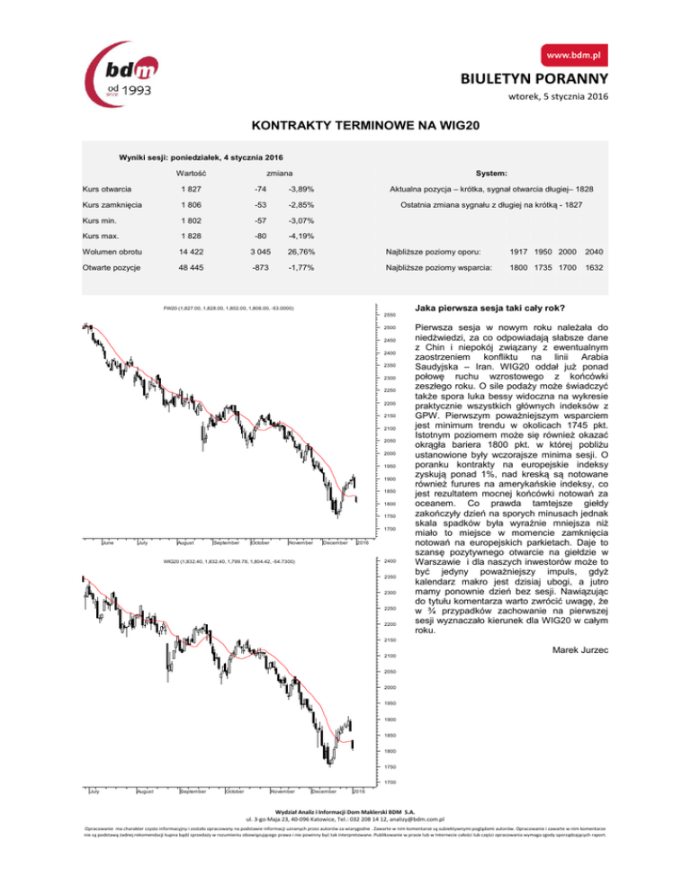 BIULETYN PORANNY wtorek, 5 stycznia 2016 KONTRAKTY TERMINOWE NA WIG20 Wyniki sesji: poniedziałek, 4 stycznia 2016 Wartość System: zmiana Kurs otwarcia 1 827 -74 -3,89% Aktualna pozycja – krótka, sygnał otwarcia długiej– 1828 Kurs zamknięcia 1 806 -53 -2,85% Ostatnia zmiana sygnału z długiej na krótką - 1827 Kurs min. 1 802 -57 -3,07% Kurs max. 1 828 -80 -4,19% Wolumen obrotu 14 422 3 045 26,76% Najbliższe poziomy oporu: 1917 1950 2000 2040 Otwarte pozycje 48 445 -873 -1,77% Najbliższe poziomy wsparcia: 1800 1735 1700 1632 Jaka pierwsza sesja taki cały rok? FW20 (1,827.00, 1,828.00, 1,802.00, 1,806.00, -53.0000) 2550 2500 2450 2400 2350 2300 2250 2200 2150 2100 2050 2000 1950 1900 1850 1800 1750 1700 June July August September October November December 2016 2400 WIG20 (1,832.40, 1,832.40, 1,799.78, 1,804.42, -54.7300) 2350 2300 2250 2200 Pierwsza sesja w nowym roku należała do niedźwiedzi, za co odpowiadają słabsze dane z Chin i niepokój związany z ewentualnym zaostrzeniem konfliktu na linii Arabia Saudyjska – Iran. WIG20 oddał już ponad połowę ruchu wzrostowego z końcówki zeszłego roku. O sile podaży może świadczyć także spora luka bessy widoczna na wykresie praktycznie wszystkich głównych indeksów z GPW. Pierwszym poważniejszym wsparciem jest minimum trendu w okolicach 1745 pkt. Istotnym poziomem może się również okazać okrągła bariera 1800 pkt. w której pobliżu ustanowione były wczorajsze minima sesji. O poranku kontrakty na europejskie indeksy zyskują ponad 1%, nad kreską są notowane również furures na amerykańskie indeksy, co jest rezultatem mocnej końcówki notowań za oceanem. Co prawda tamtejsze giełdy zakończyły dzień na sporych minusach jednak skala spadków była wyraźnie mniejsza niż miało to miejsce w momencie zamknięcia notowań na europejskich parkietach. Daje to szansę pozytywnego otwarcie na giełdzie w Warszawie i dla naszych inwestorów może to być jedyny poważniejszy impuls, gdyż kalendarz makro jest dzisiaj ubogi, a jutro mamy ponownie dzień bez sesji. Nawiązując do tytułu komentarza warto zwrócić uwagę, że w ¾ przypadków zachowanie na pierwszej sesji wyznaczało kierunek dla WIG20 w całym roku. 2150 2100 Marek Jurzec 2050 2000 1950 1900 1850 1800 1750 1700 July August September October November December 2016 Wydział Analiz i Informacji Dom Maklerski BDM S.A. ul. 3-go Maja 23, 40-096 Katowice, Tel.: 032 208 14 12, [email protected] Opracowanie ma charakter czysto informacyjny i zostało opracowany na podstawie informacji uznanych przez autorów za wiarygodne . Zawarte w nim komentarze są subiektywnymi poglądami autorów. Opracowanie i zawarte w nim komentarze nie są podstawą żadnej rekomendacji kupna bądź sprzedaży w rozumieniu obowiązującego prawa i nie powinny być tak interpretowane. Publikowanie w prasie lub w Internecie całości lub części opracowania wymaga zgody sporządzających raport. BIULETYN PORANNY wtorek, 5 stycznia 2016 RYNEK AKCJI Wyniki sesji: poniedziałek, 4 stycznia 2016 52 tygodnie Indeks Kurs otwarcia Kurs zamknięcia Zmiana [%] Kurs min. Kurs max. Zakres wahań Obrót [mln PLN] Kurs max. Kurs min. WIG20 2 558,6 1 746,0 1 832,40 1 804,42 -2,94% 1 799,78 1 832,40 32,6 350,5 WIG30 2 782,4 1 951,9 2 032,30 2 017,44 -2,80% 2 014,24 2 036,97 22,7 380,0 mWIG40 3 961,0 3 350,5 3 542,48 3 512,57 -1,53% 12 966,76 13 108,14 141,4 82,8 sWIG80 14 107,4 12 006,2 13 108,14 13 008,23 -1,54% 3 511,64 3 542,48 30,8 24,5 WIG-PL 58 998,6 44 779,8 46 500,75 46 255,72 -2,44% 46 226,96 46 500,75 273,8 444,9 WIG 57 460,4 43 724,5 45 701,18 45 356,65 -2,39% 45 271,24 45 701,30 430,1 452,4 Spółka zmiana % względem WIG30 zmiana % Cena [PLN] Mkt Cap [mln PLN] dzienna 1M 3M 6M dzienna 1M 3M 6M -17,6% -26,5% -0,2% 2,3% -5,0% -7,2% 12,2% ALIOR BANK 64,49 4 689 -3,0% -1,2% ASSECOPOL 55,50 4 607 -2,3% -3,0% -3,3% -7,1% 0,5% 0,5% 9,3% BANK HANDLOWY 70,58 9 222 -1,8% 3,8% -11,9% -22,4% 1,0% 7,3% 0,7% -3,0% BOGDANKA 32,53 1 106 -2,0% -20,2% -45,4% -43,1% 0,8% -16,7% -32,8% -23,8% BZ WBK 274,40 27 230 -3,4% 0,0% -9,8% -14,4% -0,6% 3,5% 2,8% 5,0% CCC 130,60 5 015 -5,7% -10,9% -18,9% -27,0% -2,9% -7,4% -6,3% -7,7% CD PROJEKT 21,97 2 086 -0,8% -3,7% -17,1% -10,3% 2,0% -0,2% -4,5% 9,0% CYFROWY POLSAT 21,00 13 430 0,6% -12,2% -13,2% -13,6% 3,4% -8,7% -0,6% 5,8% ENEA 10,82 4 776 -4,2% -4,7% -16,8% -29,3% -1,4% -1,2% -4,1% -9,9% EUROCASH 46,59 6 468 -3,9% -14,7% -0,7% 23,2% -1,1% -11,2% 12,0% 42,5% GRUPA AZOTY 96,38 9 560 -3,1% -9,4% 5,1% 16,1% -0,3% -5,9% 17,8% 35,5% GTC 7,15 3 291 0,0% -2,9% 11,0% 21,3% 2,8% 0,6% 23,6% 40,6% ING BSK 116,90 15 209 -0,2% 2,5% -2,6% -9,4% 2,6% 6,0% 10,0% 10,0% JSW 10,38 1 219 -2,5% -14,6% -16,2% -13,4% 0,3% -11,1% -3,6% 5,9% KERNEL 48,10 3 833 0,0% 1,3% 9,0% 26,9% 2,8% 4,8% 21,7% 46,3% KGHM 59,51 11 902 -6,3% -10,5% -29,0% -43,8% -3,5% -7,0% -16,3% -24,4% LOTOS 26,55 4 908 -1,7% -6,6% -9,4% -8,8% 1,1% -3,2% 3,2% 10,5% 5 490,00 10 053 -1,2% -17,1% -24,8% -17,6% 1,6% -13,6% -12,2% 1,8% 307,75 12 999 -2,0% 1,6% -16,3% -22,9% 0,8% 5,1% -3,7% -3,5% NETIA 5,38 1 873 -0,4% 1,5% -1,3% -0,4% 2,4% 5,0% 11,3% 19,0% ORANGE POLSKA 6,43 8 438 -2,0% -0,3% -9,8% -21,3% 0,8% 3,2% 2,8% -2,0% PEKAO 139,75 36 680 -2,6% 0,0% -9,2% -18,9% 0,2% 3,5% 3,4% 0,4% PGE 12,57 23 503 -1,7% -5,8% -6,1% -30,1% 1,1% -2,3% 6,6% -10,7% PGNIG 4,96 29 264 -3,5% -1,4% -28,1% -26,7% -0,7% 2,1% -15,5% -7,4% PKNORLEN 64,95 27 780 -4,3% -2,0% -4,5% -8,5% -1,5% 1,5% 8,1% 10,9% PKOBP 26,52 33 150 -3,0% 2,7% -11,3% -11,6% -0,2% 6,2% 1,3% 7,7% PKP CARGO 65,85 2 949 -3,8% 3,4% 1,6% -21,8% -1,0% 6,9% 14,2% -2,5% PZU 33,42 28 859 -1,8% -6,2% -13,6% -24,0% 1,0% -2,7% -1,0% -4,6% SYNTHOS 3,70 4 896 -2,9% 1,6% -4,6% -18,5% -0,1% 5,1% 8,0% 0,8% TAURON 2,82 4 942 -2,1% 8,5% -12,1% -33,6% 0,7% 12,0% 0,5% -14,3% LPP mBANK Wydział Analiz i Informacji Dom Maklerski BDM S.A. ul. 3-go Maja 23, 40-096 Katowice, Tel.: 032 208 14 12, [email protected] Opracowanie ma charakter czysto informacyjny i zostało opracowany n