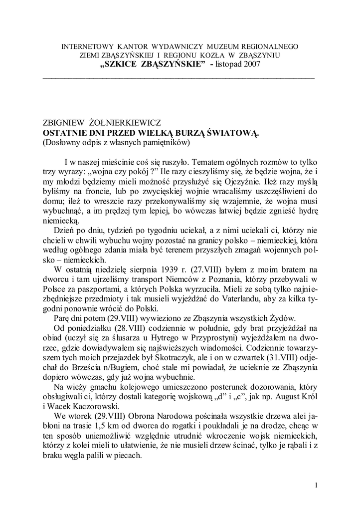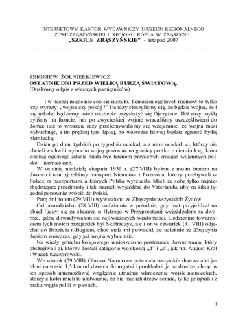 INTERNETOWY KANTOR WYDAWNICZY MUZEUM REGIONALNEGO ZIEMI ZBĄSZYŃSKIEJ I REGIONU KOZŁA W ZBĄSZYNIU „SZKICE ZBĄSZYŃSKIE” - listopad 2007 ________________________________________________________________ ZBIGNIEW ŻOŁNIERKIEWICZ OSTATNIE DNI PRZED WIELKĄ BURZĄ ŚWIATOWĄ. (Dosłowny odpis z własnych pamiętników) I w naszej mieścinie coś się ruszyło. Tematem ogólnych rozmów to tylko trzy wyrazy: „wojna czy pokój ?” Ile razy cieszyliśmy się, że będzie wojna, że i my młodzi będziemy mieli możność przysłużyć się Ojczyźnie. Ileż razy myślą byliśmy na froncie, lub po zwycięskiej wojnie wracaliśmy uszczęśliwieni do domu; ileż to wreszcie razy przekonywaliśmy się wzajemnie, że wojna musi wybuchnąć, a im prędzej tym lepiej, bo wówczas łatwiej będzie zgnieść hydrę niemiecką. Dzień po dniu, tydzień po tygodniu uciekał, a z nimi uciekali ci, którzy nie chcieli w chwili wybuchu wojny pozostać na granicy polsko – niemieckiej, która według ogólnego zdania miała być terenem przyszłych zmagań wojennych polsko – niemieckich. W ostatnią niedzielę sierpnia 1939 r. (27.VIII) byłem z moim bratem na dworcu i tam ujrzeliśmy transport Niemców z Poznania, którzy przebywali w Polsce za paszportami, a których Polska wyrzuciła. Mieli ze sobą tylko najniezbędniejsze przedmioty i tak musieli wyjeżdżać do Vaterlandu, aby za kilka tygodni ponownie wrócić do Polski. Parę dni potem (29.VIII) wywieziono ze Zbąszynia wszystkich Żydów. Od poniedziałku (28.VIII) codziennie w południe, gdy brat przyjeżdżał na obiad (uczył się za ślusarza u Hytrego w Przyprostyni) wyjeżdżałem na dworzec, gdzie dowiadywałem się najświeższych wiadomości. Codziennie towarzyszem tych moich przejazdek był Skotraczyk, ale i on w czwartek (31.VIII) odjechał do Brześcia n/Bugiem, choć stale mi powiadał, że ucieknie ze Zbąszynia dopiero wówczas, gdy już wojna wybuchnie. Na wieży gmachu kolejowego umieszczono posterunek dozorowania, który obsługiwali ci, którzy dostali kategorię wojskową „d” i „c”, jak np. August Król i Wacek Kaczorowski. We wtorek (29.VIII) Obrona Narodowa pościnała wszystkie drzewa alei jabłoni na trasie 1,5 km od dworca do rogatki i poukładali je na drodze, chcąc w ten sposób uniemożliwić względnie utrudnić wkroczenie wojsk niemieckich, którzy z kolei mieli to ułatwienie, że nie musieli drzew ścinać, tylko je rąbali i z braku węgla palili w piecach. 1 Codziennie obserwowałem przez lornetkę samoloty niemieckie, które naruszały terytorium Polski i okrążywszy parę razy Zbąszyń wracały do Niemiec. 29 i 30 sierpnia 1939 r. uszczelniałem z p. Kossowskim (ojciec artysty – śpiewaka operowego, zamieszkałego obecnie w Warszawie) piwnice w naszym budynku, zmieniając jedną z nich na schron. Wnęki okien wyłożyliśmy olbrzymimi kamieniami, a pomiędzy nie sypaliśmy piasek. Wszystkie szpary w ścianach i przy drzwiach wiodących do pralni uszczelnialiśmy gliną. Drzwi od pralni, z której wchodziło się do piwnicy, zamienionej na schron, oblepiłem z ob ydwu stron papierem i obiłem od wewnątrz kołdrą. W przedsionku wiodącym z podwórza do pralni (na schodach) umocowaliśmy zasłony, które nie miały wpuszczać do środka gazu. Pan Kossowski zamurował okna łączące pralnię z piwnicami od wina. Do właściwego schronu szło się dopiero z pralni. Drzwi uszczelnialiśmy miechami (workami) jutowymi, a na szyby naklejaliśmy paski papieru, chcąc uodpornić je na wstrząsy powstające przy eksplozji bomb. W samym schronie zostawiliśmy rozrobioną glinę do uszczelniania drzwi od wewnątrz po ich zamknięciu, oraz młot ciężki i tyczkę żelazną (kilof), które miały służyć do przebicia ściany w razie zarwania się pralni i niemożliwości przedostania się na zewnątrz. Schron nasz zbudowaliśmy w piwnicy najwęższej i położonej bezpośrednio przy murze bocznym naszego budynku i poczty. Szerokość schronu wynosiła ok. 2 metry, długość 5 metrów i wysokość ok.. 2 metrów. Na koniec umieściliśmy w nim ławkę długą, 2 lampy naftowe z zapasem nafty, marynaty i różne zaprawy p. Kossowskiego. Gdy ja z p. Kossowskim zamieniałem piwnicę na schron mama uszyła dla nas tampony (w zastępstwie masek gazowych) a Edziu Kossowski robił dla nas wszystkich maski z dętek samochodowych i przyszykował w schronie różne chemikalia potrzebne do rozpoznawania gazów i różne środki odkażające. Z 30/31.VIII 1939 r. około godziny 2.00 w nocy mama zbudziła nas i powiedziała, że mamy wstać i pochować niektóre rzeczy. Wzięliśmy się do pracy i w krótkim czasie wszystkie pierzyny, bieliznę, garnki aluminiowe, moje skrzypce i inne wartościowe drobiazgi schowaliśmy w skrytce w jadalni (pod schodami wiodącymi do mieszkania Bąkowskich na I piętrze). Drzwi tej skrytki przystawiliśmy szafą, która stała w składzie. Srebrne sztućce – 12 osobowe , albumy oraz nowe powłoki i prześcieradła schowaliśmy do szafki pancernej wmurowanej w ścianę za bufetem, normalnie niewidocznej. Następnego dnia, tj. 31 sierpnia wieczorem p. Bąkowski wyjechał do Poznania, gdzie uprzednio udała się jego żona i dzieci. Przed odjazdem przyszedł nam powiedzieć, że jutro rano przyjedzie z powrotem. Mama jakby coś przeczuwała i powiedziała mu, że jutro on już nie przyjedzie. On się z tego śmiał, lecz jak się później okazało, mama miała rację. Ok. godziny 22.00 przejeżdżały koło nas ciężkie fury (wozy konne), które wywoziły rodziny urzędnicze ze Zbąszynia do Opalenicy, a stąd pociągami wywożono je do różnych miejscowości położonych nad granicą rosyjską. Całą go2 dzinę rozmawialiśmy z panią Raczkowską, która również czekała na wóz, aby wśród burzy i deszczu dojechać do Opalenicy. I Raczkowska z całym swym dobytkiem i dziećmi (2 synów mieszka jeszcze w Zbąszyniu) wyruszyła do Opalenicy. O godz. 2.00 w nocy (tzn. ju