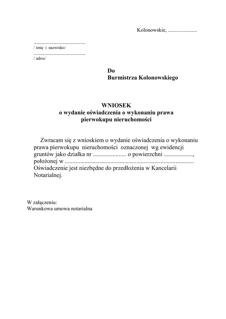 Kolonowskie, ...................... ....................................... / imię i nazwisko/ ....................................... / adres/ Do Burmistrza Kolonowskiego WNIOSEK o wydanie oświadczenia o wykonaniu prawa pierwokupu nieruchomości Zwracam się z wnioskiem o wydanie oświadczenia o wykonaniu prawa pierwokupu nieruchomości oznaczonej wg ewidencji gruntów jako działka nr ...................... o powierzchni ..................., położonej w ..................................................................................... Oświadczenie jest niezbędne do przedłożenia w Kancelarii Notarialnej. W załączeniu: Warunkowa umowa notarialna