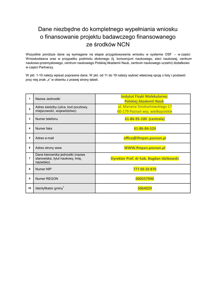 Dane niezbędne do kompletnego wypełniania wniosku o finansowanie projektu badawczego finansowanego ze środków NCN Wszystkie poniższe dane są wymagane na etapie przygotowywania wniosku w systemie OSF – w części Wnioskodawca oraz w przypadku podmiotu złożonego (tj. konsorcjum naukowego, sieci naukowej, centrum naukowo-przemysłowego, centrum naukowego Polskiej Akademii Nauk, centrum naukowego uczelni) dodatkowo w części Partnerzy. W pkt. 1-10 należy wpisać poprawne dane. W pkt. od 11 do 19 należy wybrać właściwą opcję z listy i postawić przy niej znak „x” w okienku z prawej strony tabeli. Instytut Fizyki Molekularnej Polskiej Akademii Nauk ul. Mariana Smoluchowskiego 17 60-179 Poznań woj. wielkopolskie 1 Nazwa Jednostki 2 Adres siedziby (ulica, kod pocztowy, miejscowość, województwo) 3 Numer telefonu 4 Numer faks 61-86-84-524 5 Adres e-mail [email protected] 6 Adres strony www WWW.ifmpan.poznan.pl 7 Dane kierownika jednostki (nazwa stanowiska, tytuł naukowy, imię, nazwisko) 8 Numer NIP 9 Numer REGON 10 Identyfikator gminy 61-86-95-100 (centrala) Dyrektor Prof. dr hab. Bogdan Idzikowski 777 00 20 870 000557990 1 3064029 Uczelnia wyższa Podstawowa jednostka organizacyjna uczelni Jednostka organizacyjna uczelni niebędąca podstawową jednostką organizacyjną Jednostka naukowa Polskiej Akademii Nauk 11 X Instytut badawczy, za wyjątkiem instytutów włączonych do uczelni Międzynarodowy instytut naukowy działający na terytorium Rzeczypospolitej Polskiej Status organizacyjny Polska Akademia Umiejętności Fundacja Stowarzyszenie Inne uprawnione do wnioskowania na podstawie ustawy z dnia 30 kwietnia 2010 r.o zasadach finansowania nauki (Dz.U. Nr 96, poz. 615 z późn. zm.) Przedsiębiorstwo Uczelnia nadzorowana przez MNiSW Uczelnia wojskowa 2 12 Podmiot sprawujący nadzór : Podział ze względu na podmiot sprawujący nadzór zgodnie z Art. 2 i 3 Ustawy z dnia 27 lipca 2005 r. Prawo o szkolnictwie wyższym (Dz. U. Nr 164, poz. 1365, z późn. zm.) Uczelnia służb państwowych Uczelnia artystyczna Uczelnia medyczna Uczelnia morska Szkoła wyższa lub wyższe seminarium duchowne prowadzone przez kościół lub związek wyznaniowy Nie dotyczy X AUU - uniwersytet AUT – uniwersytet techniczny AUPR – uniwersytet o profilu rolniczym 13 Uprawnienia do nadawania stopni 2 naukowych oraz profil działalności : Podział ze względu na uprawnienia do nadawania stopni naukowych oraz profil działalności, zgodnie z Art. 2 i 3 Ustawy z dnia 27 lipca 2005 r. Prawo o szkolnictwie wyższym (Dz. U. Nr 164, poz. 1365, z późn. zm.). AUPE – uniwersytet o profilu ekonomicznym AUPP – uniwersytet o profilu pedagogicznym AUPI – uniwersytet o innym profilu AP - politechnika AA - akademia AS – szkoła wyższa posiadająca uprawnienia do nadawania stopnia naukowego doktora w jednej dyscyplinie ZZ – uczelnia zawodowa 14 15 16 17 Czy jednostka otrzymuje dotację na działalność statutową z budżetu nauki? Nie dotyczy X Tak X Nie Czy podmiot stanowi jednostkę zaliczaną do sektora finansów publicznych? Tak Czy Podmiot prowadzi działalność gospodarczą w rozumieniu unijnego prawa konkurencji (np. świadczy usługi 3 lub oferuje towary na rynku) ? Tak Czy w przypadku prowadzenia działalności gospodarczej i niegospodarczej można rozdzielić oba rodzaje działalności, ich koszty i finansowanie? (Dowodami na to, że koszty zostały przypisane właściwie, mogą być sprawozdania finansowe 3 uczelni i organizacji badawczych.) X Nie X Nie Tak Nie Nie dotyczy X Przedsiębiorstwo państwowe Jednoosobowa spółka Skarbu Państwa 18 Forma prawna Jednoosobowa spółka jednostki samorządu terytorialnego, w rozumieniu ustawy z dnia 20 grudnia 1996 r. o gospodarce komunalnej (Dz. U. z 1997 r. Nr 9, poz. 43, z późn. zm.) Spółka akcyjna lub spółka z ograniczoną odpowiedzialnością, w stosunku do których Skarb Państwa, jednostka samorządu terytorialnego, przedsiębiorstwo państwowe lub jednoosobowa spółka Skarbu Państwa są podmiotami, które posiadają uprawnienia takie jak przedsiębiorcy dominujący w rozumieniu przepisów ustawy z dnia 16 lutego 2007 r. o ochronie konkurencji i konsumentów (Dz. U. Nr 50, poz. 331, z późn. zm.) Jednostka sektora finansów publicznych w rozumieniu przepisów ustawy z dnia 27 sierpnia 2009 r. o finansach publicznych (Dz. U. Nr 157, poz. 1240, z późn. zm.) Inna forma prawna X Mikro Małe 19 Wielkość przedsiębiorstwa Średnie Duże (inne) Nie dotyczy X Nazwa banku, numer rachunku: Bank Gospodarstwa Krajowego 26 1130 1088 0001 3145 4420 0022 1 Zgodnie z Wykazem identyfikatorów i nazw jednostek podziału terytorialnego kraju dostępnym pod adresem: http://www.stat.gov.pl/cps/rde/xbcr/bip/BIP_oz_wykaz_identyfikatorow.pdf. 2 Dotyczy podmiotów o statusie organizacyjnym uczelni wyższej, podstawowej jednostki organizacyjnej uczelni, jednostki organizacyjnej uczelni niebędącej podstawową jednostką organizacyjną. W przypadku pozostałych podmiotów z listy rozwijalnej należy wybrać opcję „nie dotyczy” 3 W celu udzielenia prawidłowej odpowiedzi na pytanie prosimy zapoznać się z informacjami zawartymi w sekcji Pomoc Publiczna na stronie http://www.ncn.gov.pl/finansowanie-nauki/pomoc-publiczna.