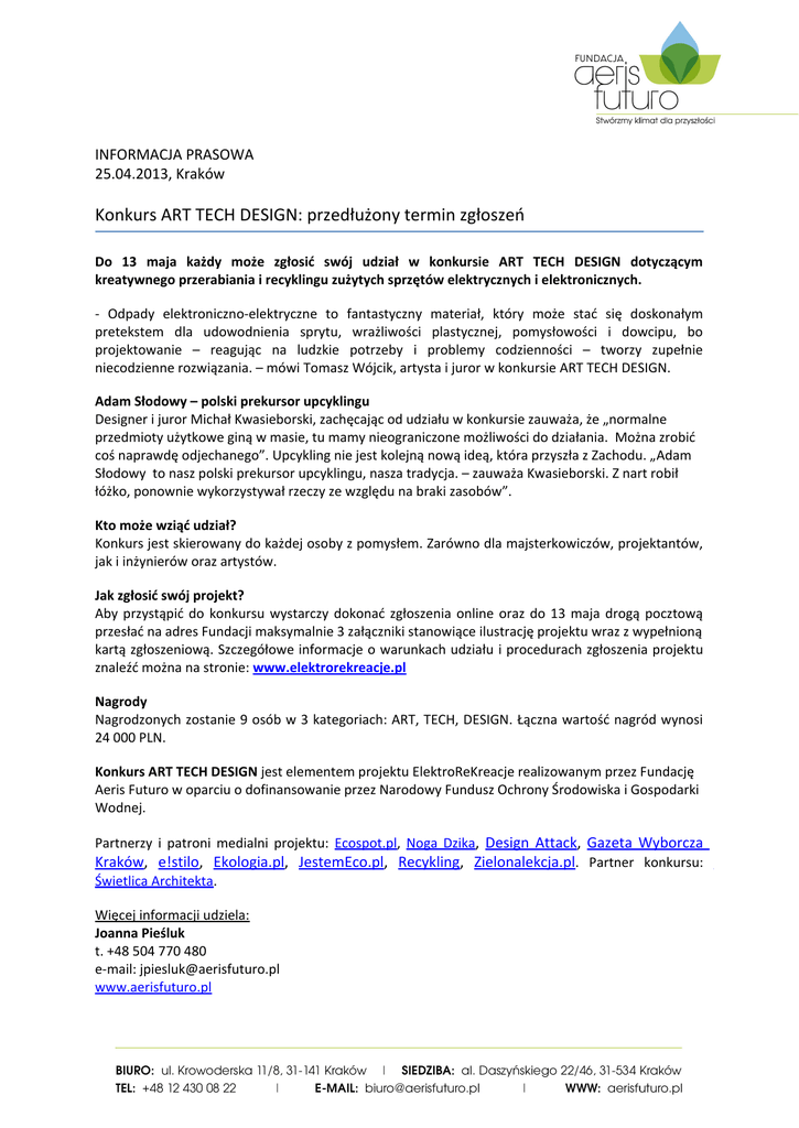 INFORMACJA PRASOWA 25.04.2013, Kraków Konkurs ART TECH DESIGN: przedłużony termin zgłoszeń Do 13 maja każdy może zgłosić swój udział w konkursie ART TECH DESIGN dotyczącym kreatywnego przerabiania i recyklingu zużytych sprzętów elektrycznych i elektronicznych. - Odpady elektroniczno-elektryczne to fantastyczny materiał, który może stać się doskonałym pretekstem dla udowodnienia sprytu, wrażliwości plastycznej, pomysłowości i dowcipu, bo projektowanie – reagując na ludzkie potrzeby i problemy codzienności – tworzy zupełnie niecodzienne rozwiązania. – mówi Tomasz Wójcik, artysta i juror w konkursie ART TECH DESIGN. Adam Słodowy – polski prekursor upcyklingu Designer i juror Michał Kwasieborski, zachęcając od udziału w konkursie zauważa, że „normalne przedmioty użytkowe giną w masie, tu mamy nieograniczone możliwości do działania. Można zrobić coś naprawdę odjechanego”. Upcykling nie jest kolejną nową ideą, która przyszła z Zachodu. „Adam Słodowy to nasz polski prekursor upcyklingu, nasza tradycja. – zauważa Kwasieborski. Z nart robił łóżko, ponownie wykorzystywał rzeczy ze względu na braki zasobów”. Kto może wziąć udział? Konkurs jest skierowany do każdej osoby z pomysłem. Zarówno dla majsterkowiczów, projektantów, jak i inżynierów oraz artystów. Jak zgłosić swój projekt? Aby przystąpić do konkursu wystarczy dokonać zgłoszenia online oraz do 13 maja drogą pocztową przesłać na adres Fundacji maksymalnie 3 załączniki stanowiące ilustrację projektu wraz z wypełnioną kartą zgłoszeniową. Szczegółowe informacje o warunkach udziału i procedurach zgłoszenia projektu znaleźć można na stronie: www.elektrorekreacje.pl Nagrody Nagrodzonych zostanie 9 osób w 3 kategoriach: ART, TECH, DESIGN. Łączna wartość nagród wynosi 24 000 PLN. Konkurs ART TECH DESIGN jest elementem projektu ElektroReKreacje realizowanym przez Fundację Aeris Futuro w oparciu o dofinansowanie przez Narodowy Fundusz Ochrony Środowiska i Gospodarki Wodnej. Partnerzy i patroni medialni projektu: Ecospot.pl, Noga Dzika, Design Attack, Gazeta Wyborcza Kraków, e!stilo, Ekologia.pl, JestemEco.pl, Recykling, Zielonalekcja.pl. Partner konkursu: Świetlica Architekta. Więcej informacji udziela: Joanna Pieśluk t. +48 504 770 480 e-mail: [email protected] www.aerisfuturo.pl *** Fundacja AERIS FUTURO działa zgodnie z przyjętym mottem „Stwórzmy klimat dla przyszłości!”. Misją Fundacji jest skuteczne przeciwdziałanie globalnym zmianom klimatu, ochrona i zwiększanie różnorodności biologicznej oraz krajobrazowej, wspieranie rozwoju społeczności lokalnych oraz edukowanie i promowanie odpowiedzialnego biznesu. Fundacja stworzyła pierwszy w Polsce KALKULATOR CO2 umożliwiający szacowanie śladu klimatycznego, ograniczanie i neutralizowanie tego śladu poprzez sadzenie drzew w ramach programu CZAS NA LAS. Fundacja stworzyła ponadto pierwszy w Polsce standard organizacji Zielonych Wydarzeń inspirowany brytyjską normą BS8901. Fundacja AERIS FUTURO jest członkiem Klubu Przyjaciół Polskiej Prezydencji w Radzie UE i Koalicji Klimatycznej. Więcej informacji na: www.aerisfuturo.pl ElektroReKreacje to projekt mający na celu promowanie ekologicznego podejścia do przetwarzania zużytego sprzętu elektrycznego i elektronicznego (ZSEE) w zgodzie z zasadą 3R – reduce, reuse, recycle. Idea kreatywnego przetwarzania i recyklingu ZSEE będzie przewodnim tematem trzech tegorocznych edycji Festiwalu ReKreacje odbywających się w Krakowie, Poznaniu i w Warszawie oraz ogólnopolskiego Konkursu ART TECH DESIGN. Projekt jest realizowany w oparciu o dofinansowanie z Narodowego Funduszu Ochrony Środowiska i Gospodarki Wodnej.