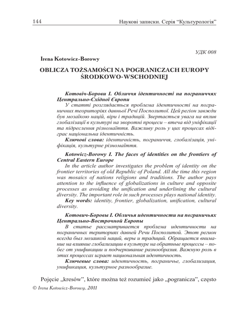 Наукові записки. Серія “Культурологія” 144 Irena Kotowicz-Borowy УДК 008 Оblicza tożsamości na pograniczach Europy Środkowo-wschodniej Котовіч-Борови І. Обличчя ідентичності на пограниччях Центрально-Східної Європи У статті розглядається проблема ідентичності на пограничних теориторіях давньої Речі Посполитої. Цей регіон завжди був мозаїкою націй, віри і традицій. Звертається увага на вплив глобалізації в культурі на зворотні процеси – втеча від уніфікації та підреслення різномаїття. Важливу роль у цих процесах відіграє національна ідентичність. Ключові слова: ідентичність, пограниччя, глобалізація, уніфікація, культурне різномаїття. Kotowicz-Borowy І. The faces of identities on the frontiers of Central Eastern Europe In the article author investigates the problem of identity on the frontier territories of old Republic of Poland. All the time this region was mosaics of nations religions and traditions. The author pays attention to the influence of globalizations in culture and opposite processes as avoiding the unification and underlining the cultural diversity. The important role in such processes plays national identity. Key words: identity, frontier, globalization, unification, cultural diversity. Котович-Боровы І. Обличья идентичности на пограничьях Центрально-Вострочной Европы В статье рассматривается проблема идентичности на пограничных териториях давней Речи Посполитой. Этот регион всегда был мозаикой наций, веры и традиций. Обращается внимание на влияние глобализации в культуре на обратные процессы – побег от унификации и подчеркивание разнообразия. Важную роль в этих процессах играет национальная идентичность. Ключевые слова: идентичность, пограничье, глобализация, унификация, культурное разнообразие. Pojęcie „kresów”, które można też rozumieć jako „pogranicza”, często © Irena Kotowicz-Borowy, 2011 Випуск 7. 145 utożsamiane jest z terenem dawnych wschodnich i południowowschodnich rubieży Rzeczypospolitej . Jest to termin określający ekosystem społeczny posiadający specyficzne cechy geograficzno-polityczno– kulturowe, stanowiące konsekwencję historycznych uwarunkowań związanych z dziejami Rzeczypospolitej. Dzięki królowi Władysławowi Jagielle i kolejnym potomkom dynastii Jagiellonów ,nastąpiło połączenie państwa Polskiego z Wielkim Księstwem Litewskim. Kresy objęły wówczas tereny położone na wschód od ekumeny. Po przyłączeniu Inflant w 1561r i całej ściany wschodniej po Unii Lubelskiej w 1569,zajmowały obszar od Inflant po Bezarabię, sięgając rzek: Dniestru, Bugu, Dniepru i Dżwiny1. Na Kresach obok grup o w pełni wykrystalizowanej tożsamości narodowej mogą istnieć i takie, w obrębie których świadomość odrębności narodowej, a nawet tylko etnicznej, jest nikła.Za zasadniczy czynnik identyfikacji przynależności kulturowej na tych terenach, uznać można religię, obyczaj, rodzinność oraz przestrzeń, stanowiące habitat.2 Współcześnie Kresy rozumiane jako pogranicze, traktowane są jako zjawisko dynamiczne w sensie geograficznym i socjo etnologicznym. Oznacza to uznanie ich zmienności w przestrzeni, czyli niestałość terytorium, któremu ten walor jest przypisywany, oraz zmienność układu kulturowego i etnicznego w wyniku procesów dyfuzji kulturowej i cywilizacyjnej.3 Przykład mogą stanowić masowe deportacje na Kresach wschodnich dawnej Rzeczypospolitej, związane z II Wojną Światową, stosowane przez okupantów hitlerowskich i radzieckich. Spowodowały one wyrwanie z ojcowizny setek tysięcy ludzi. Najpierw wojna wymagała przemieszczania wielkich armii i tysięcy pracowników cywilnych stanowiących jej zaplecze. Póżniej z kolei setki ludzi uciekało ze swoich niekiedy odwiecznych siedzib ze strachu przed okupacyjnym terrorem. Ostatecznemu zakończeniu II Wojny światowej, towarzyszył nie tylko powrót do domu wielotysięcznych rzesz, ale i nowy etap przemieszczeń podyktowanych politycznymi decyzjami zwycięzców. Polska już w nowych granicach, stała się miejscem wielkich wędrówek 1 M.Koter, Kresy państwowe, – geneza i właściwości [w:]Kresy-pojęcie i rzeczywistość, IS. PAN, Warszawa 1997, s. 21. 2 Habitat(łac. habitat – mieszka, kompleks specyficznych warunków środowiska życia określonych populacji. W szerokim znaczeniu może oznaczać siedlisko. W wąskim – warunki lub miejsce, część biotopu w której osobniki danego gatunku znajdują najodpowiedniejsze warunki życia)(w)S.Ciesielski, Przesiedlenia ludności polskiej z kresów wschodnich do Polski 1944-1947,Nerit on,Warszawa,1999, s. 210-211. 3 S.Ciesielski, Przesiedlenia ludności polskiej z kresów wschodnich do Polski 1944-1947,Neriton,Warszawa 1999, s. 230. 146 Наукові записки. Серія “Культурологія” Polaków, Niemców, Żydów, Ukraińców, Białorusinów, a w mniejszej liczbie także przedstawicieli innych narodowości.27 lipca 1944 roku Polski Komitet Wyzwolenia Narodowego pod dyktando Moskwy, zawarł z rządem ZSRR układ o polsko-radzieckiej granicy państwowej,
