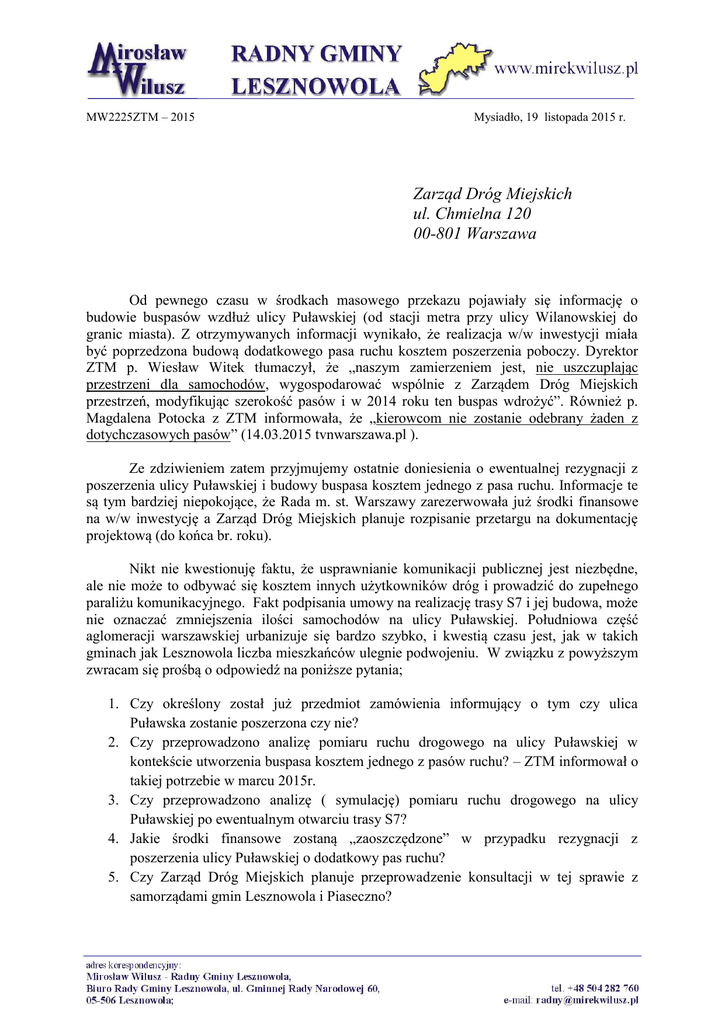 MW2225ZTM – 2015 Mysiadło, 19 listopada 2015 r. Zarząd Dróg Miejskich ul. Chmielna 120 00-801 Warszawa Od pewnego czasu w środkach masowego przekazu pojawiały się informację o budowie buspasów wzdłuż ulicy Puławskiej (od stacji metra przy ulicy Wilanowskiej do granic miasta). Z otrzymywanych informacji wynikało, że realizacja w/w inwestycji miała być poprzedzona budową dodatkowego pasa ruchu kosztem poszerzenia poboczy. Dyrektor ZTM p. Wiesław Witek tłumaczył, że „naszym zamierzeniem jest, nie uszczuplając przestrzeni dla samochodów, wygospodarować wspólnie z Zarządem Dróg Miejskich przestrzeń, modyfikując szerokość pasów i w 2014 roku ten buspas wdrożyć”. Również p. Magdalena Potocka z ZTM informowała, że „kierowcom nie zostanie odebrany żaden z dotychczasowych pasów” (14.03.2015 tvnwarszawa.pl ). Ze zdziwieniem zatem przyjmujemy ostatnie doniesienia o ewentualnej rezygnacji z poszerzenia ulicy Puławskiej i budowy buspasa kosztem jednego z pasa ruchu. Informacje te są tym bardziej niepokojące, że Rada m. st. Warszawy zarezerwowała już środki finansowe na w/w inwestycję a Zarząd Dróg Miejskich planuje rozpisanie przetargu na dokumentację projektową (do końca br. roku). Nikt nie kwestionuję faktu, że usprawnianie komunikacji publicznej jest niezbędne, ale nie może to odbywać się kosztem innych użytkowników dróg i prowadzić do zupełnego paraliżu komunikacyjnego. Fakt podpisania umowy na realizację trasy S7 i jej budowa, może nie oznaczać zmniejszenia ilości samochodów na ulicy Puławskiej. Południowa część aglomeracji warszawskiej urbanizuje się bardzo szybko, i kwestią czasu jest, jak w takich gminach jak Lesznowola liczba mieszkańców ulegnie podwojeniu. W związku z powyższym zwracam się prośbą o odpowiedź na poniższe pytania; 1. Czy określony został już przedmiot zamówienia informujący o tym czy ulica Puławska zostanie poszerzona czy nie? 2. Czy przeprowadzono analizę pomiaru ruchu drogowego na ulicy Puławskiej w kontekście utworzenia buspasa kosztem jednego z pasów ruchu? – ZTM informował o takiej potrzebie w marcu 2015r. 3. Czy przeprowadzono analizę ( symulację) pomiaru ruchu drogowego na ulicy Puławskiej po ewentualnym otwarciu trasy S7? 4. Jakie środki finansowe zostaną „zaoszczędzone” w przypadku rezygnacji z poszerzenia ulicy Puławskiej o dodatkowy pas ruchu? 5. Czy Zarząd Dróg Miejskich planuje przeprowadzenie konsultacji w tej sprawie z samorządami gmin Lesznowola i Piaseczno? W związku z licznymi zapytaniami mieszkańców gminy Lesznowola zwracam się z prośbą o pilną odpowiedź. Do informacji; 1. Wójt Gminy Lesznowola. 2. Przewodnicząca Rady m. st. Warszawy. 3. Przewodniczący Rady Miejskiej w Piasecznie. 4. Starosta Piaseczyński. Z wyrazami szacunku Radny Gminy Lesznowola