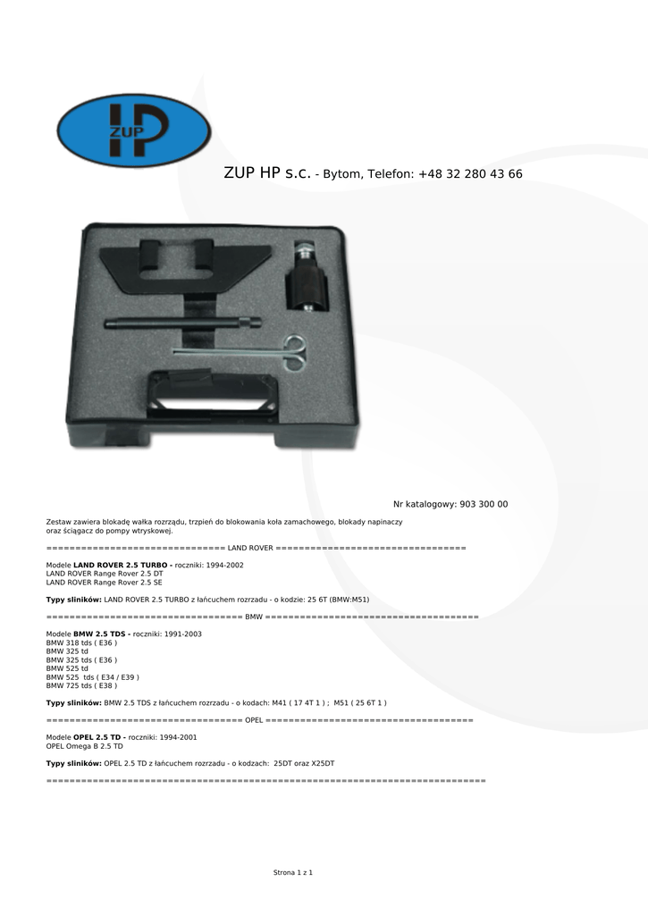 ZUP HP s.c. - Bytom, Telefon: +48 32 280 43 66 Nr katalogowy: 903 300 00 Zestaw zawiera blokadę wałka rozrządu, trzpień do blokowania koła zamachowego, blokady napinaczy oraz ściągacz do pompy wtryskowej. =============================== LAND ROVER ================================= Modele LAND ROVER 2.5 TURBO - roczniki: 1994-2002 LAND ROVER Range Rover 2.5 DT LAND ROVER Range Rover 2.5 SE Typy sliników: LAND ROVER 2.5 TURBO z łańcuchem rozrzadu - o kodzie: 25 6T (BMW:M51) ================================== BMW ===================================== Modele BMW 2.5 TDS - roczniki: 1991-2003 BMW 318 tds ( E36 ) BMW 325 td BMW 325 tds ( E36 ) BMW 525 td BMW 525 tds ( E34 / E39 ) BMW 725 tds ( E38 ) Typy sliników: BMW 2.5 TDS z łańcuchem rozrzadu - o kodach: M41 ( 17 4T 1 ) ; M51 ( 25 6T 1 ) ================================== OPEL ==================================== Modele OPEL 2.5 TD - roczniki: 1994-2001 OPEL Omega B 2.5 TD Typy sliników: OPEL 2.5 TD z łańcuchem rozrzadu - o kodzach: 25DT oraz X25DT ============================================================================ Strona 1 z 1