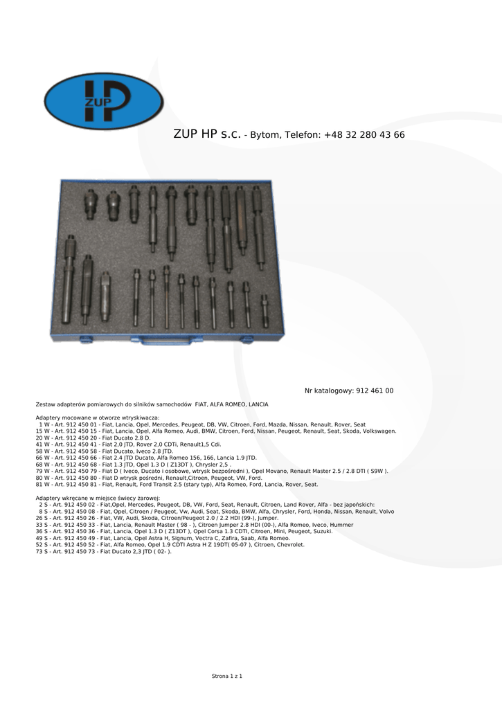 ZUP HP s.c. - Bytom, Telefon: +48 32 280 43 66 Nr katalogowy: 912 461 00 Zestaw adapterów pomiarowych do silników samochodów FIAT, ALFA ROMEO, LANCIA Adaptery mocowane w otworze wtryskiwacza: 1 W - Art. 912 450 01 - Fiat, Lancia, Opel, Mercedes, Peugeot, DB, VW, Citroen, Ford, Mazda, Nissan, Renault, Rover, Seat 15 W - Art. 912 450 15 - Fiat, Lancia, Opel, Alfa Romeo, Audi, BMW, Citroen, Ford, Nissan, Peugeot, Renault, Seat, Skoda, Volkswagen. 20 W - Art. 912 450 20 - Fiat Ducato 2.8 D. 41 W - Art. 912 450 41 - Fiat 2,0 JTD, Rover 2,0 CDTi, Renault1,5 Cdi. 58 W - Art. 912 450 58 - Fiat Ducato, Iveco 2.8 JTD. 66 W - Art. 912 450 66 - Fiat 2.4 JTD Ducato, Alfa Romeo 156, 166, Lancia 1.9 JTD. 68 W - Art. 912 450 68 - Fiat 1.3 JTD, Opel 1.3 D ( Z13DT ), Chrysler 2,5 . 79 W - Art. 912 450 79 - Fiat D ( Iveco, Ducato i osobowe, wtrysk bezpośredni ), Opel Movano, Renault Master 2.5 / 2.8 DTI ( S9W ). 80 W - Art. 912 450 80 - Fiat D wtrysk pośredni, Renault,Citroen, Peugeot, VW, Ford. 81 W - Art. 912 450 81 - Fiat, Renault, Ford Transit 2.5 (stary typ), Alfa Romeo, Ford, Lancia, Rover, Seat. Adaptery wkręcane w miejsce świecy żarowej: 2 S - Art. 912 450 02 - Fiat,Opel, Mercedes, Peugeot, DB, VW, Ford, Seat, Renault, Citroen, Land Rover, Alfa - bez japońskich: 8 S - Art. 912 450 08 - Fiat, Opel, Citroen / Peugeot, Vw, Audi, Seat, Skoda, BMW, Alfa, Chrysler, Ford, Honda, Nissan, Renault, Volvo 26 S - Art. 912 450 26 - Fiat, VW, Audi, Skoda, Citroen/Peugeot 2.0 / 2.2 HDI (99-), Jumper. 33 S - Art. 912 450 33 - Fiat, Lancia, Renault Master ( 98 - ), Citroen Jumper 2.8 HDI (00-), Alfa Romeo, Iveco, Hummer 36 S - Art. 912 450 36 - Fiat, Lancia, Opel 1.3 D ( Z13DT ), Opel Corsa 1.3 CDTI, Citroen, Mini, Peugeot, Suzuki. 49 S - Art. 912 450 49 - Fiat, Lancia, Opel Astra H, Signum, Vectra C, Zafira, Saab, Alfa Romeo. 52 S - Art. 912 450 52 - Fiat, Alfa Romeo, Opel 1.9 CDTI Astra H Z 19DT( 05-07 ), Citroen, Chevrolet. 73 S - Art. 912 450 73 - Fiat Ducato 2,3 JTD ( 02- ). Strona 1 z 1