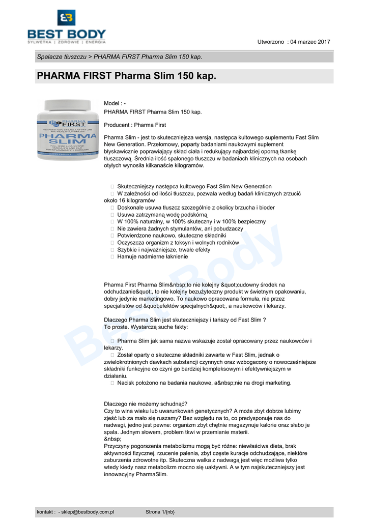 Utworzono : 04 marzec 2017 Spalacze tłuszczu > PHARMA FIRST Pharma Slim 150 kap. PHARMA FIRST Pharma Slim 150 kap. Model : PHARMA FIRST Pharma Slim 150 kap. Producent : Pharma First Pharma Slim - jest to skuteczniejsza wersja, następca kultowego suplementu Fast Slim New Generation. Przełomowy, poparty badaniami naukowymi suplement błyskawicznie poprawiający skład ciała i redukujący najbardziej oporną tkankę tłuszczową. Średnia ilość spalonego tłuszczu w badaniach klinicznych na osobach otyłych wynosiła kilkanaście kilogramów. � Skuteczniejszy następca kultowego Fast Slim New Generation � W zależności od ilości tłuszczu, pozwala według badań klinicznych zrzucić około 16 kilogramów � Doskonale usuwa tłuszcz szczególnie z okolicy brzucha i bioder � Usuwa zatrzymaną wodę podskórną � W 100% naturalny, w 100% skuteczny i w 100% bezpieczny � Nie zawiera żadnych stymulantów, ani pobudzaczy � Potwierdzone naukowo, skuteczne składniki � Oczyszcza organizm z toksyn i wolnych rodników � Szybkie i najważniejsze, trwałe efekty � Hamuje nadmierne łaknienie t s e B y d o B Pharma First Pharma Slim to nie kolejny "cudowny środek na odchudzanie", to nie kolejny bezużyteczny produkt w świetnym opakowaniu, dobry jedynie marketingowo. To naukowo opracowana formuła, nie przez specjalistów od "efektów specjalnych", a naukowców i lekarzy. Dlaczego Pharma Slim jest skuteczniejszy i tańszy od Fast Slim ? To proste. Wystarczą suche fakty: � Pharma Slim jak sama nazwa wskazuje został opracowany przez naukowców i lekarzy. � Został oparty o skuteczne składniki zawarte w Fast Slim, jednak o zwielokrotnionych dawkach substancji czynnych oraz wzbogacony o nowocześniejsze składniki funkcyjne co czyni go bardziej kompleksowym i efektywniejszym w działaniu. � Nacisk położono na badania naukowe, a nie na drogi marketing. Dlaczego nie możemy schudnąć? Czy to wina wieku lub uwarunkowań genetycznych? A może zbyt dobrze lubimy zjeść lub za mało się ruszamy? Bez względu na to, co predysponuje nas do nadwagi, jedno jest pewne: organizm zbyt chętnie magazynuje kalorie oraz słabo je spala. Jednym słowem, problem tkwi w przemianie materii. Przyczyny pogorszenia metabolizmu mogą być różne: niewłaściwa dieta, brak aktywności fizycznej, rzucenie palenia, zbyt częste kuracje odchudzające, niektóre zaburzenia zdrowotne itp. Skuteczna walka z nadwagą jest więc możliwa tylko wtedy kiedy nasz metabolizm mocno się uaktywni. A w tym najskuteczniejszy jest innowacyjny PharmaSlim. kontakt : - [email protected] Strona 1/{nb} Utworzono : 04 marzec 2017 Spalacze tłuszczu > PHARMA FIRST Pharma Slim 150 kap. PHARMA FIRST Pharma Slim 150 kap. y d Jak dużo schudnę po kuracji Pharma First Pharma Slim ? To jak dużo schudniesz zależy od Twojego indywidualnego pobudzenia metabolicznego jakie zajdzie w Twoim organizmie po zażywaniu Pharma Slim oraz tego ile faktycznie posiadasz tłuszczu. Stosując Pharma Slim według ścisłych procedur zamieszczonych na opakowaniu efekt działania preparatu w badaniach przeprowadzonych na otyłych osobach wynosił średnio 16 kilogramów w przeciągu kilku tygodni! t s e B o B Jak zmaksymalizować efekt odchudzający? Stosować dietę "pół na pół". Dieta polega na obniżeniu ilości jedzenia o połowę. Osoby stosujące dietę jedzą wszystko, tak jak zawsze, lecz o połowe mniej. Składniki aktywne: Ilość w Pharma Slim Fish Oil Powder: 1 000 mg - w tym: EPA (Eicosapentaenoic Acid) 54 mg - w tym: DHA (Docosahexaenoic Acid) 36 mg L-tartrate l-carnitine kontakt : - [email protected] Strona 2/{nb} Utworzono : 04 marzec 2017 Spalacze tłuszczu > PHARMA FIRST Pharma Slim 150 kap. PHARMA FIRST Pharma Slim 150 kap. 1 000 mg Conjugated Linoleic Acid 500 mg Curcuma Longa extract (95% Curcuminoids) 500 mg BioPerine® 15 mg y d Wielkość porcji: 5 kap. Ilość porcji w opakowaniu: 30 o B Dawkowanie i sposób użycia: stosować 5 kap. Pharma Slim przed śniadaniem oraz 5 kap. przed aktywnością fizyczną lub obiadem. t s e B Opis produktu zgodny z najnowszymi przepisami GIS'u. UWAGA - kopiowanie oraz rozpowrzechnianie opisów jest zabronione przez BEST BODY © 2010. Ustawa z dnia 4 lutego 1994 r. o prawie autorskim i prawach pokrewnych (Dz. U. z 2006 r. Nr 90, poz. 631 z późn. zm.). Ochrona autorskich praw osobistych: Twórca, którego autorskie prawa osobiste zostały zagrożone cudzym działaniem, może żądać zaniechania tego działania. W razie dokonanego naruszenia może także żądać, aby osoba, która dopuściła się naruszenia, dopełniła czynności potrzebnych do usunięcia jego skutków, w szczególności, aby złożyła publiczne oświadczenie o odpowiedniej treści i formie. Jeżeli naruszenie było zawinione, sąd może przyznać twórcy odpowiednią sumę pieniężną tytułem zadośćuczynienia za doznaną krzywdę albo - na żądanie twórcy - zobowiązać sprawcę, aby uiścił odpowiednią sumę pieniężną na wskazany przez twórcę cel społeczny. Cena : 119,00 zł Brutto ( 111,22 zł Netto) Dostępność: Produkt dostępny w naszym sklepie od 22 czerwiec 2012 kontakt : - [email protected] Strona 3/{nb}