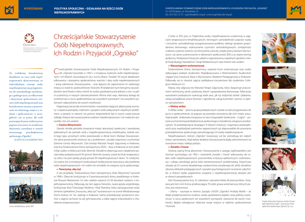 WYRÓŻNIENIE POLITYKA SPOŁECZNA – DZIAŁANIA NA RZECZ OSÓB NIEPEŁNOSPRAWNYCH Chrześcijańskie Stowarzyszenie Osób Niepełnosprawnych, Ich Rodzin i Przyjaciół „Ognisko” Za wieloletnią, konsekwentną działalność na rzecz osób niepełnosprawnych skoncentrowaną na indywidualnym rozwoju osoby niepełnosprawnej i jej przygotowaniu do samodzielnego niezależnego, i godnego życia; za odkrywanie i ukazywanie społeczeństwu wartości osób niepełnosprawnych oraz konsekwentne starania o przywrócenie im właściwego miejsca w rodzinie i społeczeństwie; w szczególności zaś za pomoc dla osób pozostających poza rynkiem pracy poprzez stwarzanie im możliwości aktywności zawodowej w ramach utworzonego przedsiębiorstwa społecznego „Ognisko”. KAPITUŁA NAGRODY 2007 C hrześcijańskie Stowarzyszenie Osób Niepełnosprawnych, Ich Rodzin i Przyjaciół „Ognisko” powstało w 1992 r. z inicjatywy rodziców osób niepełnosprawnych i ich bliskich wywodzących się z ruchu „Wiara i Światło”. W swych działaniach odkrywamy i ukazujemy społeczeństwu wartości i dary osób niepełnosprawnych – piszą członkowie Stowarzyszenia – oraz dążymy do zapewnienia im należnego miejsca w rodzinie, społeczeństwie i Kościele. W działaniach tych kierujemy się przesłaniem Jana Pawła II, który mówił, że osoba upośledzona jest jednym z nas i w pełni uczestniczy w naszym człowieczeństwie. Winna mieć więc ułatwiony dostęp do uczestnictwa w życiu społeczeństwa we wszystkich wymiarach i na wszystkich poziomach odpowiednio do swoich możliwości. Organizacja zaczynała od seminariów i warsztatów dających płaszczyznę wymiany i wsparcia pomiędzy rodzinami i grupami osób połączonych wspólnym problemem, a zawarty w statucie cel „pomoc bezpośrednia” był w owym czasie jeszcze odległy. Kolejne lata towarzyszenia osobom niepełnosprawnym i ich rodzinom pozwoliły i ten cel urealnić. •• Centra Aktywności Zawsze istniała potrzeba stwarzania miejsc aktywizacji społecznej i zawodowej adekwatnych do potrzeb osób z niepełnosprawnością intelektualną. Jednak wiele tego typu szczytnych celów pozostawało w sferze teorii. Dlatego Stowarzyszenie samo postanowiło zmierzyć się z problemem i zaczęło stopniowo uruchamiać Dzienne Centra Aktywności. Dziś istnieje Warsztat Terapii Zajęciowej w Krakowie, oraz trzy Środowiskowe Domy Samopomocy (ŚDS) – dwa w Krakowie (w tym jeden z filią) i jeden w Miłocicach koło Słomnik. Ośrodki te obejmują swym działaniem ponad setkę podopiecznych! W gminie Słomniki otwarty został też klub terapeutyczny, który ma pod opieką grupę ponad 20 niepełnosprawnych dzieci. To niesłychanie ważne, bo w mniejszych środowiskach trzeba jeszcze dużo pracy, aby problemy osób niepełnosprawnych i ich rodzin nie schodziły na margines życia społecznego. •• Tworzymy, aby żyć A oto przykłady: Środowiskowy Dom Samopomocy „Klub Aktywności” powstał w 1996 r. Obecnie funkcjonuje w 9 pomieszczeniach domu parafialnego w Krakowie-Nowym Bieżanowie. Co roku udziela wsparcia 25-30 dorosłym osobom z niepełnosprawnością. Odbywają się tam zajęcia literackie, nauka języka angielskiego, funkcjonuje Klub Twórczego Myślenia i Klub Teatralny, który zainaugurował swoje istnienie spektaklem „Tworzymy, żeby żyć” wystawionym na scenie Młodzieżowego Domu Kultury im. Św. Jadwigi w Krakowie. Gamę przedsięwzięć poszerzono również o zajęcia ruchowe na sali gimnastycznej, a także zajęcia indywidualne o charakterze terapeutycznym. Turnus rehabilitacyjny, Jantar 2007 12 CHRZEŚCIJAŃSKIE STOWARZYSZENIE OSÓB NIEPEŁNOSPRAWNYCH, ICH RODZIN I PRZYJACIÓŁ „OGNISKO” 31–019 Kraków, ul. Floriańska 15 tel.: 012 423 12 31 ; [email protected] ; www.ognisko.idn.org.pl Z kolei w ŚDS przy ul. Prądnickiej osoby niepełnosprawne uczestniczą w zajęciach terapeutyczno-rehabilitacyjnych, treningach samodzielności poprzez naukę i ćwiczenie: samodzielnego przygotowywania posiłków, obsługi sprzętów gospodarstwa domowego, wykonywania czynności samoobsługowych, umiejętności z zakresu czytania i pisania, czy korzystania z poczty, urzędu pracy, kawiarni lub muzeum. Już samo uczestniczenie w zebraniach społeczności ŚDS-u to ważny trening społeczny. Podopieczni biorą też udział w organizowaniu wspólnych spotkań z okazji Świąt Bożego Narodzenia i Świąt Wielkanocnych oraz imienin lub urodzin. •• Niezastąpieni wolontariusze Środowiskowe Domy Samopomocy wspierali liczni wolontariusze oraz osoby odbywające praktyki studenckie. Współpracowano z Wolontariatem Studenckim „Agape” przy Instytucie Nauk o Wychowaniu Akademii Pedagogicznej w Krakowie. Odbywały się tu również zajęcia wykładowo-ćwiczeniowe dla studentów Collegium Medicum UJ. Ważną rolę odgrywa też Warsztat Terapii Zajęciowej, który dysponuje pracowniami: techniczną, sztuki użytkowej, zleceń i gospodarstwa domowego. Także poza warsztatem podopieczni wykonują wiele prac, jak np. kolportaż ulotek i plakatów, usługi porządkowe, prace biurowe i ogrodnicze, usługi kurierskie i pomoc w opiece nad dzieckiem. •• Efekty widać A efekty widać – pewna grupa podopiecznych została na tyle przygotowana do życia w społeczeństwie, że pojawia się potrzeba utworzenia dla nich miejsc pracy. Stąd projekt „Krakowska Inicjatywa na rzecz Gospodarki Społecznej – Cogito” – pomysł uruchomienia przedsiębiorstwa społecznego o charakterze usługowo-produkcyjnym. To przedsięwzięcie skupiające 9 różnych instytucji i organizacji pozarządowych przy współudziale partnerów zagranicznych już doprowadziło do powstania przedsiębiorstwa społecznego zatrudniającego 23 osoby niepełnosprawne. Niepełnosprawni, którym „Ognisko” towarzyszy od lat, potrzebują też stałych miejsc zamieszkania. Stąd dalsze działania Stowarzyszenia będą ukierunkowane na stworzenie miejsc stałego po