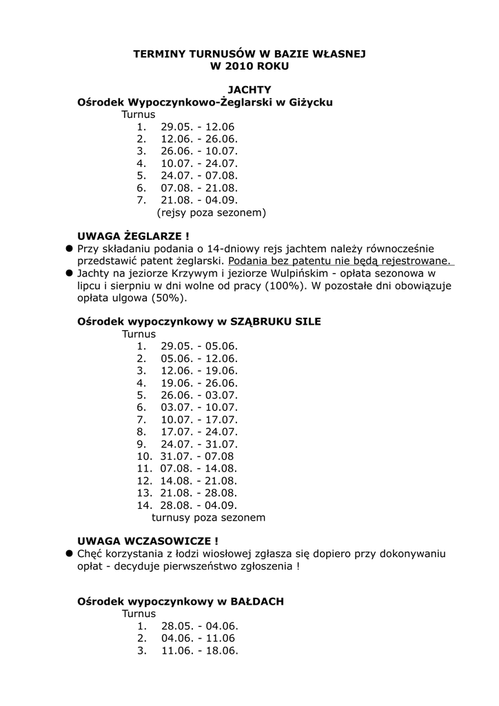 TERMINY TURNUSÓW W BAZIE WŁASNEJ W 2010 ROKU JACHTY Ośrodek Wypoczynkowo-Żeglarski w Giżycku Turnus 1. 29.05. - 12.06 2. 12.06. - 26.06. 3. 26.06. - 10.07. 4. 10.07. - 24.07. 5. 24.07. - 07.08. 6. 07.08. - 21.08. 7. 21.08. - 04.09. (rejsy poza sezonem) UWAGA ŻEGLARZE ! Przy składaniu podania o 14-dniowy rejs jachtem należy równocześnie przedstawić patent żeglarski. Podania bez patentu nie będą rejestrowane. Jachty na jeziorze Krzywym i jeziorze Wulpińskim - opłata sezonowa w lipcu i sierpniu w dni wolne od pracy (100%). W pozostałe dni obowiązuje opłata ulgowa (50%). Ośrodek wypoczynkowy w SZĄBRUKU SILE Turnus 1. 29.05. - 05.06. 2. 05.06. - 12.06. 3. 12.06. - 19.06. 4. 19.06. - 26.06. 5. 26.06. - 03.07. 6. 03.07. - 10.07. 7. 10.07. - 17.07. 8. 17.07. - 24.07. 9. 24.07. - 31.07. 10. 31.07. - 07.08 11. 07.08. - 14.08. 12. 14.08. - 21.08. 13. 21.08. - 28.08. 14. 28.08. - 04.09. turnusy poza sezonem UWAGA WCZASOWICZE ! Chęć korzystania z łodzi wiosłowej zgłasza się dopiero przy dokonywaniu opłat - decyduje pierwszeństwo zgłoszenia ! Ośrodek wypoczynkowy w BAŁDACH Turnus 1. 28.05. - 04.06. 2. 04.06. - 11.06 3. 11.06. - 18.06. 4. 5. 6. 7. 8. 9. 10. 11. 12. 13. 14. 18.06. - 25.06. 25.06. - 02.07. 02.07. - 09.07. 09.07. - 16.07. 16.07. - 23.07. 23.07. - 30.07. 30.07. - 06.08. 06.08. - 13.08. 13.08. - 20.08. 20.08. - 27.08. 27.08. - 03.09. CENNIK (pomnożony o wskaźnik inflacji 3,5% za 2009 r. i przewidywane podwyżki mediów bazy wypoczynkowej Uczelni, propozycja cen w 2010 roku - ceny z VAT) BAZA O.W. SZĄBRUK – SIŁA O.W. BAŁDY 3 osobowy domek 2 osobowy pokój 4 osobowy apartament 1 80 160 2 106 212 3 132 264 4 159 318 5 186 372 6 212 424 240 480 Dni / miejsc 7 5 osobowy domek 374 480 Cena 260 poza sezonem 310 1. Wypożyczenie łodzi wiosłowej 58.00 zł / turnus 2. Opłata miejscowa 1.93 zł /dobę od osoby, dzieci do lat 14 płacą 50% opłaty. JACHTY 1. w Giżycku (rejsy 14 dni) a) jacht Tango i Sportlake - 1300.00 zł b) jacht Twister 800 i Trim 26 - 1580.00 zł 2. Jacht „Artus” i „Rigel” na jez. Krzywym propozycje cen poza sezonem - 780,00 zł - 940,00 zł - 64.00 zł Opłata w soboty i dni świąteczne w lipcu i sierpniu (w dni powszednie 31,00 zł) 3. Jacht „Buran” na jez. Wulpińskim - 54.00 zł Opłata w soboty i dni świąteczne w lipcu i sierpniu (w dni powszednie 26,00 zł) ----------------------------------------------------------------------------------Wypożyczenie roweru w Ośrodku Wypoczynkowym Bałdy 5.00 zł /dobę. UWAGA ! Pracownik korzystający z w/w usług jest zobowiązany pokryć wszelkie szkody powstałe z jego winy. Dodatkowe ubezpieczenie pobytu w bazach - we własnym zakresie.