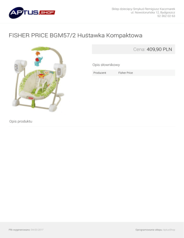 Sklep dziecięcy Smykuś Remigiusz Kaczmarek ul. Nowotoruńska 12, Bydgoszcz 52 362 02 63 FISHER PRICE BGM57/2 Huśtawka Kompaktowa Cena: 409,90 PLN Opis słownikowy Producent Fisher Price Opis produktu Plik wygenerowano: 04-03-2017 Powered by TCPDF (www.tcpdf.org) Oprogramowanie sklepu: AptusShop