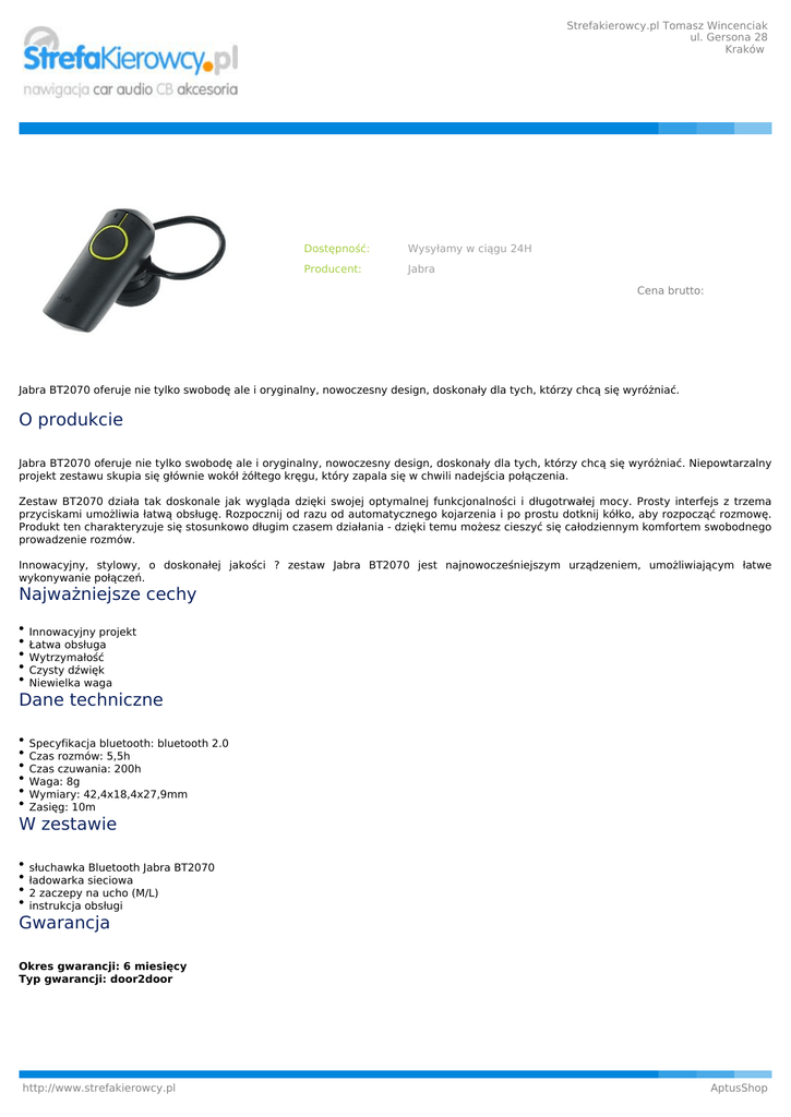 Strefakierowcy.pl Tomasz Wincenciak ul. Gersona 28 Kraków Dostępność: Wysyłamy w ciągu 24H Producent: Jabra Cena brutto: Jabra BT2070 oferuje nie tylko swobodę ale i oryginalny, nowoczesny design, doskonały dla tych, którzy chcą się wyróżniać. O produkcie Jabra BT2070 oferuje nie tylko swobodę ale i oryginalny, nowoczesny design, doskonały dla tych, którzy chcą się wyróżniać. Niepowtarzalny projekt zestawu skupia się głównie wokół żółtego kręgu, który zapala się w chwili nadejścia połączenia. Zestaw BT2070 działa tak doskonale jak wygląda dzięki swojej optymalnej funkcjonalności i długotrwałej mocy. Prosty interfejs z trzema przyciskami umożliwia łatwą obsługę. Rozpocznij od razu od automatycznego kojarzenia i po prostu dotknij kółko, aby rozpocząć rozmowę. Produkt ten charakteryzuje się stosunkowo długim czasem działania - dzięki temu możesz cieszyć się całodziennym komfortem swobodnego prowadzenie rozmów. Innowacyjny, stylowy, o doskonałej jakości ? zestaw Jabra BT2070 jest najnowocześniejszym urządzeniem, umożliwiającym łatwe wykonywanie połączeń. Najważniejsze cechy Innowacyjny projekt Łatwa obsługa Wytrzymałość Czysty dźwięk Niewielka waga Dane techniczne Specyfikacja bluetooth: bluetooth 2.0 Czas rozmów: 5,5h Czas czuwania: 200h Waga: 8g Wymiary: 42,4x18,4x27,9mm Zasięg: 10m W zestawie słuchawka Bluetooth Jabra BT2070 ładowarka sieciowa 2 zaczepy na ucho (M/L) instrukcja obsługi Gwarancja Okres gwarancji: 6 miesięcy Typ gwarancji: door2door http://www.strefakierowcy.pl AptusShop