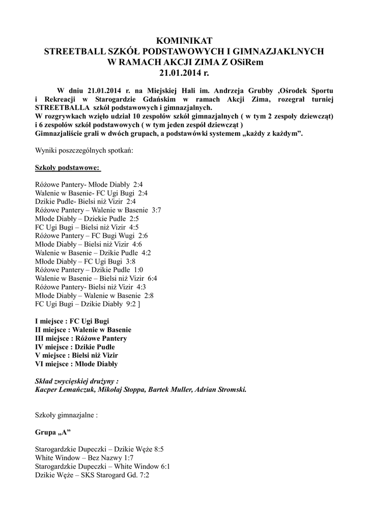 KOMINIKAT STREETBALL SZKÓŁ PODSTAWOWYCH I GIMNAZJAKLNYCH W RAMACH AKCJI ZIMA Z OSiRem 21.01.2014 r. W dniu 21.01.2014 r. na Miejskiej Hali im. Andrzeja Grubby ,Ośrodek Sportu i Rekreacji w Starogardzie Gdańskim w ramach Akcji Zima, rozegrał turniej STREETBALLA szkół podstawowych i gimnazjalnych. W rozgrywkach wzięło udział 10 zespołów szkół gimnazjalnych ( w tym 2 zespoły dziewcząt) i 6 zespołów szkół podstawowych ( w tym jeden zespół dziewcząt ) Gimnazjaliście grali w dwóch grupach, a podstawówki systemem „każdy z każdym”. Wyniki poszczególnych spotkań: Szkoły podstawowe: Różowe Pantery- Młode Diabły 2:4 Walenie w Basenie- FC Ugi Bugi 2:4 Dzikie Pudle- Bielsi niż Vizir 2:4 Różowe Pantery – Walenie w Basenie 3:7 Młode Diabły – Dziekie Pudle 2:5 FC Ugi Bugi – Bielsi niż Vizir 4:5 Różowe Pantery – FC Bugi Wugi 2:6 Młode Diabły – Bielsi niż Vizir 4:6 Walenie w Basenie – Dzikie Pudle 4:2 Młode Diabły – FC Ugi Bugi 3:8 Różowe Pantery – Dzikie Pudle 1:0 Walenie w Basenie – Bielsi niż Vizir 6:4 Różowe Pantery- Bielsi niż Vizir 4:3 Młode Diabły – Walenie w Basenie 2:8 FC Ugi Bugi – Dzikie Diabły 9:2 ] I miejsce : FC Ugi Bugi II miejsce : Walenie w Basenie III miejsce : Różowe Pantery IV miejsce : Dzikie Pudle V miejsce : Bielsi niż Vizir VI miejsce : Młode Diabły Skład zwycięskiej drużyny : Kacper Lemańczuk, Mikołaj Stoppa, Bartek Muller, Adrian Stromski. Szkoły gimnazjalne : Grupa „A” Starogardzkie Dupeczki – Dzikie Węże 8:5 White Window – Bez Nazwy 1:7 Starogardzkie Dupeczki – White Window 6:1 Dzikie Węże – SKS Starogard Gd. 7:2 Starogardzkie Dupeczki – Bez Nazwy 9:10 White Window – SKS Starogard Gd. 6:7 Starogardzkie Dupeczki – SKS Starogard Gd. 12:1 Dzikie Węże – Bez Nazwy 4:3 Dzikie Węże – White Window 17:7 Bez Nazwy – SKS Starogard Gd. 11:0 Grupa „B” Fajna Nazwa – Street Lakers 3:2 PG 2 – Pachinatos Miszle 2:10 Fajna Nazwa – PG 2 4:10 Street Lakers – Strong Team 8:2 Fajna Nazwa - Pachinatos Miszle 4:5 PG 2- Strong Team 7:1 Fajna Nazwa Strong Team 8:2 Street Lakers - Pachinatos Miszle 2:10 Street Lakers – PG 2 2:12 Pachinatos Miszle – Strong Team 12:0 I Półfinał : Starogardzkie Dupeczki - Pachinatos Miszle 9:4 II Półfinał : PG 2 – Bez Nazwy 5:7 Mecz o 3 miejsce : PG 2 - Pachinatos Miszle 3:1 Mecz o 1 miejsce : Starogardzkie Dupeczki – Bez Nazwy 11:4 I miejsce : Starogardzkie Dupeczki II miejsce : Bez Nazwy III miejsce : PG 2 IV miejsce : Pachinatos Miszle Skład zwycięskiej drużyny : Przemysław Siwek, Adrian Milewski, Jakub Mandziara, Kamil Bączek Zwycięscy turnieju otrzymali pamiątkowe statuetki oraz bilet wstępu na lodowisko a zawodnicy , którzy zajęli miejsca II i III - medal . Dla zawodników na podium organizator przygotował również batony energetyczne.,