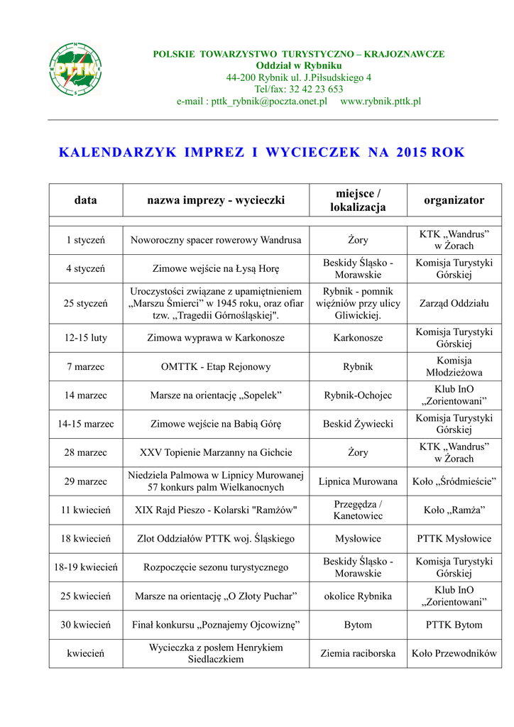 POLSKIE TOWARZYSTWO TURYSTYCZNO – KRAJOZNAWCZE Oddział w Rybniku 44-200 Rybnik ul. J.Piłsudskiego 4 Tel/fax: 32 42 23 653 e-mail : [email protected] www.rybnik.pttk.pl KALENDARZYK IMPREZ I WYCIECZEK NA 2015 ROK data nazwa imprezy - wycieczki miejsce / lokalizacja organizator 1 styczeń Noworoczny spacer rowerowy Wandrusa Żory KTK „Wandrus” w Żorach 4 styczeń Zimowe wejście na Łysą Horę Beskidy Śląsko Morawskie Komisja Turystyki Górskiej 25 styczeń Uroczystości związane z upamiętnieniem „Marszu Śmierci” w 1945 roku, oraz ofiar tzw. ,,Tragedii Górnośląskiej". Rybnik - pomnik więźniów przy ulicy Gliwickiej. Zarząd Oddziału 12-15 luty Zimowa wyprawa w Karkonosze Karkonosze Komisja Turystyki Górskiej 7 marzec OMTTK - Etap Rejonowy Rybnik Komisja Młodzieżowa 14 marzec Marsze na orientację „Sopelek” Rybnik-Ochojec Klub InO „Zorientowani” 14-15 marzec Zimowe wejście na Babią Górę Beskid Żywiecki Komisja Turystyki Górskiej 28 marzec XXV Topienie Marzanny na Gichcie Żory KTK „Wandrus” w Żorach 29 marzec Niedziela Palmowa w Lipnicy Murowanej 57 konkurs palm Wielkanocnych Lipnica Murowana Koło „Śródmieście” 11 kwiecień XIX Rajd Pieszo - Kolarski "Ramżów" Przegędza / Kanetowiec Koło „Ramża” 18 kwiecień Zlot Oddziałów PTTK woj. Śląskiego Mysłowice PTTK Mysłowice 18-19 kwiecień Rozpoczęcie sezonu turystycznego Beskidy Śląsko Morawskie Komisja Turystyki Górskiej 25 kwiecień Marsze na orientację „O Złoty Puchar” okolice Rybnika Klub InO „Zorientowani” 30 kwiecień Finał konkursu „Poznajemy Ojcowiznę” Bytom PTTK Bytom kwiecień Wycieczka z posłem Henrykiem Siedlaczkiem Ziemia raciborska Koło Przewodników maj Główny Szlak Beskidzki na raty – wyprawa 1 Beskid Śląski Komisja Turystyki Górskiej 1 maj Rowerowa wycieczka „Na konec Sveta” Petrovice / Czechy KTK „Wandrus” w Żorach 8-10 maj Pieniny – wycieczka autokarem Szczawnica / Pieniny Koło „Śródmieście” 9 maj OMTTK - Etap Wojewódzki Rybnik Komisja Młodzieżowa 16 maj XIX Rajd u Józka Palowice KTK „Wandrus” w Żorach 17 maj XI Rajd rowerowy Szlakiem Jana Pawła II Rybnik - Stodoły Komisja Turystyki Kolarskiej 22 maj Rajd „Górska Wiosna” Sudety – Biskupia Kopa Komisja Turystyki Górskiej 24 maj Rowerowa Pielgrzymka mężczyzn do Piekar Śląskich Piekary Śląskie KTK „Wandrus” w Żorach 13 czerwiec XXIX Rajd Kolarski "Ramżów" Czerwionka Koło „Ramża” 27-29 czerwiec Góry Stołowe – wycieczka autokarem Duszniki Zdrój / Góry Stołowe Koło „Śródmieście” 28 czerwiec Żorski Zlot Rowerowy Wandrusa Żory KTK „Wandrus” w Żorach czerwiec Główny Szlak Świętokrzyski Góry Świętokrzyskie Komisja Turystyki Górskiej czerwiec Główny Szlak Beskidzki na raty – wyprawa 2 Beskid Żywiecki Komisja Turystyki Górskiej 26 lipiec Mała Fatra przez Janosikowe Diery Terchova / Słowacja Koło „Śródmieście” lipiec Rumuńska wyprawa Fogarasze / Góry Rodniańskie Komisja Turystyki Górskiej lipiec / sierpień Zdobywamy najwyższy szczyt Słowenii Alpy Julijskie Komisja Turystyki Górskiej 1 sierpień XXXIII Rajd Górski "Ramżów" / impreza dla członków koła / Wisła Łabajów Koło „Ramża” 12-18 wrzesień ALPEJSKA KRAINA Szwajcaria, Francja, Lichtenstein Alpy / Szwajcaria Koło „Śródmieście” 25 wrzesień Rajd „Górska Jesień” Beskid Śląski Stożek Komisja Turystyki Górskiej 25-27 wrzesień Rajd zakończenie sezonu Wandrusa Góry Świętokrzyskie KTK „Wandrus” w Żorach 3 październik XXIX Zakończenie Sezonu Kolarskiego "Ramżów" Bełk Koło „Ramża” Henryków Koło „Śródmieście” 3-4 październik Wycieczka krajoznawcza - Henryków 18 październik Rajd do rezydencji wiejskiej Malenie Czerwionka / Leszczyny KTK „Wandrus” w Żorach 25 październik Klubowy Rajd Pamięci / Nekropolie Żory / Rybnik / Czerwionka KTK „Wandrus” w Żorach październik Marsze na orientację „Listeczek” okolice Rybnika Klub InO „Zorientowani” październik Główny Szlak Beskidzki na raty – wyprawa 3 Beskid Żywiecki Komisja Turystyki Górskiej 7-8 listopad Zakończenie sezonu turystycznego 60 lecie KTG Beskid Śląski Komisja Turystyki Górskiej 10 listopad VI Rajd Niepodległości Wandrusa Żory KTK „Wandrus” w Żorach 5 grudzień Poznajemy zabytki Rybnika Rybnik Komisja Młodzieżowa U W A G A !!! Szczegółowe regulaminy – programy będą dostępne na około 30 dni przed planowanym terminem imprezy : 1. na stronie internetowej Oddziału : www.rybnik.pttk.pl AKTUALNOŚCI 2. na tablicy informacyjnej w siedzibie biura Oddziału • organizowane przez KTK Wandrus : www.wandrus.zory.pl • organizowane przez KinO Zorientowani : www.zorientowani.xz.pl • organizowane przez Koło Ramża : www.pttkramza.cba.pl 4. zapisy na wycieczki autokarowe: od momentu ukazania się oferty w zakładce WYCIECZKI do wyczerpania miejsc