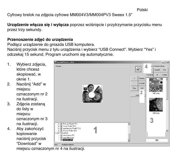 Polski Cyfrowy brelok na zdjcia cyfrowe MM004V3/MM004PV3 Sweex 1.5” Urzdzenie wcza si i wycza poprzez wcinicie i przytrzymanie przycisku menu przez trzy sekundy. Przenoszenie zdj do urzdzenia Pod cz urz dzenie do gniazda USB komputera. Nacinij przycisk menu z tyu urz dzenia i wybierz “USB Connect”. Wybierz “Yes” i odczekaj 15 sekund. Program uruchomi si automatycznie. 1. 2. 3. 4. Wybierz zdjcia, które chcesz skopiowa, w oknie 1. Nacinij “Add” w miejscu oznaczonym nr 2 na ilustracji. Zdjcia zostan do listy w miejscu oznaczonym nr 3 na ilustracji. Aby zakoczy kopiowanie nacinij przycisk “Download” w miejscu oznaczonym nr 4 na ilustracji. Ustawienia i obsuga Przy pomocy przycisków “Up” (góra) i “Down” (dó) mona przeglda zdjcia i porusza si po menu. Nacinij “Menu” z tyu urzdzenia, aby otworzy menu i zmieni ustawienia. Aby wybra jedn z pozycji menu, nacinij przycisk menu ponownie. Zmieniaj wartoci przyciskami “Up” i “Down”. Urzdzenie aduje si poprzez podczenie do gniazda USB. Gwarancja Wszystkie produkty Sweex s objte trzyletni gwarancj. Nie zapewniamy wsparcia technicznego ani gwarancji obejmujcej doczone oprogramowanie, akumulatory lub baterie. Roszczenia gwarancyjne mona skada tylko w punkcie sprzeday produktu. Wszystkie nazwy handlowe i powizane z nimi prawa pozostaj wasnoci odpowiednich podmiotów - wacicieli.