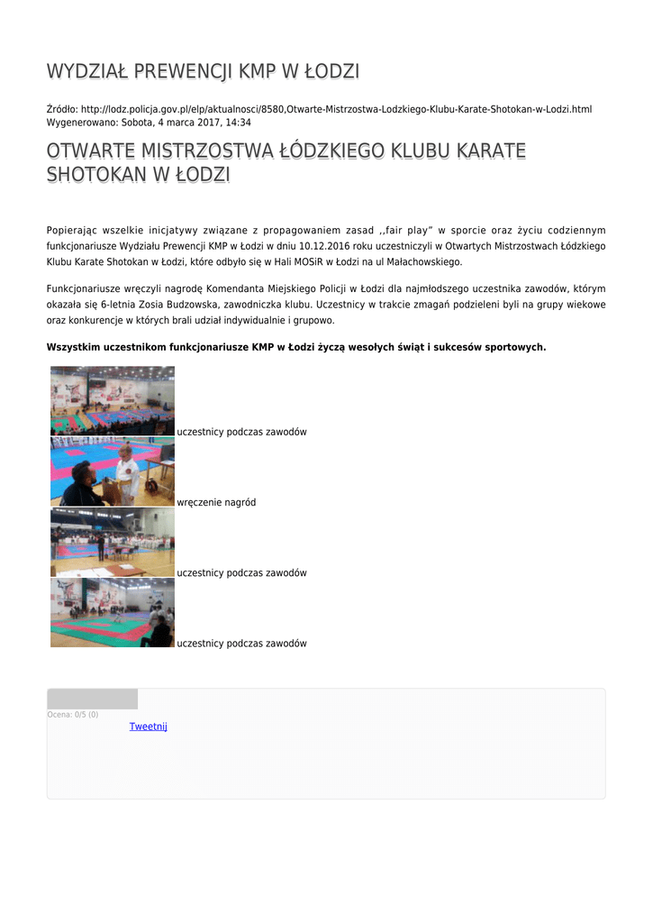 WYDZIAŁ PREWENCJI KMP W ŁODZI Źródło: http://lodz.policja.gov.pl/elp/aktualnosci/8580,Otwarte-Mistrzostwa-Lodzkiego-Klubu-Karate-Shotokan-w-Lodzi.html Wygenerowano: Sobota, 4 marca 2017, 14:34 OTWARTE MISTRZOSTWA ŁÓDZKIEGO KLUBU KARATE SHOTOKAN W ŁODZI Popierając wszelkie inicjatywy związane z propagowaniem zasad ,,fair play” w sporcie oraz życiu codziennym funkcjonariusze Wydziału Prewencji KMP w Łodzi w dniu 10.12.2016 roku uczestniczyli w Otwartych Mistrzostwach Łódzkiego Klubu Karate Shotokan w Łodzi, które odbyło się w Hali MOSiR w Łodzi na ul Małachowskiego. Funkcjonariusze wręczyli nagrodę Komendanta Miejskiego Policji w Łodzi dla najmłodszego uczestnika zawodów, którym okazała się 6-letnia Zosia Budzowska, zawodniczka klubu. Uczestnicy w trakcie zmagań podzieleni byli na grupy wiekowe oraz konkurencje w których brali udział indywidualnie i grupowo. Wszystkim uczestnikom funkcjonariusze KMP w Łodzi życzą wesołych świąt i sukcesów sportowych. uczestnicy podczas zawodów wręczenie nagród uczestnicy podczas zawodów uczestnicy podczas zawodów Ocena: 0/5 (0) Tweetnij