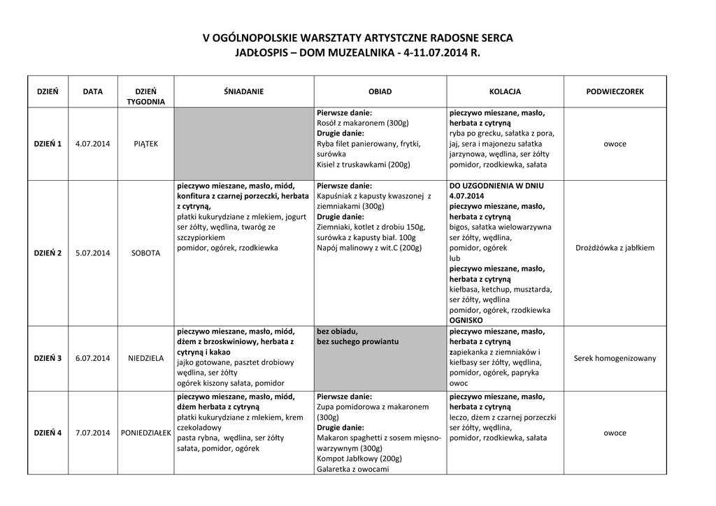 V OGÓLNOPOLSKIE WARSZTATY ARTYSTCZNE RADOSNE SERCA JADŁOSPIS – DOM MUZEALNIKA - 4-11.07.2014 R. DZIEŃ DZIEŃ 1 DZIEŃ 2 DZIEŃ 3 DZIEŃ 4 DATA 4.07.2014 5.07.2014 6.07.2014 7.07.2014 DZIEŃ TYGODNIA ŚNIADANIE NIEDZIELA KOLACJA Pierwsze danie: Rosół z makaronem (300g) Drugie danie: Ryba filet panierowany, frytki, surówka Kisiel z truskawkami (200g) pieczywo mieszane, masło, herbata z cytryną ryba po grecku, sałatka z pora, jaj, sera i majonezu sałatka jarzynowa, wędlina, ser żółty pomidor, rzodkiewka, sałata pieczywo mieszane, masło, miód, konfitura z czarnej porzeczki, herbata z cytryną, płatki kukurydziane z mlekiem, jogurt ser żółty, wędlina, twaróg ze szczypiorkiem pomidor, ogórek, rzodkiewka Pierwsze danie: Kapuśniak z kapusty kwaszonej z ziemniakami (300g) Drugie danie: Ziemniaki, kotlet z drobiu 150g, surówka z kapusty biał. 100g Napój malinowy z wit.C (200g) pieczywo mieszane, masło, miód, dżem z brzoskwiniowy, herbata z cytryną i kakao jajko gotowane, pasztet drobiowy wędlina, ser żółty ogórek kiszony sałata, pomidor bez obiadu, bez suchego prowiantu DO UZGODNIENIA W DNIU 4.07.2014 pieczywo mieszane, masło, herbata z cytryną bigos, sałatka wielowarzywna ser żółty, wędlina, pomidor, ogórek lub pieczywo mieszane, masło, herbata z cytryną kiełbasa, ketchup, musztarda, ser żółty, wędlina pomidor, ogórek, rzodkiewka OGNISKO pieczywo mieszane, masło, herbata z cytryną zapiekanka z ziemniaków i kiełbasy ser żółty, wędlina, pomidor, ogórek, papryka owoc PIĄTEK SOBOTA OBIAD pieczywo mieszane, masło, miód, dżem herbata z cytryną płatki kukurydziane z mlekiem, krem czekoladowy PONIEDZIAŁEK pasta rybna, wędlina, ser żółty sałata, pomidor, ogórek Pierwsze danie: Zupa pomidorowa z makaronem (300g) Drugie danie: Makaron spaghetti z sosem mięsnowarzywnym (300g) Kompot Jabłkowy (200g) Galaretka z owocami pieczywo mieszane, masło, herbata z cytryną leczo, dżem z czarnej porzeczki ser żółty, wędlina, pomidor, rzodkiewka, sałata PODWIECZOREK owoce Drożdżówka z jabłkiem Serek homogenizowany owoce DZIEŃ 5 DZIEŃ 6 DZIEŃ 7 DZIEŃ 8 8.07.2014 9.07.2014 10.07.2014 11.07.2014 WTOREK ŚRODA Pierwsze danie: Zupa jarzynowa (300g) Drugie danie: Kotlet mielony faszerowany żółtym serem (110g) Ziemniaki (250g), sałata ze śmietaną (120g) Kompot owocowy (200g) Pierwsze danie: pieczywo mieszane, masło, miód, konfitura z czarnej porzeczki, herbata Rosół z makaronem (300g) Drugie danie: z cytryną Ryż z kurczakiem w curry i Płatki czekoladowe z mlekiem Parówki gotowane, Keczup, warzywami, (250g) Sałatka z kapusty (120g) Ser żółty, wędlina, Jogurt, pasta Kompot z owoców mieszanych jajeczna (200g) sałata, pomidor Pierwsze danie: pieczywo mieszane, masło, miód, Żurek z kiełbasą i ziemniakami dżem morelowy , herbata z cytryną müsli lub płatki z mlekiem, (300g) wędlina, twarożek ze szczypiorkiem, Drugie danie: Ryba filet panierowany, frytki, ser żółty surówka pomidor, ogórek, rzodkiewka Kisiel z truskawkami (200g) pieczywo mieszane, masło, miód, dżem truskawkowy, herbata z cytryną, sok pomarańczowy Müsli lub płatki z mlekiem parówka na ciepło, twaróg ze szczypiorkiem, wędlina, ser żółty pomidor, ogórek, rzodkiewka CZWAREK PIĄTEK pieczywo mieszane, masło, miód, dżem truskawkowy, herbata z cytryną i kakao jajecznica, płatki kukurydziane z mlekiem, pasztet drobiowy, ser żółty ogórek kiszony, sałata, papryka bez suchego prowiantu pieczywo mieszane, masło, herbata z cytryną Naleśniki z serem, krem czekoladowy Wędlina, ser topiony pomidor, rzodkiewka, sałata pieczywo mieszane, masło, herbata z cytryną ryba po grecku, sałatka z pora, jaj, sera i majonezu sałatka jarzynowa, wędlina, ser żółty pomidor, rzodkiewka, sałata DO UZGODNIENIA W DNIU 9.07.2014 pieczywo mieszane, masło, herbata z cytryną zapiekanka z makaronem, Pasta z ryby wędzonej z majonezem ser żółty, wędlina, pomidor, rzodkiewka, sałata lub pieczywo mieszane, masło, herbata z cytryną kiełbasa, ketchup, musztarda, ser żółty, wędlina pomidor, ogórek, rzodkiewka OGNISKO ciasto jogurt owoce