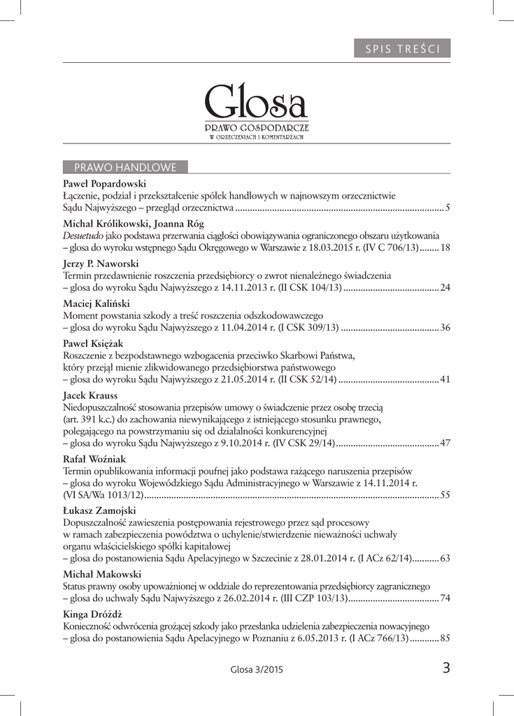 SPIS TREŚCI PRAWO HANDLOWE Paweł Popardowski Łączenie, podział i przekształcenie spółek handlowych w najnowszym orzecznictwie Sądu Najwyższego – przegląd orzecznictwa .....................................................................................5 Michał Królikowski, Joanna Róg Desuetudo jako podstawa przerwania ciągłości obowiązywania ograniczonego obszaru użytkowania – glosa do wyroku wstępnego Sądu Okręgowego w Warszawie z 18.03.2015 r. (IV C 706/13) ........18 Jerzy P. Naworski Termin przedawnienie roszczenia przedsiębiorcy o zwrot nienależnego świadczenia – glosa do wyroku Sądu Najwyższego z 14.11.2013 r. (II CSK 104/13) .......................................24 Maciej Kaliński Moment powstania szkody a treść roszczenia odszkodowawczego – glosa do wyroku Sądu Najwyższego z 11.04.2014 r. (I CSK 309/13) ........................................36 Paweł Księżak Roszczenie z bezpodstawnego wzbogacenia przeciwko Skarbowi Państwa, który przejął mienie zlikwidowanego przedsiębiorstwa państwowego – glosa do wyroku Sądu Najwyższego z 21.05.2014 r. (II CSK 52/14) .........................................41 Jacek Krauss Niedopuszczalność stosowania przepisów umowy o świadczenie przez osobę trzecią (art. 391 k.c.) do zachowania niewynikającego z istniejącego stosunku prawnego, polegającego na powstrzymaniu się od działalności konkurencyjnej – glosa do wyroku Sądu Najwyższego z 9.10.2014 r. (IV CSK 29/14) ..........................................47 Rafał Woźniak Termin opublikowania informacji poufnej jako podstawa rażącego naruszenia przepisów – glosa do wyroku Wojewódzkiego Sądu Administracyjnego w Warszawie z 14.11.2014 r. (VI SA/Wa 1013/12)........................................................................................................................55 Łukasz Zamojski Dopuszczalność zawieszenia postępowania rejestrowego przez sąd procesowy w ramach zabezpieczenia powództwa o uchylenie/stwierdzenie nieważności uchwały organu właścicielskiego spółki kapitałowej – glosa do postanowienia Sądu Apelacyjnego w Szczecinie z 28.01.2014 r. (I ACz 62/14)...........63 Michał Makowski Status prawny osoby upoważnionej w oddziale do reprezentowania przedsiębiorcy zagranicznego – glosa do uchwały Sądu Najwyższego z 26.02.2014 r. (III CZP 103/13).....................................74 Kinga Dróżdż Konieczność odwrócenia grożącej szkody jako przesłanka udzielenia zabezpieczenia nowacyjnego – glosa do postanowienia Sądu Apelacyjnego w Poznaniu z 6.05.2013 r. (I ACz 766/13) ............85 Glosa 3/2015 3 SPIS TREŚCI WŁASNOŚĆ INTELEKTUALNA Michał Bohaczewski Podmiot praw autorskich w ujęciu kolizyjnoprawnym – glosa do wyroku Sądu Najwyższego z 15.09.2011 r. (II CSK 572/10) .......................................89 PODATKI Tomasz Kolanowski Sprzedaż nieruchomości – kontrowersyjne źródło przychodów w podatku dochodowym od osób fizycznych (cz. II) – przegląd orzecznictwa .....................................................................103 Jarosław Olesiak, Łukasz Pajor Poręczenie udzielone bez wynagrodzenia a opodatkowanie świadczeń nieodpłatnych – glosa do wyroku Naczelnego Sądu Administracyjnego z 19.04.2013 r. (II FSK 1689/11).......116 Ola Nieczepa Poinformowanie podatnika o wszczęciu postępowania karnoskarbowego jako moment skutecznego zawieszenia biegu terminu przedawnienia zobowiązania podatkowego po upływie 5-letniego terminu przedawnienia – glosa do wyroku Naczelnego Sądu Administracyjnego z 16.01.2013 r. (I FSK 1208/11) ........122 Grzegorz Borkowski Oprocentowanie nadpłaty podatku „z nieujawnionych źródeł” – orzeczenie kwartału..............128 Table of Contents & Abstracts .......................................................................................134 Wersją podstawową (referencyjną) czasopisma jest wersja papierowa. Zgodnie z komunikatem Ministra Nauki i Szkolnictwa Wyższego z 31.12.2014 r. w sprawie wykazu czasopism naukowych wraz z liczbą punktów przyznawanych za publikacje w tych czasopismach, każda publikacja ukazująca się na łamach GLOSY otrzymuje 6 punktów. WARUNKI PRZYJMOWANIA TEKSTÓW DO DRUKU Materiały do publikacji – o objętości do 15 stron znormalizowanego maszynopisu (ok. 25 tysięcy znaków ze spacjami) – przyjmujemy pocztą elektroniczną lub zwykłą, z załączoną płytą CD (z imieniem, nazwiskiem, krótkim CV oraz telefonami kontaktowymi i adresem e-mail). Tekst musi zawierać tytuł, krótkie wprowadzenie (lead) oraz abstrakt w języku polskim, o objętości nie większej niż 800 znaków. Autor może zaproponować tłumaczenie na język angielski tytułu tekstu oraz abstraktu. Artykuły o większej objętości – zaakceptowane do druku – Redakcja będzie odsyłała Autorom w celu ich skrócenia. Do materiałów przysyłanych do Redakcji przez absolwentów wydziałów prawa, doktorantów, asystentów i aplikantów powinna być dołączona rekomendacja (recenzja) opiekuna naukowego. Autor, przekazując Redakcji tekst, przenosi na Wydawcę wyłączne prawo do jego publikacji (prawa autorskie i wydawnicze). Redakcja zastrzega sobie możliwość dokonywania zmian w tekstach przeznaczonych do publikacji. Materiały niezamówione nie będą zwracane. Warunkiem publikacji jest odesłanie uprzednio podpisanej umowy z Wydawnictwem. Redakcja 4 Glosa 3/2015 TA B L E O F CO N T E N T S & A B S T R A C T S COMMERCIAL LAW Paweł Popardowski Merger, division and transformation of companies in recent case law of the Supreme Court – case law review................................................................................................................................................5 This review of case law is devoted to the analysis of the jurisprudence of the Supreme Court substantively associated with the issue of company restructuring (merger, division and transformation of com