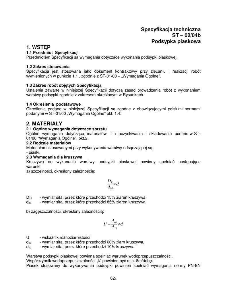 Specyfikacja techniczna ST – 02/04b Podsypka piaskowa 1. WSTĘP 1.1 Przedmiot Specyfikacji Przedmiotem Specyfikacji są wymagania dotyczące wykonania podsypki piaskowej. 1.2 Zakres stosowania Specyfikacja jest stosowana jako dokument kontraktowy przy zlecaniu i realizacji robót wymienionych w punkcie 1.1 , zgodnie z ST-01/00 – „Wymagania Ogólne”. 1.3 Zakres robót objętych Specyfikacją Ustalenia zawarte w niniejszej Specyfikacji dotyczą zasad prowadzenia robót z wykonaniem warstwy podsypki zgodnie z zakresem określonym w Rysunkach. 1.4 Określenia podstawowe Określenia podane w niniejszej Specyfikacji są zgodne z obowiązującymi polskimi normami podanymi w ST-01/00 „Wymagania Ogólne” pkt. 1.4. 2. MATERIAŁY 2.1 Ogólne wymagania dotyczące sprzętu Ogólne wymagania dotyczące materiałów, ich pozyskiwania i składowania podano w ST01/00 "Wymagania Ogólne", pkt.2. 2.2 Rodzaje materiałów Materiałami stosowanymi przy wykonywaniu warstwy odsączającej są: - piaski, 2.3 Wymagania dla kruszywa Kruszywa do wykonania warstwy podsypki piaskowej powinny spełniać następujące warunki: a) szczelności, określony zależnością: D15 ⩽5 d 85 D15 d85 - wymiar sita, przez które przechodzi 15% ziaren kruszywa - wymiar sita, przez które przechodzi 85% ziaren kruszywa b) zagęszczalności, określony zależnością: U= U d60 d10 d 60 ⩾5 d 10 - wskaźnik różnoziarnistości - wymiar sita, przez które przechodzi 60% ziarn kruszywa, - wymiar sita, przez które przechodzi 10% kruszywa. Warstwa podsypki piaskowej powinna spełniać warunek wodoprzepuszczalności. Współczynnik wodoprzepuszczalności „k” powinien być min. 8m/dobę. Piasek stosowany do wykonywania podsypki powinien spełniać wymagania normy PN-EN 62c 13043 dla gatunku 1 i 2. 2.4 Składowanie kruszywa Jeżeli kruszywo przeznaczone do wykonania warstwy podsypki nie jest wbudowane bezpośrednio po dostarczeniu na budowę i zachodzi potrzeba jego okresowego składowania, to Wykonawca robót powinien zabezpieczyć kruszywo przed zanieczyszczeniem i zmieszaniem z innymi materiałami kamiennymi. Podłoże w tym miejscu składowania powinno być równe, utwardzone i dobrze odwodnione. 3. SPRZĘT 3.1 Ogólne wymagania dotyczące sprzętu Ogólne wymagania dotyczące sprzętu podano w ST-01/00 "Wymagania Ogólne", pkt.3. 3.2 Sprzęt do wykonania robót Wykonawca przystępujący do wykonania warstwy odsączającej powinien wykazać możliwością korzystania z następującego sprzętu: - płyt wibracyjnych lub ubijaków mechanicznych. się 4. TRANSPORT 4.1 Ogólne wymagania dotyczące transportu Ogólne wymagania dotyczące transportu podano w ST-01/00 „Wymagania Ogólne” pkt. 4. 4.2 Transport kruszywa Kruszywa można przewozić dowolnymi środkami transportu w warunkach zabezpieczających je przed zanieczyszczeniem, zmieszaniem z innymi materiałami, nadmiernym wysuszeniem i zawilgoceniem. 5. WYKONANIE ROBÓT 5.1 Przygotowanie podłoża Podłoże gruntowe powinno spełniać wymagania określone w Specyfikacji ST-02/01 „Wykonanie koryta, profilowanie i zagęszczenie podłoża pod w-wy konstrukcyjne nawierzchni” oraz ST-02/03 "Wymiana gruntu". Warstwa podsypki piaskowej powinna być wytyczona w sposób umożliwiający wykonanie jej zgodnie z Rysunkami, z tolerancjami określonymi w niniejszych Specyfikacjach. 5.2 Wbudowanie i zagęszczanie kruszywa Kruszywo powinno być rozkładane w warstwie o jednakowej grubości, z zachowaniem wymaganych spadków i rzędnych wysokościowych. Grubość rozłożonej warstwy luźnego kruszywa powinna być taka, aby po jej zagęszczeniu osiągnięto grubość projektowaną. Przewidywana do ułożenia warstwa podsypki o grubości 10 cm powinna być ułożona w jednej warstwie. Natychmiast po końcowym wyprofilowaniu warstwy podsypki należy przystąpić do jej zagęszczania. Nierówności lub zagłębienia powstałe w czasie zagęszczania powinny być wyrównywane na bieżąco przez spulchnienie warstwy i dodanie lub usunięcie materiału, aż do otrzymania równej powierzchni. Zagęszczenie należy kontynuować do osiągnięcia wskaźnika zagęszczenia 1,0 według normalnej próby Proctora, przeprowadzonej według PN-B-04481. Wskaźnik zagęszczenia należy określać zgodnie z BN-77/8931-12. W przypadku, gdy gruboziarnisty materiał wbudowany w warstwę uniemożliwia przeprowadzenie badania zagęszczenia według normalnej próby Proctora, kontrolę zagęszczenia należy oprzeć na metodzie obciążeń płytowych. Należy określić pierwotny i wtórny moduł odkształcenie warstwy według BN-64/8931-02. Stosunek wtórnego i pierwotnego modułu odkształcenia nie powinien przekraczać 2,2. Wilgotność kruszywa podczas zagęszczania powinna być równa wilgotności optymalnej z tolerancją od –20% do +10% jej wartości, W przypadku, gdy wilgotność kruszywa jest wyższa od wilgotności optymalnej, kruszywo należy osuszyć przez mieszanie i napowietrzanie. 62d W przypadku, gdy wilgotność kruszywa jest niższa od wilgotności optymalnej, kruszywo należy zwilżyć określoną ilością wody i równomiernie wymieszać. 6. KONTROLA JAKOŚCI ROBÓT 6.1 Ogólne zasady kontroli jakości robót Ogólne zasady kontroli jakości robót podano w ST-01/00 „Wymagania Ogólne” pkt. 6. 6.2 Badania przed przystąpieniem do robót Przed przystąpieniem do Robót Wykonawca powinien wykonać badania kruszyw przeznaczonych do wykonania i przedstawić wyniki tych badań Inżynierowi. Badania te powinny obejmować wszystkie właściwości kruszywa określone w p. 2.3. 6.3 Badania w czasie robót 6.3.1 Częstotliwość oraz zakres badań i pomiarów Częstotliwość oraz zakres badań i pomiarów dotyczących zagęszczenia warstwy odsączającej podaje tablica 2. cech geometrycznych i Tablica 2. Częstotliwość oraz zakres badań i pomiarów warstwy odsączającej Lp. 1. 2. 3. 4. 5. 6. 7. Wyszczególnienie badań i pomiarów Szerokość warstwy Równość podłużna Równość po