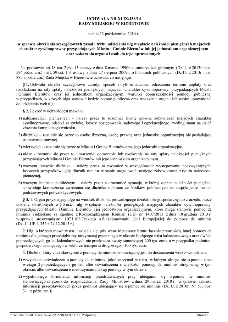 UCHWAŁA NR XLIX/438/14 RADY MIEJSKIEJ W BIERUTOWIE z dnia 23 października 2014 r. w sprawie określenia szczegółowych zasad i trybu udzielania ulg w spłacie należności pieniężnych mających charakter cywilnoprawny przypadających Miastu i Gminie Bierutów lub jej jednostkom organizacyjnym oraz wskazania organu i osób do tego uprawnionych. Na podstawie art.18 ust. 2 pkt 15 ustawy z dnia 8 marca 1990r. o samorządzie gminnym (Dz.U. z 2013r. poz. 594 późn. zm.) i art. 59 ust. 1-3 ustawy z dnia 27 sierpnia 2009r. o finansach publicznych (Dz.U. z 2013r. poz. 885 z późn. zm.) Rada Miejska w Bierutowie uchwala, co następuje: § 1. Uchwała określa szczegółowe zasady, sposób i tryb umarzania, odraczania terminu zapłaty oraz rozkładania na raty spłaty należności pieniężnych mających charakter cywilnoprawny, przypadających Miastu i Gminie Bierutów oraz jej jednostkom organizacyjnym, warunki dopuszczalności pomocy publicznej w przypadkach, w których ulga stanowić będzie pomoc publiczną oraz wskazania organu lub osoby uprawnionej do udzielenia tych ulg. § 2. Ilekroć w uchwale jest mowa o: 1) należnościach pieniężnych - należy przez to rozumieć kwotę główną zobowiązań mających charakter cywilnoprawny, odsetki za zwłokę, koszty postępowania sądowego i egzekucyjnego, według stanu na dzień złożenia kompletnego wniosku, 2) dłużniku – rozumie się przez to osobę fizyczną, osobę prawną oraz jednostkę organizacyjną nie posiadającą osobowości prawnej, 3) wierzycielu - rozumie się przez to Miasto i Gminę Bierutów oraz jego jednostki organizacyjne, 4) uldze - rozumie się przez to umorzenie, odroczenie lub rozłożenie na raty spłaty należności pieniężnych przypadających Miastu i Gminie Bierutów lub jego jednostkom organizacyjnym, 5) ważnym interesie dłużnika – należy przez to rozumieć w szczególności: występowanie nadzwyczajnych, losowych przypadków, gdy dłużnik nie jest w stanie uregulować swojego zobowiązania z tytułu należności pieniężnej, 6) ważnym interesie publicznym – należy przez to rozumieć sytuację, w której zapłata należności pieniężnej spowoduje konieczność zwrócenia się dłużnika o pomoc ze środków publicznych na zaspokojenie swoich podstawowych potrzeb życiowych. § 3. 1. Organ przyznający ulgę na wniosek dłużnika prowadzącego działalność gospodarczą lub z urzędu, może udzielić określonych w § 5 ust.1 ulg w spłacie należności pieniężnych mających charakter cywilnoprawny, przypadających Miastu i Gminie Bierutów i jej jednostkom organizacyjnym, które mogą stanowić pomoc de minimis i udzielane są zgodnie z Rozporządzeniem Komisji (UE) nr 1407/2013 z dnia 18 grudnia 2013 r. w sprawie stosowania art. 107 i 108 Traktatu o funkcjonowaniu Unii Europejskiej do pomocy de minimis (Dz. U. UE L 352 z 24.12.2013 r.). 2. Ulg, o których mowa w ust. 1 udziela się, gdy wartość pomocy brutto łącznie z wartością innej pomocy de minimis dla jednego przedsiębiorcy otrzymanej przez niego w okresie bieżącego roku kalendarzowego oraz dwóch poprzedzających go lat kalendarzowych nie przekracza kwoty stanowiącej 200 tys. euro, a w przypadku podmiotu gospodarczego działającego w sektorze transportu drogowego - 100 tys. euro. 3. Dłużnik, który chce skorzystać z pomocy de minimis zobowiązany jest do dostarczenia wraz z wnioskiem: 1) wszystkich zaświadczeń o pomocy de minimis, jakie otrzymał w roku, w którym ubiega się o pomoc oraz w ciągu 2 poprzedzających go lat, albo oświadczenia o wielkości pomocy de minimis otrzymanej w tym okresie, albo oświadczenia o nieotrzymaniu takiej pomocy w tym okresie; 2) wypełnionego formularza informacji przedstawianych przy ubieganiu się o pomoc de minimis, stanowiącego załącznik do rozporządzenia Rady Ministrów z dnia 29 marca 2010 r. w sprawie zakresu informacji przedstawionych przez podmiot ubiegający się o pomoc de minimis (Dz. U. z 2010r. Nr 53, poz. 311 z późn. zm.); Id: 61C07C65-8C32-4FC4-AB3A-550F847D0C51. Podpisany Strona 1 4. Dłużnik ubiegający się o pomoc de minimis w ramach niniejszej uchwały jest zobowiązany do przedłożenia w żądanym terminie - na wniosek organu udzielającego pomocy - dodatkowych dokumentów lub informacji niezbędnych dla jej oceny oraz prawidłowego udzielenia. 5. W przypadku, kiedy udzielenie ulgi stanowiącej pomoc de minimis nie jest możliwe z uwagi na przekroczenie pułapu dopuszczalnej pomocy de minimis lub z uwagi na niedopełnienie obowiązków określonych w ust. 3 i 4, wniosek dłużnika o ulgę pozostaje bez rozpatrzenia. § 4. 1. Należności pieniężne mogą być umarzane z urzędu w całości w przypadkach gdy: 1) osoba fizyczna - zmarła nie pozostawiając żadnego majątku albo pozostawiła majątek niepodlegający egzekucji na podstawie odrębnych przepisów, albo pozostawiła przedmioty codziennego użytku domowego, których łączna wartość nie przekracza 6.000zł, 2) osoba prawna – została wykreślona z właściwego rejestru osób prawnych przy jednoczesnym braku majątku, z którego można by egzekwować należność, a odpowiedzialność z tytułu należności nie przechodzi z mocy prawa na osoby trzecie, 3) zachodzi uzasadnione przypuszczenie, że w postępowaniu egzekucyjnym nie uzyska się kwoty wyższej od kosztów dochodzenia i egzekucji tej należności lub postępowanie egzekucyjne okazało się nieskuteczne, 4) jednostka organizacyjna nie posiadająca osobowości prawnej uległa likwidacji, 5) zachodzi ważny interes dłużnika lub interes publiczny. 2. W przypadku gdy oprócz dłużnika głównego są zobowiązane inne osoby, należności, o których mowa w ust.1, mogą zostać umorzone tylko wtedy, gdy warunki umarzania są spełnione wobec wszystkich zobowiązanych. § 5. 1. Należności pieniężne mogą być, na wniosek dłużnika, w całości lub w części umarzane, ich spłata może być odraczana lub rozkładana na raty w