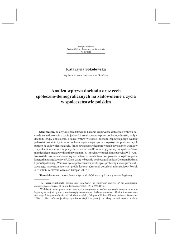 425 Zeszyty Naukowe Wyższej Szkoły Bankowej we Wrocławiu Nr 20/2011 Katarzyna Sokołowska Wyższa Szkoła Bankowa w Gdańsku Analiza wpływu dochodu oraz cech społeczno-demograficznych na zadowolenie z życia w społeczeństwie polskim Streszczenie. W artykule przedstawiono badania empiryczne dotyczące wpływu dochodu na zadowolenie z życia jednostki. Analizowano wpływ dochodu jednostki, wpływ dochodu grupy odniesienia, a także wpływ wielkości dochodu zapewniającego według jednostki dostatnie życie oraz dochodu wystarczającego na zaspokojenie podstawowych potrzeb na zadowolenie z życia. Praca zawiera również porównanie uzyskanych wyników z wynikami zawartymi w pracy Ferrer-i-Carbonell1, odnoszącymi się do społeczeństwa niemieckiego oraz z wynikami uzyskanymi w innych artykułach dotyczących SWB. Analiza została przeprowadzona z wykorzystaniem polichotomicznego modelu logitowego dla kategorii uporządkowanych2. Dane użyte w badaniu pochodzą z Sondażu Centrum Badania Opinii Społecznej ,,Warunki życia społeczeństwa polskiego – problemy i strategie” zrealizowanego na reprezentatywnej próbie losowo-adresowej dorosłych mieszkańców Polski, N = 38866, w okresie wrzesień-listopad 2007 r. Słowa kluczowe: zadowolenie z życia, dochód, uporządkowany model logitowy 1 A. Ferrer-i-Carbonell, Income and well-being: an empirical analysis of the comparison income effect, „Journal of Public Economic” 2005, 89, s. 997-1019. 2 W dalszej części pracy model ten będzie nazywany w skrócie uporządkowanym modelem logitowym, co jest zgodne z terminologią stosowaną w: Mikroekonometria, Modele i metody analizy danych indywidualnych, red. M. Gruszczyński, Oficyna a Wolters Kluwer business, Warszawa 2010, s. 114. Informacje dotyczące konstrukcji i estymacji tej klasy modeli można znaleźć 426 Katarzyna Sokołowska Wstęp Celem artykułu jest empiryczne sprawdzenie wpływu na zadowolenie z życia (definiowanego inaczej jako szczęście, satysfakcja z życia, subiektywny dobrobyt (subjective well-being – SWB)3 wysokości dochodu jednostki, a także wysokości dochodu jednostki w porównaniu z dochodem grupy odniesienia. Uzyskane w pracy wyniki porównuje się z wynikami otrzymanymi dla społeczeństwa niemieckiego zawartymi w artykule A. Ferrer-i-Carbonell4, który to poświęcony jest przede wszystkim wpływowi dochodu grupy odniesienia na satysfakcję z życia. Artykuł zawiera również zestawienie wyników otrzymanych przez innych autorów w badaniach nad SWB. Zmienna endogeniczna informuje o opiniach respondentów pochodzących z ogólnopolskiej próby5. Zmienna ta mierzona jest na 5-stopniowej skali porządkowej6 (od bardzo niezadowolony – 1 do bardzo zadowolony – 5). Zmienna objaśniająca dochód jest łącznym miesięcznym dochodem netto wszystkich członków badanego gospodarstwa domowego podzielonym przez liczbę osób, obliczonym jako średnia za ostatnie 3 miesiące. Dane pochodzą z badania ,,Warunki życia społeczeństwa polskiego – problemy i strategie”7 przeprowadzonego w 2007 r. Badania dotyczące szczęścia nie są działaniami niepotrzebnymi ani ekscentrycznymi, lecz mogą dostarczyć istotnych nowych spostrzeżeń oraz służyć jako w: R. Winkelmann, S. Boes, Analysis of microdata, Springer, Berlin, Heidelberg, New York 2006; W.H. Greene, Econometric analysis, wyd. 5, Prentice Hall, Upper Saddle River 2003. 3 Podano za: J. Knight, L. Song, R. Gunatilaka, Subjective Well-being and its Determinants in Rural China, „China Economic Review” 2009, Vol. 20, Issue 4, s. 635-649. Można spotkać się również ze zdaniem, że synonimem SWB nie jest szczęście, gdyż pojęcie SWB obejmuje szerszą kategorię zjawisk – są to ludzkie emocje, źródła satysfakcji i globalne sądy dotyczące satysfakcji z życia (Diener, Ed, Eunkook M. Suh, Robert E. Lucas and Heidi L. Smith, Subjective Well- Being: Three Decades of Progress, „Psychological Bulletin” 1999, 125 (2), s. 277). Powszechnie jednak w literaturze ekonomicznej pojęcia te używane są zamiennie. 4 A. Ferrer-i-Carbonell, wyd. cyt., s. 997-1019. 5 Próba ta losowana była przy wykorzystaniu schematu losowania wielostopniowego, przy czym jednostkami losowania pierwszego stopnia były obwody spisowe, a na drugim stopniu losowane były mieszkania. W wylosowanym mieszkaniu dobierane było gospodarstwo domowe (jeśli było więcej niż jedno), w gospodarstwie domowym zaś respondent – była to osoba w wieku 18 lat i więcej, która ostatnio obchodziła urodziny. Zob. K. Zagórski, Warunki życia społeczeństwa polskiego – problemy i strategie, www.ads.org.pl, 2007. 6 Zadowolenie z życia w: K. Zagórski, wyd. cyt., mierzone jest za pomocą odpowiedzi na pytanie: Czy na ogół jest Pan(i) zadowolony(a), z całego życia. 7 Sondaż Centrum Badania Opinii Społecznej ,,Warunki życia społeczeństwa polskiego – problemy i strategie” zrealizowany na reprezentatywnej próbie losowo-adresowej dorosłych mieszkańców Polski, N = 38866, w okresie wrzesień-listopad 2007 r. Kierownik Zespołu Badawczego: prof. dr hab. Krzysztof Zagórski. Dane dostępne są na stronie internetowej www.ads.org.pl. Analiza wpływu dochodu oraz cech społeczno-demograficznych na zadowolenie z życia 427 inspiracja dla przyszłych badań w dziedzinie ekonomii8. Powinny one stać się głównym tematem w naukach społecznych9, zadowolenie z życia jest bowiem celem, do osiągnięcia którego dąży każdy z nas. Istnieje wiele przykładów, że pożądane efekty, nawet gospodarcze, są często spowodowane przez wysoki poziom zadowolenia z życia w danym społeczeństwie. Ludzie bardziej usatysfakcjonowani z życia w przyszłości mają wyższe dochody i osiągają lepsze wyniki w pracy niż ludzie, których zadowolenie z życia jest niskie. Szczęśliwi pracownicy są lepiej zorganizowani i bardziej pomocni innym współpracownikom, ich stosunki społeczne są lepsze. Wreszcie istnieją silne dowod