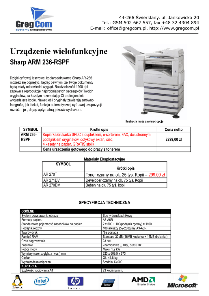 44-266 Świerklany, ul. Jankowicka 20 Tel.: GSM 502 667 557, fax +48 32 4304 894 E-mail: [email protected], http://www.gregcom.pl Urządzenie wielofunkcyjne Sharp ARM 236-RSPF Dzięki cyfrowej laserowej kopiarce/drukarce Sharp AR-236 możesz się odprężyć, będąc pewnym, że Twoje dokumenty będą miały odpowiedni wygląd. Rozdzielczość 1200 dpi zapewnia reprodukcję najdrobniejszych szczegółów Twoich oryginałów, za każdym razem dając Ci profesjonalnie wyglądające kopie. Nawet jeśli oryginały zawierają zarówno fotografie, jak i tekst, funkcja automatycznej cyfrowej ekspozycji rozróżni je , dając optymalną jakość wydrukom. Ilustracja może zawierać opcje SYMBOL ARM 236RSPF Krótki opis Kopiarka/drukarka SPLC z dupleksem, e-sorterem, FAX, dwustronnym podajnikiem oryginałów, dotykowy ekran, siec, 4 kasety na papier, GRATIS stolik Cena urządzenia gotowego do pracy z tonerem Cena netto 2299,00 zł Materiały Eksploatacyjne SYMBOL Krótki opis Toner czarny na ok. 25 tys. Kopii – 299,00 zł AR 270T AR 271DV AR 270DM Developer czarny na ok. 75 tys. Kopii Bęben na ok. 75 tyś. kopii SPECYFIKCJA TECHNICZNA OGÓLNE System powstawania obrazu Formaty papieru Standardowa pojemność zasobników na papier Podajnik ręczny Twardy dysk Pamięć RAM Czas nagrzewania Zasilanie Pobór mocy Wymiary (szer. x głęb. x wys.) mm Ciężar Wydajność miesięczna KOPIARKA Szybkość kopiowania A4 Suchy dwuskładnikowy A3-A6R 2 x 500 + 100(podajnik ręczny) = 1100 100 arkuszy (52-200g/m2)A3-A6R Nie posiada Standard 32MB (16MB kopiarka + 16MB drukarka) 23 sek. Znamionowe + 10%, 50/60 Hz Maks. 1,2 kW 623 x 609,5 x 673 Ok. 41,8 kg Średnia 13 000 23 kopii na min. 44-266 Świerklany, ul. Jankowicka 20 Tel.: GSM 502 667 557, fax +48 32 4304 894 E-mail: [email protected], http://www.gregcom.pl Szybkość kopiowania A3 Format oryginału Ekspozycja Pamięć RAM Rozdzielczość Odcienie szarości Zoom Zaprogramowane współczynniki odwzorowania Kopiowanie ciągłe Czas pierwszej kopii DRUKARKA SPLC (GDI) standard Szybkość drukowania A4 Rozdzielczość Pamięć RAM Interfejs Systemy operacyjne Język opisu strony Dostępne czcionki 12 kopii na min. Maks. A3 Auto/tekst/tekst, foto/foto/super foto(1200 dpi) Standard: 16MB 600 dpi, maks.: 1200 x 1200 dpi 256 25 - 400% 25,50,70,81,86,100,115,122,141,200,400 1-999 4,8 sek. (Sharp Printer Language with Compression) 23/27 ppm (Z ROPM), 15 ppm z czasem transferu z PC 600 dpi Standardowa 16MB, maks: 740MB Standard: USB 2.0, IEEE 1284 Windows 95/98/Me, WinNT4.0/2000/XP SPLC (GDI z kompresją JBIG) Z komputera Do powyższych cen należy doliczyć 22%VAT.