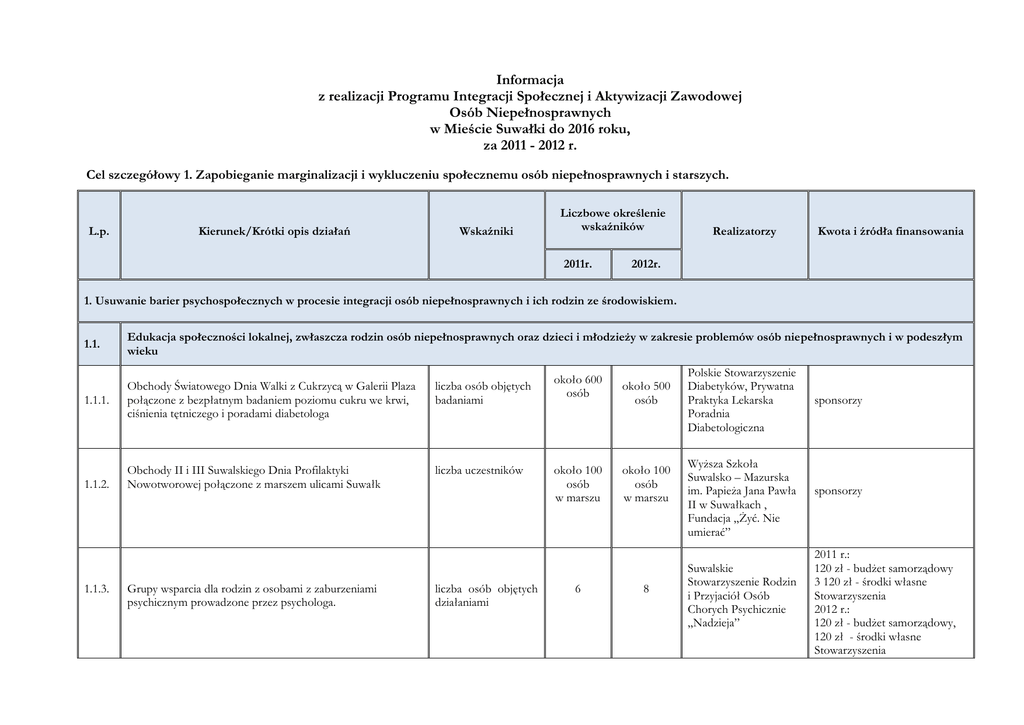 Informacja z realizacji Programu Integracji Społecznej i Aktywizacji Zawodowej Osób Niepełnosprawnych w Mieście Suwałki do 2016 roku, za 2011 - 2012 r. Cel szczegółowy 1. Zapobieganie marginalizacji i wykluczeniu społecznemu osób niepełnosprawnych i starszych. L.p. Kierunek/Krótki opis działań Wskaźniki Liczbowe określenie wskaźników 2011r. Realizatorzy Kwota i źródła finansowania 2012r. 1. Usuwanie barier psychospołecznych w procesie integracji osób niepełnosprawnych i ich rodzin ze środowiskiem. 1.1. Edukacja społeczności lokalnej, zwłaszcza rodzin osób niepełnosprawnych oraz dzieci i młodzieży w zakresie problemów osób niepełnosprawnych i w podeszłym wieku 1.1.1. Obchody Światowego Dnia Walki z Cukrzycą w Galerii Plaza połączone z bezpłatnym badaniem poziomu cukru we krwi, ciśnienia tętniczego i poradami diabetologa liczba osób objętych badaniami Obchody II i III Suwalskiego Dnia Profilaktyki Nowotworowej połączone z marszem ulicami Suwałk liczba uczestników 1.1.2. 1.1.3. Grupy wsparcia dla rodzin z osobami z zaburzeniami psychicznym prowadzone przez psychologa. liczba osób objętych działaniami około 600 osób około 100 osób w marszu 6 około 500 osób około 100 osób w marszu 8 Polskie Stowarzyszenie Diabetyków, Prywatna Praktyka Lekarska Poradnia Diabetologiczna Wyższa Szkoła Suwalsko – Mazurska im. Papieża Jana Pawła II w Suwałkach , Fundacja „Żyć. Nie umierać” Suwalskie Stowarzyszenie Rodzin i Przyjaciół Osób Chorych Psychicznie „Nadzieja” sponsorzy sponsorzy 2011 r.: 120 zł - budżet samorządowy 3 120 zł - środki własne Stowarzyszenia 2012 r.: 120 zł - budżet samorządowy, 120 zł - środki własne Stowarzyszenia 1.1.4. 1.1.5. „Akademia dla Rodziców” - zajęcia dla rodziców dzieci niepełnosprawnych mające na celu udzielenie instruktażu na temat terapii dzieci Realizacja tematów dotyczących problemów osób niepełnosprawnych i w podeszłym wieku realizowane w ramach programów nauczania, prowadzenie działalności informacyjnej, upowszechniającej wiedzę na temat problemów dzieci niepełnosprawnych i ich rodzin liczba osób objętych działaniami 7 - Stowarzyszenie na rzecz Osób z Autyzmem jednostki oświatowe (P1,P2,P3,P4,P5,P6,P7, P8, P10, SP4, SP6,SP7,SP9,SP11,G6, ZS1,ZS2,ZS3,ZS4,ZS6, ZS7,ZS8,ZS9, ZS10, ILO,ZST, SOSW1),PSSE jednostki oświatowe (P1,P2,P3,P4,P5,P6,P7, P8,P10,SP4,SP6,SP7,SP 9,SP11,G6,ZS1,ZS2,ZS 3,ZS4,ZS6,ZS7,ZS8,ZS 9,ZS10,ZST,ILO, ,SOSW1) jednostki oświatowe (P1,P2,P3,P4,P5,P6,P7, P8,P10,SP4,SP6,SP7,SP 9,SP11,ZS1,ZS2,ZS3,Z S4,ZS6,ZS7,ZS8,ZS9, ZS10,ZST, ILO,SOSW1) liczba osób objętych działaniami 6 486 7 954 Udział uczniów w zajęciach edukacyjnych kształtujących postawy tolerancji wobec osób niepełnosprawnych liczba osób objętych działaniami 5 892 5 265 Organizacja akcji charytatywnych liczba osób biorących udział w działaniach 8 471 7 930 1.1.8. Bieżąca współpraca terapeutów, pedagoga i psychologa z rodzinami uczestników środowiskowego domu samopomocy polegająca na wsparciu i pomocy w zakresie radzenia z osobami niepełnosprawnymi liczba osób objętych działaniami 40 44 1.2. Promocja działań na rzecz osób niepełnosprawnych z wykorzystaniem lokalnych środków masowego przekazu 1.2.1 Publikacje dotyczące bieżącej działalności organizacji pozarządowych: Polskiego Związku Głuchych, Polskiego Związku Emerytów Rencistów i Inwalidów, Klubu Kobiet po Mastektomii Amazonka, Stowarzyszenia Chorych na Stwardnienie Rozsiane, Fundacja „Żyć. Nie umierać”, Polskie Stowarzyszenie Diabetyków, Polski Związek Niewidomych 1.1.6. 1.1.7. liczba publikacji 6 23 MOPS Tygodnik Suwalski 2011 r.: 640 zł - środki własne Stowarzyszenia budżet samorządowy budżet samorządowy budżet samorządowy wydatki bieżące budżet centralny wydatki bieżące z budżetu samorządowego 2 1.2.2. Publikacje dotyczące działań III i IV edycji projektu „Od bierności do aktywności” realizowanego z udziałem osób niepełnosprawnych 1.3. Motywowanie do aktywności ze szczególnym uwzględnieniem form spędzania czasu wolnego poprzez kulturę, sztukę, sport, turystykę, rekreację i kulturę fizyczną. 1.3.1. Zorganizowano IV i V integracyjny bal andrzejkowy z udziałem osób niepełnosprawnych, uczestników środowiskowych domów samopomocy i warsztatów terapii zajęciowej z Województwa Podlaskiego i Warmińsko Mazurskiego 1.3.2. 1.3.3. 1.3.4. W ramach realizacji Projektu „Od bierności do aktywności” organizowano rodzinne imprezy integracyjne z udziałem osób niepełnosprawnych: piknik rodzinny, wycieczka turystyczna ze zwiedzaniem dóbr kultury oraz seans kinowy. Organizacja i udział uczestników Środowiskowego Domu Samopomocy w różnego rodzaju przedsięwzięciach o charakterze sportowym, kulturalnym, rekreacyjnym i turystycznym na terenie m. Suwałki jak i wyjazdowych do innych miast. Realizacja projektu „VII i VIII Animacje Teatralne” umożliwiającego seniorom i osobom niepełnosprawnym zaakceptować własną chorobę, przywrócić zdolności do aktywnego życia. liczba publikacji liczba uczestników 2 200 2 200 MOPS Stowarzyszenie Integracji Społecznej Alternatywa, MOPS MOPS liczba uczestników 289 190 liczba uczestników 45 44 MOPS 120 DPS „Kalina” w Suwałkach w partnerstwie ze Stowarzyszeniem Przyjaciół DPS „Kalina” w Suwałkach liczba uczestników 100 2011r.: 4 000 zł – EFS 2012r.: 5 000 zł. - EFS 2011 r.: 1 989 zł - PFRON 1 350 zł - udział własny ngo, 2012 r.: 3 000 zł PFRON, 2 019,82 zł – udział własny Stowarzyszenia 2011r.: 40 250 zł – EFS 2012r.: 26 .270 zł – EFS wydatki bieżące - budżet centralny 2011 r.: 3000 zł - budżet samorządowy 1 905,47 zł - środki własne Stowarzyszenia 2012 r. : 2 000 zł - budżet samorządowy, 1 205 zł – środki własne Stowarzyszenia 3 1.4. 1.4.1. 1.4.2. Działania o charakterze integracji międzypokoleniowej z udziałem dzieci i młodzieży, osó