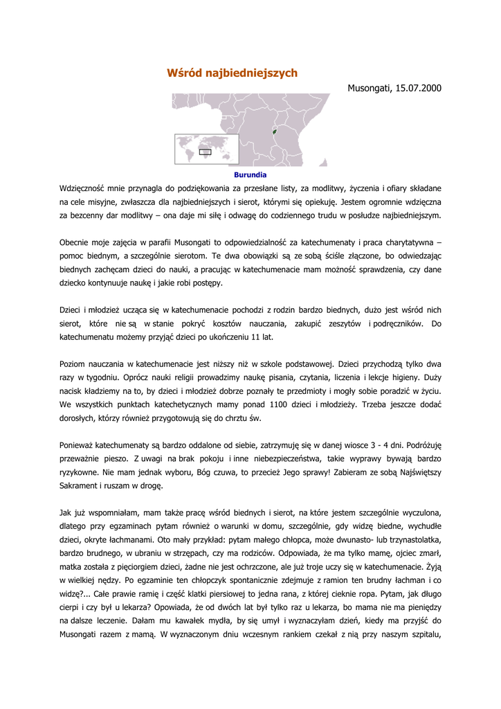 Wśród najbiedniejszych Musongati, 15.07.2000 Burundia Wdzięczność mnie przynagla do podziękowania za przesłane listy, za modlitwy, Ŝyczenia i ofiary składane na cele misyjne, zwłaszcza dla najbiedniejszych i sierot, którymi się opiekuję. Jestem ogromnie wdzięczna za bezcenny dar modlitwy – ona daje mi siłę i odwagę do codziennego trudu w posłudze najbiedniejszym. Obecnie moje zajęcia w parafii Musongati to odpowiedzialność za katechumenaty i praca charytatywna – pomoc biednym, a szczególnie sierotom. Te dwa obowiązki są ze sobą ściśle złączone, bo odwiedzając biednych zachęcam dzieci do nauki, a pracując w katechumenacie mam moŜność sprawdzenia, czy dane dziecko kontynuuje naukę i jakie robi postępy. Dzieci i młodzieŜ ucząca się w katechumenacie pochodzi z rodzin bardzo biednych, duŜo jest wśród nich sierot, które nie są w stanie pokryć kosztów nauczania, zakupić zeszytów i podręczników. Do katechumenatu moŜemy przyjąć dzieci po ukończeniu 11 lat. Poziom nauczania w katechumenacie jest niŜszy niŜ w szkole podstawowej. Dzieci przychodzą tylko dwa razy w tygodniu. Oprócz nauki religii prowadzimy naukę pisania, czytania, liczenia i lekcje higieny. DuŜy nacisk kładziemy na to, by dzieci i młodzieŜ dobrze poznały te przedmioty i mogły sobie poradzić w Ŝyciu. We wszystkich punktach katechetycznych mamy ponad 1100 dzieci i młodzieŜy. Trzeba jeszcze dodać dorosłych, którzy równieŜ przygotowują się do chrztu św. PoniewaŜ katechumenaty są bardzo oddalone od siebie, zatrzymuję się w danej wiosce 3 - 4 dni. PodróŜuję przewaŜnie pieszo. Z uwagi na brak pokoju i inne niebezpieczeństwa, takie wyprawy bywają bardzo ryzykowne. Nie mam jednak wyboru, Bóg czuwa, to przecieŜ Jego sprawy! Zabieram ze sobą Najświętszy Sakrament i ruszam w drogę. Jak juŜ wspomniałam, mam takŜe pracę wśród biednych i sierot, na które jestem szczególnie wyczulona, dlatego przy egzaminach pytam równieŜ o warunki w domu, szczególnie, gdy widzę biedne, wychudłe dzieci, okryte łachmanami. Oto mały przykład: pytam małego chłopca, moŜe dwunasto- lub trzynastolatka, bardzo brudnego, w ubraniu w strzępach, czy ma rodziców. Odpowiada, Ŝe ma tylko mamę, ojciec zmarł, matka została z pięciorgiem dzieci, Ŝadne nie jest ochrzczone, ale juŜ troje uczy się w katechumenacie. śyją w wielkiej nędzy. Po egzaminie ten chłopczyk spontanicznie zdejmuje z ramion ten brudny łachman i co widzę?... Całe prawie ramię i część klatki piersiowej to jedna rana, z której cieknie ropa. Pytam, jak długo cierpi i czy był u lekarza? Opowiada, Ŝe od dwóch lat był tylko raz u lekarza, bo mama nie ma pieniędzy na dalsze leczenie. Dałam mu kawałek mydła, by się umył i wyznaczyłam dzień, kiedy ma przyjść do Musongati razem z mamą. W wyznaczonym dniu wczesnym rankiem czekał z nią przy naszym szpitalu, czysty i szczęśliwy. Stan był powaŜny, bo to była nie tylko powierzchowna infekcja – jak myślałam – na ciele miał trzy duŜe rany aŜ do kości, z których sączyła się ropa. Siostry w szpitalu zrobiły, co było moŜliwe, ale z uwagi na powaŜny stan został odwieziony do szpitala w Gitedze, celem prześwietlenia. Wysyłając dziecko do szpitala trzeba je zaopatrzyć we wszystko: piŜamę, ubranie, koc, jedzenie na czas pobytu, a takŜe opłacić leczenie. Obecnie leczą go antybiotykami, ale nie wiadomo czy nie będzie trzeba odciąć rączki. Nie mogę sobie wyobrazić, jak to dziecko mogło przez 2 lata uczęszczać do katechumenatu z takimi ranami. Gdybym go nie egzaminowała, nie zapytała o rodzinę, nikt by się nim nie zainteresował. UwaŜam to za wielką łaskę, Ŝe mogłam mu pomóc . Cieszę się Ŝe św. Józef opiekował się bardzo Panem Jezusem, którego zabrałam ze sobą, i równieŜ mną w czasie wędrówek misyjnych w terenie najbardziej zagroŜonym. Słyszałam strzały, a nocą grupy uzbrojonych Ŝołnierzy, tych z lasu, przechodziły obok domu, w którym nocowałam i nic złego mnie nie spotkało. Proszę przyjąć szczere wyrazy wdzięczności za wszystkie ofiary przeznaczone na pomoc dla biednych. Dzięki nim mogę otrzeć wiele łez, złagodzić cierpienia i wywołać uśmiech na twarzy. Łączę serdeczne pozdrowienia i zapewniam o pamięci modlitewnej Zenobia, siostra karmelitanka Dzieciątka Jezus