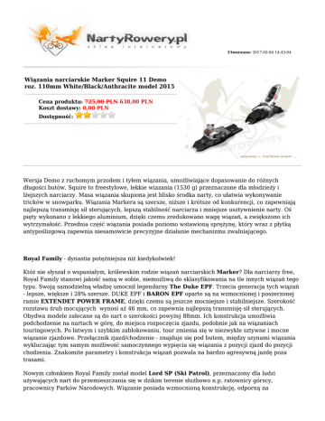 Utworzono: 2017-03-04 14:43:04 Wiązania narciarskie Marker Squire 11 Demo roz. 110mm White/Black/Anthracite model 2015 Cena produktu: 725,00 PLN 638,00 PLN Koszt dostawy: 0,00 PLN Dostępność: Wersja Demo z ruchomym przodem i tyłem wiązania, umożliwiające dopasowanie do różnych długości butów. Squire to freestylowe, lekkie wiazania (1530 g) przeznaczone dla młodzieży i lżejszych narciarzy. Masa wiązania skupiona jest blisko środka narty, co ułatwia wykonywanie tricków w snowparku. Wiązania Markera są szersze, niższe i krótsze od konkurencji, co zapewniają najlepszą transmisję sił sterujących, lepszą stabilność narciarza i mniejsze usztywnienie narty. Oś pięty wykonano z lekkiego aluminium, dzięki czemu zredukowano wagę wiązań, a zwiększono ich wytrzymałość. Przednia część wiązania posiada poziomo wstawioną sprężynę, który wraz z płytką antypoślizgową zapewnia niesamowicie precyzyjne działanie mechanizmu zwalniającego. Royal Family - dynastia potężniejsza niż kiedykolwiek! Któż nie słyszał o wspaniałym, królewskim rodzie wiązań narciarskich Marker? Dla narciarzy free, Royal Family stanowi jakość samą w sobie, niemożliwą do sklasyfikowania na tle innych wiązań tego typu. Swoją samodzielną władzę umocnił legendarny The Duke EPF. Trzecia generacja tych wiązań - lepsze, większe i 28% szersze. DUKE EPF i BARON EPF oparte są na wzmocnionej i poszerzonej ramie EXTENDET POWER FRAME, dzięki czemu są jeszcze mocniejsze i stabilniejsze. Szerokość rozstawu śrub mocujących wynosi aż 46 mm, co zapewnia najlepszą transmisję sił sterujących. Obydwa modele zalecane są do nart o szerokości powyżej 88mm. Ich konstrukcja umożliwia podchodzenie na nartach w górę, do miejsca rozpoczęcia zjazdu, podobnie jak na wiązaniach touringowych. Po łatwym i szybkim zablokowaniu, tour zmienia się w niezwykle sztywne i mocne wiązanie zjazdowe. Przełącznik zjazd/chodzenie - znajduje się pod butem, między szynami wiązania wykluczając tym samym możliwość samoczynnego wypięcia się wiązania z pozycji zjazd do pozycji chodzenia. Znakomite parametry i konstrukcja wiązań pozwala na bardzo agresywną jazdę poza trasami. Nowym członkiem Royal Family został model Lord SP (Ski Patrol), przeznaczony dla ludzi używających nart do przemieszczania się w dzikim terenie służbowo n.p. ratownicy górscy, pracownicy Parków Narodowych. Wiązanie posiada wzmocnioną konstrukcję, odporną na uszkodzenia, jego przód ma regulację dostosowującą szczęki do różnych rodzajów butów narciarskich. Lord SP, na największych targach sprzętu sportowego ISPO 2013 w Monachium, zwyciężył w kategorii Wiązania Narciarskie. Jester PRO to najlepsza broń dla zagorzałych, profesjonalnych narciarzy FREE. Posiada oryginalny design i więcej mocy niż kiedykolwiek dzięki szerszej płycie bazowej i na nowo zaprojektowanej piętce. Konstrukcja pięty zapewnia doskonałe trzymanie podczas ostrej jazdy poza trasami, gdyż pietka "próbuje" ciągle dociskać buta do narty, minimalizując przy tym możliwość przypadkowego wypięcia się buta z wiązania. Nowo zaprojektowana przednia część wiązania posiada poziomo wstawioną sprężynę, który wraz z płytką antypoślizgową, ustawioną pod kątem 5%, zapewnia niesamowicie precyzyjne działanie mechanizmu zwalniającego oraz przekaz sił, aby zminimalizować ryzyko przypadkowego wypięcia buta. Aluminiowy most na górze zapewnia dodatkowe usztywnienie i redukcję wagi, ale również pozwala na łatwe pozbycie się przyklejonego do podeszwy buta śniegu. The Jester i Griffon to lekkie i mocne wiązania freeridowo-freestylowe, o masie skupionej blisko środka narty, co ułatwia wykonywanie tricków w snowparku. Dla młodzieży przeznaczone są lekkie (1530g) freestylowe wiązania Squire. Wiązania Jester, Griffon, Squire występują w wersji Schizo. Jest to mechanizm pozwalający na zmianę położenia buta na narcie, w zakresie 60 mm. Zmianę można dokonać bez wypinania buta z wiązania. Schizo daje Ci możliwość ustawienie pozycji wiązania w zależności od stylu jazdy. Prosty i szybki sposób na przestawienie się z freeridu na freestyle! Wiązania Markera są szersze, niższe i krótsze od konkurencji. Większa szerokość zapewnia najlepszą transmisję sił sterujących. Obniżenie środka ciężkości poprawia stabilność narciarza, a mniejsza długość wiązania to mniejsze usztywnienie narty. Producent Marker Rozmiar 90, 110 Kolekcja zima 2014/15 Płeć Kolory Siła wypięcia Adres: http://nartyrowery.pl/ Damskie, Męskie White/Black/Anthracite Telefon: 34 365 66 09 Email: [email protected] Gadu-Gadu: Skype: