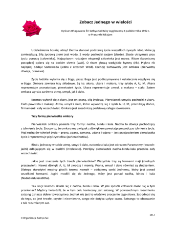 Zobacz Jednego w wielości Dyskurs Bhagawana Śri Sathya Sai Baby wygłoszony 4 października 1992 r. w Prasanthi Nilajam Ucieleśnienia boskiej atmy! Ziemia stanowi podstawę życia wszystkich żywych istot, które ją zamieszkują. Siłą życiową ziemi jest woda. Z wody pochodzi sasjam (zboże). Zboże utrzymuje przy życiu puruszę (człowieka). Najwyższym rodzajem ekspresji człowieka jest mowa. Ritam (kosmiczny porządek) opiera się na boskim słowie (wak). O ritam głoszą wedyjskie hymny (rik). Piękno rik najlepiej oddaje Samaweda (jedna z czterech Wed). Esencją Samawedy jest omkara (pierwotny dźwięk, pranawa). Życie ludzkie wyłania się z Boga, przez Boga jest podtrzymywane i ostatecznie rozpływa się w Bogu. Omkara zawiera trzy składowe. Są to: akara, ukara i makara, trzy sylaby A, U, M. Akara reprezentuje pranatattwę, pierwiastek życia. Ukara reprezentuje umysł, a makara – ciało. Zatem omkara wyraża zarówno atmę, umysł, jak i ciało. Kosmos wyłonił się z akary, jest on praną, siłą życiową. Pierwiastek umysłu pochodzi z ukary. Ciało powstało z makary. Atma, umysł i ciało, które wywodzą się z sylab A, U, M, przenikają słońce, firmament i cały wszechświat. Omkara jest zasadniczą podstawą całego stworzenia. Trzy formy pierwiastka omkary Pierwiastek omkary posiada trzy formy: nadha, bindu i kala. Nadha to dźwięk pochodzący z tchnienia życia. Znaczy to, że omkara ma związek z dźwiękiem powstającym podczas tchnienia życia. Pięć rodzajów tchnień życia – prana, apana, samana, udana i wjana – jest przejawieniem pierwiastka życia i reprezentuje pięć żywiołów (pańczabhutów). Bindu jednoczy w sobie atmę, umysł i ciało, natomiast kala jest obrazem Paramatmy (wszechjaźni) odbijającym się w buddhi (intelekcie). Potrójny pierwiastek nadha-bindu-kala przenika cały wszechświat. Jakie jest znaczenie tych trzech pierwiastków? Wszystkie trzy są formami maji (złudnych przejawień). Nawet dźwięki A, U, M zwodzą i mamią. Prana, umysł i ciało również są złudzeniem. Dlatego starożytni mędrcy głosili: tasmai namah – oddajemy cześć Jednemu, który jest ponad wszelkimi formami. Jogini modlili się do Jednego, który jest ponad nadha, bindu i kala (Nadabindukalatitha). Tak więc kosmos składa się z nadha, bindu i kala. W jaki sposób człowiek może się o tym przekonać? Mędrcy twierdzili, że w tym celu konieczny jest satsang. W powszechnym rozumieniu satsang oznacza dobre towarzystwo. Jednak nie jest to właściwe znaczenie tego słowa. Sat odnosi się do tego, co jest trwałe, czyste i niezmienne, czego nie dotyka upływ czasu. Satsanga to obcowanie z tak rozumianym sat. str. 1 © Organizacja Sathya Sai Sat odnosi się zatem do kosmicznej świadomości obecnej we wszystkich żywych istotach. Świadomość jednostki nie może być nazywana sat, bowiem sat dotyczy zbiorowej kosmicznej świadomości obecnej we wszystkich żywych istotach. Satsang to kultywowanie przez jednostkę związku z tą kosmiczną świadomością. Dla większości ludzi satsang polega na zbieraniu się razem z innymi jednostkami aby modlić się lub wykonywać inne akty oddania. Jednak to nie o to chodzi. Satsang to dążenie człowieka do zjednoczenia z wszechprzenikającą i wszechmocną powszechną świadomością. Wewnętrzne znaczenie mohy Na drodze do osiągnięcia satsangu stoi jednak pewna przeszkoda, znana jako moha. Nie należy rozumieć mohy jako przywiązania do bogactwa, własności czy dzieci. Człowiek będzie mógł pozbyć się mohy, jeśli zrozumie jej wewnętrzne znaczenie. Słowo ‘moha’ pochodzi od ‘ma’, co znaczy ‘skończony’ i ‘oha’, którego znaczeniem jest „wyobrażanie czegoś, co nie istnieje”. Zatem ‘moha’ znaczy „ograniczone wyobrażenie nierzeczywistego jako rzeczywistego”. Jest to oddzielone od jakiegokolwiek wyobrażenia boskości. Moha całkowicie odnosi się do świata zjawiskowego, prakritam. Związana jest z kamą, pragnieniem. Kama oznacza przemijającą przyjemność opartą na doczesnych pragnieniach. Trwałe szczęście można uzyskać wyłącznie z boskich uczuć związanych z czajntanją (świadomością kosmiczną). Ta świadomość opiera się na transcendentalnej podstawie, jaką jest sat-czit-ananda. Sat jest tym, co wieczne – jest trwałym, niezmiennym bytem. Czit oznacza paripurna dżnianę – całkowitą, pełną świadomość lub wiedzę. Czit jest kompletną świadomością tego, co reprezentuje sat. Czit i sat wykraczają poza świat zjawiskowy, są jednak obecne w przedmiotach tego świata. Jak więc odróżnić te transcendentalne byty od rzeczy materialnych? Składnik transcendentalny w świecie zjawiskowym trzeba rozpoznać jako odbite obrazy, podobne do odbicia słońca w garnku z wodą. Ciało przypomina naczynie, a w nim Bóg obecny jest jako odbicie, tak jak niezmienne słońce odbija się w przemijającym naczyniu. Bóg obecny jest wewnątrz i na zewnątrz – wszędzie w całym kosmosie. W ciele, które można porównać do naczynia, odbicie pierwiastka życia, czyli atmy, można ujrzeć w umyśle, który odpowiada wodzie w naczyniu. Podczas gdy ciało i umysł są ograniczone, atma jest nieskończona. Wszystkie modły, dżapy, jagi i jadżnie, jakie obecnie odprawiają ludzie, mają ograniczony cel zdobycia przemijających przyjemności i nagród. Dotyczą życia, które samo w sobie jest nietrwałe. Umysł i świat zjawiskowy są równie nietrwałe. Jak rozpoznać jedność w wielości? Wszechświat nazywany jest prapańczą – manifestacją pańczabhutów, pięciu podstawowych żywiołów: eteru, powietrza, ognia, wody i ziemi. Ponieważ te żywioły nie są trwałe i podlegają zmianom, całe ludzkie życie powiązane jest z nietrwałymi rzeczami i ulotnymi przyjemnościami. W jaki sposób osiągnąć to, co jest trwałe, w obszarze tego, co jest nietrwałe? Należy zburzyć mur oddzielający trwałe od nietrwałego i rozpoznać niezm