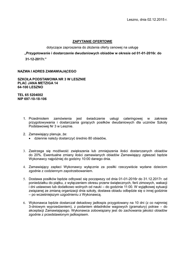 Leszno, dnia 02.12.2015 r. ZAPYTANIE OFERTOWE dotyczące zaproszenia do złożenia oferty cenowej na usługę „Przygotowanie i dostarczenie dwudaniowych obiadów w okresie od 01-01-2016r. do 31-12-2017r.” NAZWA I ADRES ZAMAWIAJĄCEGO SZKOŁA PODSTAWOWA NR 3 W LESZNIE PLAC JANA METZIGA 14 64-100 LESZNO TEL 65 5204002 NIP 697-10-18-106 1. Przedmiotem zamówienia jest świadczenie usługi cateringowej w zakresie przygotowywania i dostarczania gorących posiłków dwudaniowych dla uczniów Szkoły Podstawowej Nr 3 w Lesznie. 2. Zamawiający planuje, że: dziennie należy dostarczyć średnio 80 obiadów, Zastrzega się możliwość zwiększenia lub zmniejszenia ilości dostarczanych obiadów do 20%. Ewentualne zmiany ilości zamawianych obiadów Zamawiający zgłaszać będzie Wykonawcy najpóźniej do godziny 10:00 danego dnia. Zamawiający zapłaci Wykonawcy wyłącznie za posiłki rzeczywiście wydane dzieciom zgodnie z codziennym zapotrzebowaniem. Dostawa posiłków będzie odbywać się począwszy od dnia 01-01-2016r do 31.12.2017r. od poniedziałku do piątku, z wyłączeniem okresu przerw świątecznych, ferii zimowych, wakacji i dni ustawowo lub dodatkowo wolnych od nauki – do godzinie 11:00. W wyjątkowej sytuacji związanej ze zmianą organizacji dnia szkoły, dostawa obiadu odbędzie się o innej godzinie – po wcześniejszym uzgodnieniu z Wykonawcą. Wykonawca będzie dostarczał dekadowy jadłospis przygotowany na 10 dni (z co najmniej 3-dniowym wyprzedzeniem), z podaniem składników wagowych (gramatury) potraw – do akceptacji Zamawiającego. Wykonawca zobowiązany jest do zachowania jakości obiadów zgodnie z przedstawionym jadłospisem. Wykonawca zobowiązany jest do przygotowywania i dostarczania posiłków o najwyższym standardzie, na bazie produktów najwyższej jakości i bezpieczeństwa zgodnie z normami HACCP oraz ustawą z dnia 25 sierpnia 2006 r. o bezpieczeństwie żywności i żywienia (Dz. U. z 2006 r. Nr 171, poz. 1225 z późn. zm.), ze szczególnym uwzględnieniem art. 52c ust. 1 ustawy obowiązującego od 1 września 2015 roku. Przy planowaniu posiłków należy uwzględnić zalecaną wartość energetyczną, wielkość posiłków oraz normy produktów dla uczniów w wieku 6-13 lat (szkoła podstawowa) Wyklucza się posiłki sporządzane na bazie półproduktów oraz na bazie Fast Food lub mrożonych potraw. Obiad musi spełniać następujące warunki ilościowe: w dekadzie Wykonawca będzie przygotowywał: 5 x zupę i 5 x drugie danie, zupa: gramatura – ok. 350-450 ml pieczywo – 50 g drugie danie: sztuka mięsa / drób / ryby – 100 g kotlet mielony, pulpet, klops – 100 g ziemniaki, kasza, ryż, makaron – 150 g surówka / warzywa gotowane – 150 g pierogi, naleśniki, krokiety itp. - 400 g kompot – 200 ml 10. Posiłki muszą spełniać następujące warunki jakościowe: jadłospis musi być urozmaicony, nie dopuszcza się powtarzania rodzajowo tych samych potraw w ciągu 2 tygodni, w dekadzie musi być dostarczone, co najmniej 3 razy drugie danie mięsne lub rybne wraz z surówką, potrawy powinny być lekkostrawne, przygotowane z surowców wysokiej jakości, świeżych, naturalnych, mało przetworzonych, z ograniczoną ilością substancji dodatkowych – konserwujących, zagęszczających, barwiących lub sztucznie aromatyzowanych, w jadłospisie powinny przeważać potrawy gotowane, pieczone i duszone, okazjonalnie smażone, do przygotowania posiłków zalecane jest: stosowanie tłuszczów roślinnych (ograniczone stosowanie tłuszczów zwierzęcych), stosowanie dużej ilości warzyw i owoców, w tym także nasion roślin strączkowych, różnego rodzaju kasz, umiarkowane stosowanie jaj, cukru i soli, zupy muszą być przygotowane na wywarze warzywno-mięsnym, ważna jest estetyka potraw i posiłków , wartość odżywcza, a nie cena 11. Transport posiłków musi odbywać się w specjalistycznych termosach gwarantujących utrzymanie odpowiedniej temperatury i jakości przewożonych potraw (termosy powinny być dublowane tj. przy dostawie obiadu pełne wymieniane na puste), środkami transportu przystosowanymi do przewozu żywności. 12. Dostarczanie posiłków z miejsca produkcji do pomieszczeń dystrybucji w szkole realizowane będzie przez Wykonawcę na jego koszt. 13. Zamawiający posiada własne naczynia (talerze, kubki, sztućce). 14. Zamawiający przyjmuje na siebie wszelkie sprawy organizacyjne związane z bezpośrednim wydawaniem posiłków dzieciom korzystającym z usług stołówki szkolnej. 15. Koszty związane z wydawaniem obiadów, myciem naczyń i termosów, sprzątaniem stołówki ponosić będzie Zamawiający – nie należy tych kosztów ujmować do kalkulacji ceny obiadu. Dyrektor Szkoły Załączniki: Nr 1 – zapytanie o cenę obiadu dla uczniów Nr 2 - potwierdzenie wykonywanych usług