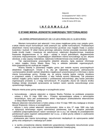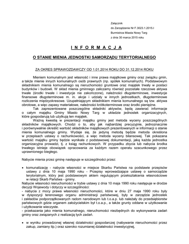 Załącznik do Zarządzenie Nr F.3023.1.2015.I Burmistrza Miasta Nowy Targ z dnia 30 marca 2015 roku I N F O R M A C J A O STANIE MIENIA JEDNOSTKI SAMORZĄDU TERYTORIALNEGO ZA OKRES SPRAWOZDAWCZY OD 1.01.2014 ROKU DO 31.12.2014 ROKU Mieniem komunalnym jest własność i inne prawa majątkowe gminy oraz związku gmin, a także mienie innych komunalnych osób prawnych (np. spółek komunalnych). Podstawowym składnikiem mienia komunalnego są nieruchomości gruntowe oraz majątek trwały w postaci budynków i budowli. W skład mienia gminnego zaliczamy również pozostałe rzeczowe aktywa trwałe (środki trwałe i inwestycje nie zakończone), należności długoterminowe, inwestycje finansowe długoterminowe m. in. akcje i udziały w innych jednostkach, długoterminowe rozliczenia międzyokresowe. Uzupełniającym składnikiem mienia komunalnego są tzw. aktywa obrotowe, a więc zapasy materiałowe, należności krótkoterminowe oraz środki pieniężne. Tak zaprezentowane poszczególne składniki aktywów, będą zawierać informacje o całym majątku Gminy Miasto Nowy Targ w układzie jednostek organizacyjnych, które gospodarują lub użytkują ten majątek. Ważną kwestią w prezentacji majątku gminy jest metoda wyceny poszczególnych składników majątkowych. Chodzi o to, aby jak najbardziej precyzyjnie, jednoznacznie i porównywalnie określić wartość składników majątkowych prezentowanych w informacji o stanie mienia komunalnego gminy. Wydaje się, że jedyną metodą będzie metoda określona w przepisach ustawy o rachunkowości, a więc metoda wyceny bilansowej. Tak pokazana wartość majątku gminy będzie wynikała z podstawowej dokumentacji, jaką każda jednostka organizacyjna prowadzi, tj. z ksiąg rachunkowych. W przypadku zbycia lub nabycia środka trwałego istnieje obowiązek opracowania za każdym razem operatu szacunkowego przez uprawnionego biegłego. Nabycie mienia przez gminę następuje w szczególności przez: komunalizację - nabycie własności w miejsce Skarbu Państwa na podstawie przepisów ustawy z dnia 10 maja 1990 roku - Przepisy wprowadzające ustawę o samorządzie terytorialnym, który jest podstawowym aktem regulującym przekształcenia własnościowe w relacji Skarb Państwa - gminy. Nabycie własności nieruchomości w trybie ustawy z dnia 10 maja 1990 roku następuje w drodze decyzji Wojewody i dotyczy w szczególności: - nabycia z mocy prawa własności nieruchomości, które w dniu 27 maja 1990 roku były w dyspozycji terenowego organu administracji państwowej, były w zarządzie jednostek i zakładów podporządkowanych radom narodowym lub t.o.a.p. lub należały do przedsiębiorstw państwowych gdzie organem założycielskim był t.o.a.p., a także grunty oddane w użytkowanie i użytkowanie wieczyste. - przekazania jako mienia komunalnego, nieruchomości niezbędnych do wykonywania zadań gminy oraz związanych z realizacją tych zadań. w wyniku prowadzonej własnej działalności gospodarczej (nabywanie nieruchomości przez zakup, zamiany itp.) oraz szeroko rozumianej działalności inwestycyjnej, na podstawie decyzji administracyjnych (np. wywłaszczenie, decyzje ZRID, nabywanie gruntu pod drogi przy zatwierdzaniu podziałów nieruchomości) oraz innych czynności prawnych (np. pierwokup, zasiedzenie), innych przepisów - np.: - art. 104 ustawy z dnia 7 września 1991 r. o systemie oświaty (zmienionej ustawą z dnia 3 grudnia 1993 r. ) dot. przejęcia przedszkoli, szkół podstawowych; - art. 13 ustawy z dnia 19 października 1991 roku o gospodarowaniu nieruchomościami rolnymi Skarbu Państwa (zmieniony ustawą z dnia 21 stycznia 2000 roku o zmianie niektórych ustaw związanych z funkcjonowaniem administracji publicznej), gdzie gminy z mocy prawa stały się właścicielem z dniem 1 lipca 2000 roku nieruchomości rolnych nie przekazanych do Zasobu lub Agencji Własności Rolnej Skarbu Państwa. - art. 73 ustawy z dnia 13 października 1998 roku - Przepisy wprowadzające ustawy reformujące administrację publiczną, gdzie gminy z mocy prawa stały się właścicielem z dniem 1 stycznia 1999 roku ulic pozostających we władaniu gminy, a nie stanowiących ich hipotecznej własności. STAN MIENIA Gmina Miasto Nowy Targ na dzień 31 grudnia 2014 roku dysponuje nieruchomościami zabudowanymi i nie zabudowanymi o łącznej powierzchni 421 ha 42 a 05 m2, z czego do 392 ha 87 a 24 m2 posiada uregulowane prawo własności, a w stosunku do dalszych 28 ha 54 a 81 m2 prowadzi się postępowanie komunalizacyjne. Postępowanie komunalizacyjne dotyczy w szczególności ulic miejskich. Gminny zasób nieruchomości obejmuje wszystkie grunty nie oddane w użytkowanie wieczyste, co stanowi 73,6 % posiadanych terenów, a powierzchniowo wynosi 310,32 ha. Prawa do nieruchomości zostały przedstawione w tabeli nr 1 wraz z zagospodarowaniem gruntów komunalnych wg form władania oraz ich szacunkową wartością rynkową - około 124 mln zł. Wartość obiektów budowlanych znajdujących się na tych gruntach szacuje się na około 170,8 mln zł, w tym: 56 różnych budynków w tym 26 obiektów użyteczności publicznej oraz 8 lokali użytkowych i 344 lokali mieszkalnych w 36 domach wielorodzinnych oraz 9 lokali mieszkalnych w innych budynkach. Obecnie Gmina jest właścicielem 392,87 ha, gdzie 295,48 ha to grunty pozyskane na drodze komunalizacji, stanowiące 75 % całej powierzchni. Natomiast 25 % tj. 97,39 ha nabyto na drodze innych czynności administracyjno – prawnych, głównie kupionych umowami notarialnymi. W 2014 roku nabyto teren o łącznej powierzchni 8 ha 47 a 88 m2, głównie na 2 podstawie decyzji komunalizacyjnych - 7 ha 74 a 46 m (w tym tereny kolejowe o pow. ponad 2 7,5 ha). Pozostałe 73 a 42 m na drodze notarialnych umów kupna lub innych postępowań administracyjnych. Stan gruntów wg sposobu nabycia/zbycia, w tym wartość i powierzchnię gruntów, przedstawiono w tabeli nr 2. Jednym z podstawowych zadań gmin określonych w u