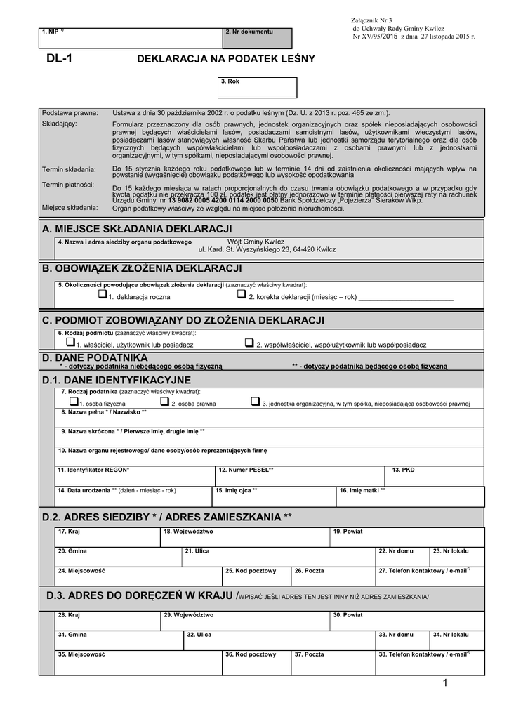1. NIP 1) Załącznik Nr 3 do Uchwały Rady Gminy Kwilcz Nr XV/95/2015 z dnia 27 listopada 2015 r. 2. Nr dokumentu DEKLARACJA NA PODATEK LEŚNY DL-1 3. Rok Podstawa prawna: Ustawa z dnia 30 października 2002 r. o podatku leśnym (Dz. U. z 2013 r. poz. 465 ze zm.). Składający: Formularz przeznaczony dla osób prawnych, jednostek organizacyjnych oraz spółek nieposiadających osobowości prawnej będących właścicielami lasów, posiadaczami samoistnymi lasów, użytkownikami wieczystymi lasów, posiadaczami lasów stanowiących własność Skarbu Państwa lub jednostki samorządu terytorialnego oraz dla osób fizycznych będących współwłaścicielami lub współposiadaczami z osobami prawnymi lub z jednostkami organizacyjnymi, w tym spółkami, nieposiadającymi osobowości prawnej. Termin składania: Do 15 stycznia każdego roku podatkowego lub w terminie 14 dni od zaistnienia okoliczności mających wpływ na powstanie (wygaśnięcie) obowiązku podatkowego lub wysokość opodatkowania Termin płatności: Miejsce składania: Do 15 każdego miesiąca w ratach proporcjonalnych do czasu trwania obowiązku podatkowego a w przypadku gdy kwota podatku nie przekracza 100 zł, podatek jest płatny jednorazowo w terminie płatności pierwszej raty na rachunek Urzędu Gminy nr 13 9082 0005 4200 0114 2000 0050 Bank Spółdzielczy „Pojezierza” Sieraków Wlkp. Organ podatkowy właściwy ze względu na miejsce położenia nieruchomości. A. MIEJSCE SKŁADANIA DEKLARACJI 4. Nazwa i adres siedziby organu podatkowego Wójt Gminy Kwilcz ul. Kard. St. Wyszyńskiego 23, 64-420 Kwilcz B. OBOWIĄZEK ZŁOŻENIA DEKLARACJI 5. Okoliczności powodujące obowiązek złożenia deklaracji (zaznaczyć właściwy kwadrat): 1. deklaracja roczna 2. korekta deklaracji (miesiąc – rok) _________________________ C. PODMIOT ZOBOWIĄZANY DO ZŁOŻENIA DEKLARACJI …_............................................______________ 6. Rodzaj podmiotu (zaznaczyć właściwy kwadrat): 1. właściciel, użytkownik lub posiadacz 2. współwłaściciel, współużytkownik lub współposiadacz D. DANE PODATNIKA * - dotyczy podatnika niebędącego osobą fizyczną ** - dotyczy podatnika będącego osobą fizyczną D.1. DANE IDENTYFIKACYJNE 7. Rodzaj podatnika (zaznaczyć właściwy kwadrat): 1. osoba fizyczna 8. Nazwa pełna * / Nazwisko ** 2. osoba prawna 3. jednostka organizacyjna, w tym spółka, nieposiadająca osobowości prawnej 9. Nazwa skrócona * / Pierwsze Imię, drugie imię ** 10. Nazwa organu rejestrowego/ dane osoby/osób reprezentujących firmę 11. Identyfikator REGON* 12. Numer PESEL** 14. Data urodzenia ** (dzień - miesiąc - rok) 13. PKD 15. Imię ojca ** 16. Imię matki ** D.2. ADRES SIEDZIBY * / ADRES ZAMIESZKANIA ** 17. Kraj 20. Gmina 18. Województwo 19. Powiat 21. Ulica 24. Miejscowość 22. Nr domu 25. Kod pocztowy 23. Nr lokalu 27. Telefon kontaktowy / e-mail2) 26. Poczta D.3. ADRES DO DORĘCZEŃ W KRAJU /WPISAĆ JEŚLI ADRES TEN JEST INNY NIŻ ADRES ZAMIESZKANIA/ 28. Kraj 31. Gmina 35. Miejscowość 29. Województwo 30. Powiat 32. Ulica 33. Nr domu 36. Kod pocztowy 37. Poczta 34. Nr lokalu 38. Telefon kontaktowy / e-mail2) 1 E. DANE DOTYCZĄCE PRZEDMIOTÓW OPODATKOWANIA 39 . Miejsce/a (adres/y) położenia lasu oraz numer/y działek i numery ksiąg wieczystych 1. – jedna nieruchomość leśna ................................................................................................................................................ ( należy podać adres i numery działek i ksiąg wieczystych) 2. – więcej niż jedna nieruchomość leśna ( należy wypełnić załącznik ZL-1 dla każdej nieruchomości leśnej ze względu na adres położenia, natomiast w deklaracji wykazać należy wszystkie nieruchomości leśne łącznie ) 40 . Liczba dołączonych do niniejszej deklaracji załączników ZL-1 ……………………………………………. 41. Podstawa powstania obowiązku podatkowego Akt notarialny ……………………………………………………………………………………………………………..………. z dnia ……………………………………….. Inne ………………………………………………………………………………………………………………………………….z dnia ………….……..…………………….. E.1. DANE DOTYCZĄCE LASÓW NIE PODLEGAJĄCYCH ZWOLNIENIU Powierzchnia w ha z dokładnością do 1m2 Rodzaj gruntów leśnych Stawka podatku Kwota podatku zł, gr 1. Lasy 42. 43. 44. 2. Lasy wchodzące w skład rezerwatów przyrody 45. 46. 47. 3. Lasy wchodzące w skład parków narodowych 48. 49. 50. F. ŁĄCZNA KWOTA PODATKU DO ZAPŁATY (po zaokrągleniu do pełnych złotych) 3) Kwota podatku 51. Suma kwot z poz. 44, 47, 50 F.1 WYSOKOŚĆ POSZCZEGÓLNYCH RAT PODATKU (kwota poszczególnych rat po zaokrągleniu do pełnych złotych, w przypadku gdy kwota podatku nie przekracza 100 zł, podatek jest płatny jednorazowo w terminie płatności pierwszej raty) 52. 15.01 53. 15.02 54. 15.03 55. 15.04 56. 15.05 57. 15.06 58. 15.07 59. 15.08 60. 15.09 61. 15.10 62. 15.11 63. 15.12 G. DANE DOTYCZĄCE PRZEDMIOTÓW OPODATKOWANIA PODLEGAJĄCYCH ZWOLNIENIU Tytuł prawny zwolnienia Powierzchnia w ha 2 z dokładnością do 1m Art.7 ust. 1 pkt 1- lasy z drzewostanem w wieku do 40 lat 64. Art. 7ust.1 pkt 2 – lasy wpisane indywidualnie do rejestru zabytków 65. Inne (podać tytuł i podstawę prawną zwolnienia) 66. 67. 68. 69. 70. 71. 2 H. NUMER RACHUNKU BANKOWEGO, na który dokonany zostanie zwrot ewentualnej nadpłaty2) 72. Nazwa banku 73. Nr rachunku I. PODPIS PODATNIKA / OSOBY/OSÓB REPREZENTUJĄCYCH PODATNIKA 74. Imię 75. Nazwisko 76. Data wypełnienia deklaracji (dzień - miesiąc - rok) 77. Podpis (pieczęć) podatnika / osoby reprezentującej podatnika 78. Imię 79. Nazwisko 80. Data wypełnienia deklaracji (dzień - miesiąc - rok) 81. Podpis (pieczęć) podatnika / osoby reprezentującej podatnika 8