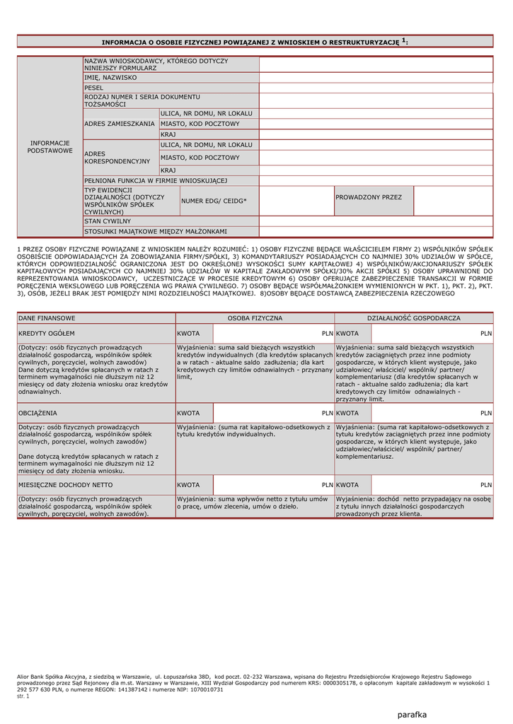 INFORMACJA O OSOBIE FIZYCZNEJ POWIĄZANEJ Z WNIOSKIEM O RESTRUKTURYZACJĘ 1: NAZWA WNIOSKODAWCY, KTÓREGO DOTYCZY NINIEJSZY FORMULARZ IMIĘ, NAZWISKO PESEL RODZAJ NUMER I SERIA DOKUMENTU TOŻSAMOŚCI ULICA, NR DOMU, NR LOKALU ADRES ZAMIESZKANIA MIASTO, KOD POCZTOWY KRAJ INFORMACJE PODSTAWOWE ULICA, NR DOMU, NR LOKALU ADRES KORESPONDENCYJNY MIASTO, KOD POCZTOWY KRAJ PEŁNIONA FUNKCJA W FIRMIE WNIOSKUJĄCEJ TYP EWIDENCJI DZIAŁALNOŚCI (DOTYCZY WSPÓLNIKÓW SPÓŁEK CYWILNYCH) PROWADZONY PRZEZ NUMER EDG/ CEIDG* STAN CYWILNY STOSUNKI MAJĄTKOWE MIĘDZY MAŁŻONKAMI 1 PRZEZ OSOBY FIZYCZNE POWIĄZANE Z WNIOSKIEM NALEŻY ROZUMIEĆ: 1) OSOBY FIZYCZNE BĘDĄCE WŁAŚCICIELEM FIRMY 2) WSPÓLNIKÓW SPÓŁEK OSOBIŚCIE ODPOWIADAJĄCYCH ZA ZOBOWIĄZANIA FIRMY/SPÓŁKI, 3) KOMANDYTARIUSZY POSIADAJĄCYCH CO NAJMNIEJ 30% UDZIAŁÓW W SPÓŁCE, KTÓRYCH ODPOWIEDZIALNOŚĆ OGRANICZONA JEST DO OKREŚLONEJ WYSOKOŚCI SUMY KAPITAŁOWEJ 4) WSPÓLNIKÓW/AKCJONARIUSZY SPÓŁEK KAPITAŁOWYCH POSIADAJĄCYCH CO NAJMNIEJ 30% UDZIAŁÓW W KAPITALE ZAKŁADOWYM SPÓŁKI/30% AKCJI SPÓŁKI 5) OSOBY UPRAWNIONE DO REPREZENTOWANIA WNIOSKODAWCY, UCZESTNICZĄCE W PROCESIE KREDYTOWYM 6) OSOBY OFERUJĄCE ZABEZPIECZENIE TRANSAKCJI W FORMIE PORĘCZENIA WEKSLOWEGO LUB PORĘCZENIA WG PRAWA CYWILNEGO. 7) OSOBY BĘDĄCE WSPÓŁMAŁŻONKIEM WYMIENIONYCH W PKT. 1), PKT. 2), PKT. 3), OSÓB, JEŻELI BRAK JEST POMIĘDZY NIMI ROZDZIELNOŚCI MAJĄTKOWEJ. 8)OSOBY BĘDĄCE DOSTAWCĄ ZABEZPIECZENIA RZECZOWEGO DANE FINANSOWE OSOBA FIZYCZNA DZIAŁALNOŚĆ GOSPODARCZA KREDYTY OGÓŁEM KWOTA (Dotyczy: osób fizycznych prowadzących działalność gospodarczą, wspólników spółek cywilnych, poręczyciel, wolnych zawodów) Dane dotyczą kredytów spłacanych w ratach z terminem wymagalności nie dłuższym niż 12 miesięcy od daty złożenia wniosku oraz kredytów odnawialnych. Wyjaśnienia: suma sald bieżących wszystkich kredytów indywidualnych (dla kredytów spłacanych a w ratach - aktualne saldo zadłużenia; dla kart kredytowych czy limitów odnawialnych - przyznany limit, OBCIĄŻENIA KWOTA Dotyczy: osób fizycznych prowadzących działalność gospodarczą, wspólników spółek cywilnych, poręczyciel, wolnych zawodów) Wyjaśnienia: (suma rat kapitałowo-odsetkowych z Wyjaśnienia: (suma rat kapitałowo-odsetkowych z tytułu kredytów indywidualnych. tytułu kredytów zaciągniętych przez inne podmioty gospodarcze, w których klient występuje, jako udziałowiec/właściciel/ wspólnik/ partner/ komplementariusz. Dane dotyczą kredytów spłacanych w ratach z terminem wymagalności nie dłuższym niż 12 miesięcy od daty złożenia wniosku. PLN KWOTA PLN Wyjaśnienia: suma sald bieżących wszystkich kredytów zaciągniętych przez inne podmioty gospodarcze, w których klient występuje, jako udziałowiec/ właściciel/ wspólnik/ partner/ komplementariusz (dla kredytów spłacanych w ratach - aktualne saldo zadłużenia; dla kart kredytowych czy limitów odnawialnych przyznany limit. PLN KWOTA MIESIĘCZNE DOCHODY NETTO KWOTA (Dotyczy: osób fizycznych prowadzących działalność gospodarczą, wspólników spółek cywilnych, poręczyciel, wolnych zawodów). Wyjaśnienia: suma wpływów netto z tytułu umów o pracę, umów zlecenia, umów o dzieło. PLN PLN KWOTA PLN Wyjaśnienia: dochód netto przypadający na osobę z tytułu innych działalności gospodarczych prowadzonych przez klienta. Alior Bank Spółka Akcyjna, z siedzibą w Warszawie, ul. Łopuszańska 38D, kod poczt. 02-232 Warszawa, wpisana do Rejestru Przedsiębiorców Krajowego Rejestru Sądowego prowadzonego przez Sąd Rejonowy dla m.st. Warszawy w Warszawie, XIII Wydział Gospodarczy pod numerem KRS: 0000305178, o opłaconym kapitale zakładowym w wysokości 1 292 577 630 PLN, o numerze REGON: 141387142 i numerze NIP: 1070010731 str. 1 parafka OŚWIADCZENIA (Dotyczy osób fizycznych prowadzących działalność, wspólników spółek cywilnych, jawnych, komplementariuszy spółek komandytowych, komandytowo-akcyjnych, komandytariuszy posiadających co najmniej 30% udziałów w spółce, partnerów spółek partnerskich, wspólników spółek kapitałowych , posiadających co najmniej 30% udziałów w kapitale zakładowym spółki , akcjonariuszy posiadających co najmniej 30% akcji spółki, współmałżonków osób wcześniej wymienionych poręczycieli. OŚWIADCZENIA WNIOSKODAWCY 1. Czy Oświadczający posiada zaległości nie objęte ugodą wobec US i/ lub ZUS/KRUS (kryterium nie występuje, gdy zaległości wobec US i/ lub ZUS/ KRUS zostały objęte restrukturyzacją, z której warunków klient wywiązuje się terminowo i rzetelnie a pozostające do spłaty zadłużenie zgodnie z przedstawionym zaświadczeniem nie jest wyższe niż 50% kwoty pierwotnie objętej restrukturyzacją)? 2. Czy przeciwko Oświadczającemu toczą się lub grożą jej postępowania sądowe, administracyjne i inne mogące mieć wpływ na zdolność do spłaty zobowiązań? 3. Czy została ogłoszona upadłość lub został złożony wniosek o ogłoszenie upadłości osoby oświadczającej ? 4. Czy w okresie ostatnich 6 miesięcy od daty wniosku kredytowego zostały wystawione i wygasły tytuły egzekucyjne przeciwko oświadczającemu w kwocie przekraczającej 1.000 zł lub tytułu egzekucyjne są aktualne? [ ] TAK [ ] NIE [ ] TAK [ ] NIE [ ] TAK [ ] NIE [ ] TAK [ ] NIE 5. Czy Oświadczający posiada więcej niż 5% udziałów w Banku BPH? [ ] TAK [ ] NIE 6. Czy dokument o rozdzielność majątkowej jest aktualny (zaznaczyć jeżeli rozdzielność majątkowa występuje) [ ] TAK [ ] NIE Podanie przez Panią/Pana danych jest dobrowolne, jednak dane te są potrzebne do prawidłowego wykonywania czynności bankowych, zgodnie z obowiązującymi przepisami prawa oraz przepisami wewnętrznymi Banku. Podstawa prawna: art. 105 ust. 4 w zw. Z art. 105 ust. 1 ustawy z dnia 29 sierpnia 1997r. Prawo bankowe (dz. U. Z 2002 r. Nr 72, poz. 665, z późn. Zm.) Oraz art. 23 ust. 1 pkt 5 ustawy z dnia 29 