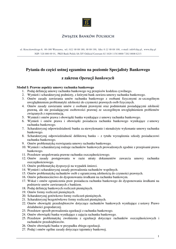 Pytania do części ustnej egzaminu na poziomie Specjalisty Bankowego z zakresu Operacji bankowych Moduł I: Prawne aspekty umowy rachunku bankowego 1. Podaj definicję umowy rachunku bankowego wg przepisów kodeksu cywilnego. 2. Wymień i scharakteryzuj podmioty, z którymi bank zawiera umowy rachunku bankowego. 3. Omów zasady zawierania umów rachunku bankowego z osobami fizycznymi ze szczególnym uwzględnieniem problematyki zdolności do czynności prawnych osób fizycznych. 4. Omów zasady zawieranie umów z osobami prawnymi oraz podmiotami posiadającymi zdolność prawną, ale nie posiadającymi osobowości prawnej ze szczególnym uwzględnieniem problemów związanych z reprezentacją. 5. Wymień i omów prawa i obowiązki banku wynikające z umowy rachunku bankowego. 6. Wymień i omów prawa i obowiązki posiadacza rachunku bankowego wynikające z umowy rachunku bankowego. 7. Scharakteryzuj odpowiedzialność banku za niewykonanie i nienależyte wykonanie umowy rachunku bankowego. 8. Scharakteryzuj odpowiedzialność deliktową banku – z tytułu wyrządzenia szkody posiadaczowi rachunku bankowego. 9. Omów problematykę rozwiązania umowy rachunku bankowego. 10. Wymień i scharakteryzuj rodzaje rachunków bankowych prowadzonych zgodnie z przepisami prawa bankowego. 11. Przedstaw uregulowania prawne rachunku oszczędnościowego. 12. Omów zasady postępowania w razie utraty dokumentów zawarcia umowy rachunku oszczędnościowego. 13. Omów problematykę dyspozycji na wypadek śmierci. 14. Wymień i scharakteryzuj zasady prowadzenia rachunków wspólnych. 15. Omów problematykę rachunków osób z ograniczoną zdolnością do czynności prawnych. 16. Omów pełnomocnictwo do dysponowania środkami na rachunku bankowym. 17. Wskaż i omów ograniczenia praw posiadacza rachunku bankowego do dysponowania środkami na podstawie umów zawieranych z bankiem. 18. Podaj definicję bankowych rozliczeń pieniężnych. 19. Omów formy rozliczeń pieniężnych. 20. Scharakteryzuj gotówkowe formy rozliczeń pieniężnych. 21. Scharakteryzuj bezgotówkowe formy rozliczeń pieniężnych. 22. Omów obowiązki przedsiębiorców dotyczące rachunków bankowych wynikające z ustawy Prawo działalności gospodarczej. 23. Przedstaw sposób prowadzenia egzekucji z rachunku bankowego. 24. Omów obowiązki banku wynikające z zajęcia rachunku bankowego. 25. Przedstaw problematykę zwolnienia z egzekucji dotyczące rachunków oszczędnościowych i rachunków przedsiębiorców. 26. Omów obowiązki banku w przypadku zbiegu egzekucji. 27. Podaj i omów ogólne zasady dotyczące tajemnicy bankowej. 1 28. Przedstaw obowiązki banku w zakresie udzielania informacji objętych tajemnicą bankową. 29. Omów uprawnienia banku w zakresie wydawania regulaminów bankowych. 30. Podaj zasady obowiązywania postanowień regulaminów w stosunku do posiadaczy rachunków bankowych. Moduł II: Krajowe rozliczenia pieniężne 1. Przedstaw uregulowania dotyczące rozliczeń pieniężnych zawarte w ustawie Prawo działalności gospodarczej. 2. Wymień i krótko scharakteryzuj formy krajowych rozliczeń pieniężnych 3. Zdefiniuj pojęcie czeku i omów jego elementy. 4. Omów przebieg rozliczenia za pomocą polecenia przelewu. 5. Omów przebieg rozliczenia za pomocą polecenia zapłaty. 6. Omów strukturę organizacyjną KIR S.A. oraz funkcje jej poszczególnych elementów. 7. Wskaż podobieństwa i różnice pomiędzy czekiem a kartą płatniczą. 8. Scharakteryzuj funkcjonowanie systemu SYBIR. 9. Scharakteryzuj funkcjonowanie systemu ELIXIR. 10. Omów istniejące obecnie formy rozrachunków międzyoddziałowych. 11. Omów istniejące obecnie formy rozrachunków międzybankowych. 12. Omów ograniczenia w stosowaniu polecenia zapłaty. 13. Scharakteryzuj podobieństwa i różnice między czekiem a wekslem. 14. Przedstaw warunki niezbędne do prowadzenia rozliczeń za pomocą polecenia zapłaty. 15. Zdefiniuj polecenie przelewu. 16. Zdefiniuj polecenie zapłaty. 17. Omów możliwości odwołania polecenia zapłaty. 18. Omów możliwości odwołania polecenia przelewu. 19. Wskaż podobieństwa i różnice między poleceniem przelewu a poleceniem zapłaty. Moduł III: Czek w obrocie krajowym i zagranicznym 1. Proszę wymienić wszystkie elementy ustawowe czeku. 2. Proszę podać, gdzie czek jest płatny w przypadku nieoznaczenia miejsca jego płatności. 3. Proszę podać, w jaki sposób może być oznaczony remitent na czeku. 4. Proszę wymienić trzy klauzule, które prawo czekowe nakazuje uznać za nienapisane. 5. Proszę podać, jakie muszą być spełnione warunki, aby pełnomocnik mógł wystawić czek. 6. Proszę opisać, kiedy czek nie może być indosowany oraz przypadki, w których indos jest bez znaczenia prawnego. 7. Proszę omówić skutki indosu na trasata oraz skutki indosu dokonanego przez trasata. 8. Proszę podać rodzaje indosów oraz opisać, gdzie może być umieszczony indos. Określić jaki indos musi być umieszczony na czeku składanym do skupu, a jakie indosy na czeku składanym do inkasa. 9. Proszę opisać zasady potwierdzania czeku in blanco i zupełnego oraz skutki potwierdzenia. 10. Jakie są skutki odwołania czeku oraz nieodwołania (w przypadku upływu terminu do przedstawienia)? 11. Proszę określić skutki śmierci wystawcy czeku, remitenta oraz indosanta. 12. Proszę omówić następujące zagadnienia: zapłata częściowa. Obowiązki trasata i posiadacza czeku. 13. Proszę podać, jakie terminy przedstawienia czeku do zapłaty przewiduje polskie prawo czekowe. Od jakiego dnia oblicza się te terminy? 14. Jakie są obowiązki trasata płacącego czek? 15. Proszę podać definicję zakreślenia, jego rodzaje, skutki i formę. 16. Proszę podać definicję czeku rozrachunkowego, formę zamieszczenia na czeku klauzuli „do rozrachunku” lub innej równoznacznej oraz skutki tego. 17. Proszę podać co bank-trasat robi w przypadku, gdy czek nie jest zapłacony. 18. Proszę opisać skutki zmi
