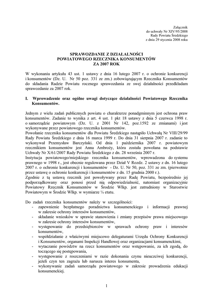 Załącznik do uchwały Nr XIV/95/2008 Rady Powiatu Średzkiego z dnia 29 stycznia 2008 roku SPRAWOZDANIE Z DZIAŁALNOŚCI POWIATOWEGO RZECZNIKA KONSUMENT‚W ZA 2007 ROK W wykonaniu artykułu 43 ust. 1 ustawy z dnia 16 lutego 2007 r. o ochronie konkurencji i konsumentƒw (Dz. U. Nr 50 poz. 331 ze zm.) zobowiązującym Rzecznika Konsumentƒw do składania Radzie Powiatu rocznego sprawozdania ze swej działalności przedkładam sprawozdanie za 2007 rok. I. Wprowadzenie oraz ogƒlne uwagi dotyczące działalności Powiatowego Rzecznika Konsumentƒw. Jednym z wielu zadań publicznych powiatu o charakterze ponadgminnym jest ochrona praw konsumentƒw. Zadanie to wynika z art. 4 ust. 1 pkt 18 ustawy z dnia 5 czerwca 1998 r. o samorządzie powiatowym (Dz. U. z 2001 Nr 142, poz.1592 ze zmianami) i jest wykonywane przez powiatowego rzecznika konsumentƒw. Powołanie rzecznika konsumentƒw dla Powiatu Średzkiego nastąpiło Uchwałą Nr VIII/29/99 Rady Powiatu Średzkiego z dnia 16 marca 1999 r. Do dnia 31 sierpnia 2007 r. zadanie to wykonywał Przemysław Barczyński. Od dnia 1 października 2007 r. powiatowym rzecznikiem konsumentƒw jest Anna Ambroży, ktƒra została powołana na podstawie Uchwały Nr X/61/2007 Rady Powiatu Średzkiego z dn. 28 września 2007 r. Instytucja powiatowego/miejskiego rzecznika konsumentƒw, wprowadzona do systemu prawnego w 1998 r., jest obecnie regulowana przez Dział V Rozdz. 2 ustawy z dn. 16 lutego 2007 r. o ochronie konkurencji i konsumentƒw - Dz. U. Nr 50, poz. 331 ze zm. (pierwotnie przez ustawę o ochronie konkurencji i konsumentƒw z dn. 15 grudnia 2000 r.). Zgodnie z tą ustawą rzecznik jest powoływany przez Radę Powiatu, bezpośrednio jej podporządkowany oraz ponosi przed nią odpowiedzialność, natomiast organizacyjnie Powiatowy Rzecznik Konsumentƒw w Środzie Wlkp. jest zatrudniony w Starostwie Powiatowym w Środzie Wlkp. w wymiarze Š etatu. Do zadań rzecznika konsumentƒw należy w szczegƒlności: - zapewnienie bezpłatnego poradnictwa konsumenckiego i informacji prawnej w zakresie ochrony interesƒw konsumentƒw, - składanie wnioskƒw w sprawie stanowienia i zmiany przepisƒw prawa miejscowego w zakresie ochrony interesƒw konsumentƒw, - występowanie do przedsiębiorcƒw w sprawach ochrony praw i interesƒw konsumentƒw, - wspƒłdziałanie z właściwymi miejscowo delegaturami Urzędu Ochrony Konkurencji i Konsumentƒw, organami Inspekcji Handlowej oraz organizacjami konsumenckimi, - wytaczanie powƒdztw na rzecz konsumentƒw oraz wstępowanie, za ich zgodą, do toczącego się postępowania, - występowanie z roszczeniami w razie dokonania czynu nieuczciwej konkurencji, jeżeli czyn ten zagraża lub narusza interes konsumenta, - wykonywanie zadań samorządu powiatowego w zakresie prowadzenia edukacji konsumenckiej. 1 II. Realizacja zadań wynikających z ustawy o ochronie konkurencji i konsumentƒw. 1. Zapewnienie bezpłatnego poradnictwa konsumenckiego i informacji prawnej w zakresie ochrony interesƒw konsumentƒw Sumaryczna ilość zgłoszonych przez konsumentƒw w roku sprawozdawczym spraw i problemƒw, dotycząca rƒżnych form udzielanej przez rzecznika pomocy wynosiła 153. Najwięcej – ok. 95% konsumentƒw korzysta z możliwości rozmowy z rzecznikiem bezpośrednio w biurze. Telefony do rzecznika z prośbą o pomoc i informacje stanowiły ok. 5% spraw. Zakres spraw kierowanych do powiatowego rzecznika konsumentƒw z prośbą o pomoc w ich rozwiązaniu był bardzo szeroki zarƒwno pod względem stopnia ich złożoności, jak i wartości przedmiotu sprawy. Udzielanie porad i informacji prawnych na rzecz konsumentƒw obejmowało najczęściej problematykę związaną z reklamacją wadliwego towaru lub usługi, w ramach uprawnień z tytułu gwarancji, niezgodności towaru z umową, bądź też odstąpienia od umowy. Najwięcej spraw, z ktƒrymi zgłaszali się konsumenci dotyczyło umƒw, ktƒrych przedmiotem był zakup sprzętu RTV i AGD, obuwia, mebli oraz umƒw o świadczenie usług remontowobudowlanych, ubezpieczeniowych, telekomunikacyjnych, bankowych, turystycznych, krawieckich, a także umƒw zawieranych poza lokalem przedsiębiorstwa. Rzecznik konsumentƒw, udzielał nie tylko informacji i porady prawnej ale także pomagał w sformułowaniu pisma do przedsiębiorcy o treści stosownej do zgłaszanej sprawy. Były to: wezwanie do spełnienia świadczenia, wezwanie do zapłaty, sformułowanie żądania w postępowaniu reklamacyjnym, odstąpienie od umowy. Struktura udzielonych porad w okresie sprawozdawczym przedstawia się następująco: Wyszczeg€lnienie I. Usługi og€łem, w tym: Bankowe Finansowe Ubezpieczeniowe Systemy argentyńskie Telekomunikacyjne (operatorzy, TV kablowa) Dostawa energii (prąd, gaz, ciepło, woda) Motoryzacyjne (serwis) Turystyczne i hotelarskie Pralnicze Remontowo budowlane (w tym stolarka PCV) Inne (kursy korespondencyjne, krawieckie, jubilerskie, pocztowe itp.) II. Umowy sprzedaży ogƒłem, w tym: Wyposażenie wnętrz (AGD, RTV, komputery) Odzież Obuwie Samochody Inne (meble, telefony, rowery, okulary, materiały budowlane, akcesoria motoryzacyjne, itd.) III. Umowy poza lokalem i na odległość Og€łem pkt I - III 2 Og€łem 68 8 4 9 10 4 4 5 1 11 12 79 21 9 22 2 25 6 153 Do najczęściej zgłaszanych przez konsument†w problem†w należało: - odmowa uznania reklamacji towaru (częstymi praktykami, zwłaszcza sprzedawc†w obuwia, było odmowne załatwienie reklamacji poparte niejednokrotnie subiektywną oceną pracownika/rzeczoznawcy na niekorzyść reklamującego), - brak stosowania przez przedsiębiorc†w obowiązujących procedur przewidzianych dla roszczeń z tytułu niezgodności towaru z umową, co do formy zgłoszenia reklamacji, termin†w rozpatrzenia reklamacji, brak potwierdzenia zgłoszenia reklamacji, - brak świadomości obowiązującego prawa funkcjonująca wśr†d konsument†w (tj. nie obowiązująca już tzw. rękojmia pogwarancyjna, nie obowiązujący 5 - dnio