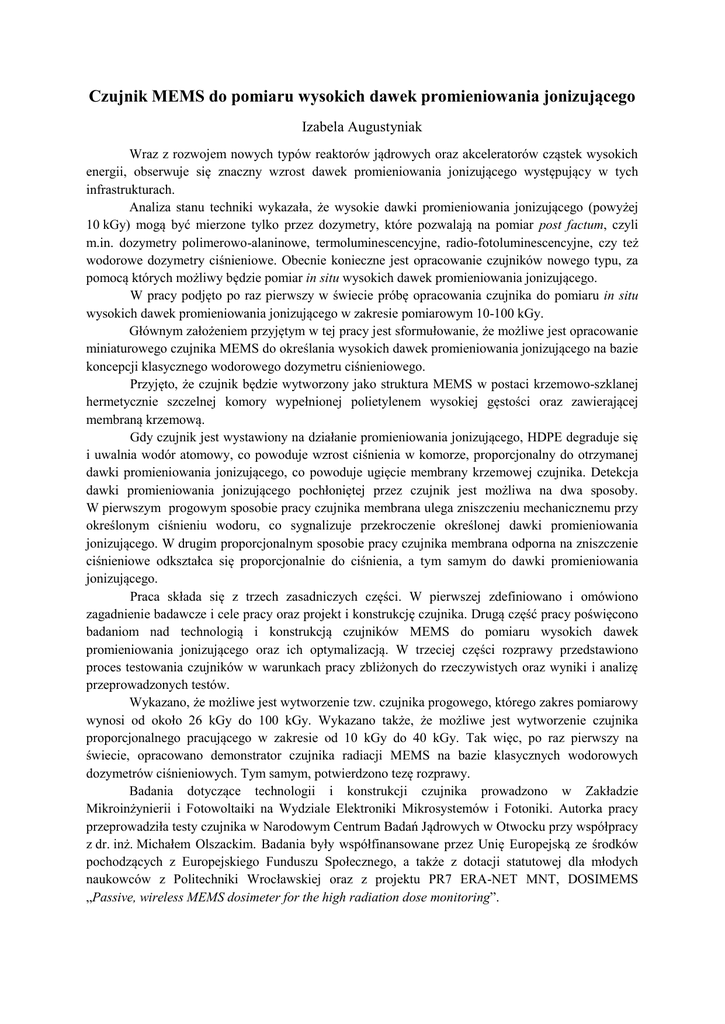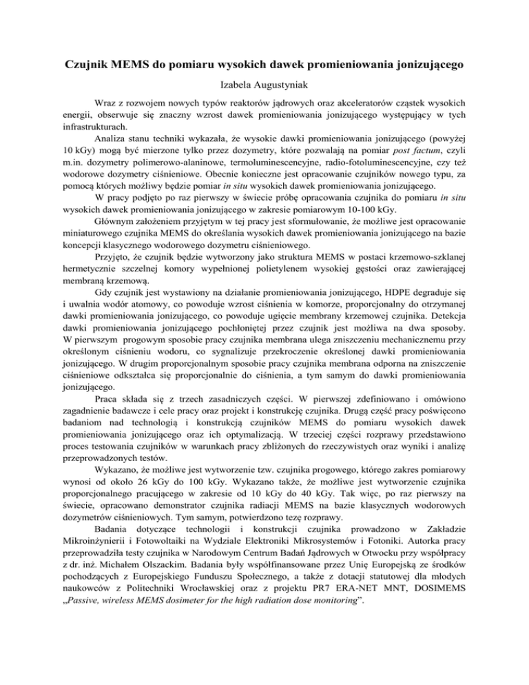 Czujnik MEMS do pomiaru wysokich dawek promieniowania jonizującego Izabela Augustyniak Wraz z rozwojem nowych typów reaktorów jądrowych oraz akceleratorów cząstek wysokich energii, obserwuje się znaczny wzrost dawek promieniowania jonizującego występujący w tych infrastrukturach. Analiza stanu techniki wykazała, że wysokie dawki promieniowania jonizującego (powyżej 10 kGy) mogą być mierzone tylko przez dozymetry, które pozwalają na pomiar post factum, czyli m.in. dozymetry polimerowo-alaninowe, termoluminescencyjne, radio-fotoluminescencyjne, czy też wodorowe dozymetry ciśnieniowe. Obecnie konieczne jest opracowanie czujników nowego typu, za pomocą których możliwy będzie pomiar in situ wysokich dawek promieniowania jonizującego. W pracy podjęto po raz pierwszy w świecie próbę opracowania czujnika do pomiaru in situ wysokich dawek promieniowania jonizującego w zakresie pomiarowym 10-100 kGy. Głównym założeniem przyjętym w tej pracy jest sformułowanie, że możliwe jest opracowanie miniaturowego czujnika MEMS do określania wysokich dawek promieniowania jonizującego na bazie koncepcji klasycznego wodorowego dozymetru ciśnieniowego. Przyjęto, że czujnik będzie wytworzony jako struktura MEMS w postaci krzemowo-szklanej hermetycznie szczelnej komory wypełnionej polietylenem wysokiej gęstości oraz zawierającej membraną krzemową. Gdy czujnik jest wystawiony na działanie promieniowania jonizującego, HDPE degraduje się i uwalnia wodór atomowy, co powoduje wzrost ciśnienia w komorze, proporcjonalny do otrzymanej dawki promieniowania jonizującego, co powoduje ugięcie membrany krzemowej czujnika. Detekcja dawki promieniowania jonizującego pochłoniętej przez czujnik jest możliwa na dwa sposoby. W pierwszym progowym sposobie pracy czujnika membrana ulega zniszczeniu mechanicznemu przy określonym ciśnieniu wodoru, co sygnalizuje przekroczenie określonej dawki promieniowania jonizującego. W drugim proporcjonalnym sposobie pracy czujnika membrana odporna na zniszczenie ciśnieniowe odkształca się proporcjonalnie do ciśnienia, a tym samym do dawki promieniowania jonizującego. Praca składa się z trzech zasadniczych części. W pierwszej zdefiniowano i omówiono zagadnienie badawcze i cele pracy oraz projekt i konstrukcję czujnika. Drugą część pracy poświęcono badaniom nad technologią i konstrukcją czujników MEMS do pomiaru wysokich dawek promieniowania jonizującego oraz ich optymalizacją. W trzeciej części rozprawy przedstawiono proces testowania czujników w warunkach pracy zbliżonych do rzeczywistych oraz wyniki i analizę przeprowadzonych testów. Wykazano, że możliwe jest wytworzenie tzw. czujnika progowego, którego zakres pomiarowy wynosi od około 26 kGy do 100 kGy. Wykazano także, że możliwe jest wytworzenie czujnika proporcjonalnego pracującego w zakresie od 10 kGy do 40 kGy. Tak więc, po raz pierwszy na świecie, opracowano demonstrator czujnika radiacji MEMS na bazie klasycznych wodorowych dozymetrów ciśnieniowych. Tym samym, potwierdzono tezę rozprawy. Badania dotyczące technologii i konstrukcji czujnika prowadzono w Zakładzie Mikroinżynierii i Fotowoltaiki na Wydziale Elektroniki Mikrosystemów i Fotoniki. Autorka pracy przeprowadziła testy czujnika w Narodowym Centrum Badań Jądrowych w Otwocku przy współpracy z dr. inż. Michałem Olszackim. Badania były współfinansowane przez Unię Europejską ze środków pochodzących z Europejskiego Funduszu Społecznego, a także z dotacji statutowej dla młodych naukowców z Politechniki Wrocławskiej oraz z projektu PR7 ERA-NET MNT, DOSIMEMS „Passive, wireless MEMS dosimeter for the high radiation dose monitoring”. MEMS high doses radiation sensor Izabela Augustyniak The development of a new types of nuclear reactors and high energy particles accelerators caused significant increase of doses of radiation in this facilities. Analysis of state of art has shown that high doses of ionizing radiation (over 10 kGy) can only be measured post factum by polymer-alanine dosimeters, thermoluminescent dosimeters, radiophotoluminescent deosimeters or hydrogen pressure dosimeters. It is now necessary to develop a new type of sensor for measurement of in situ high doses of ionizing radiation. In this work for the first time in the world attempt to develop a sensor for in situ measurement of high doses of ionizing radiation in range 10-100 kGy. The main assumption in this work is the formulation, it is possible to develop miniature MEMS sensor for measurement of high doses of ionizing radiation based on the classic concept of the hydrogen pressure dosimeter. It was assumed that the sensor will be manufactured as a MEMS structure in the form of silicon-glass hermetically sealed chamber filled with high density polyethylene and containing a silicon membrane. When the sensor is exposed to ionizing radiation, HDPE degrades and releases an atomic hydrogen, which increases the pressure in the chamber, proportional to received dose of ionizing radiation, which causes deflection of the silicon membrane of sensor. The detection of the dose of ionizing radiation absorbed by the sensor is possible in two ways. In the first threshold mode of operation of the sensor membrane is destroyed mechanically at a certain pressure of hydrogen, which indicates exceeding a specified dose of ionizing radiation. In a second proportional mode of operation a membrane resistant to pressure damage deforms proportional to the pressure and thus to dose of ionizing radiation. The work consists of three main parts. In the first part the issue of research, work objectives, design and construction of the sensor have been defined and discussed. The second part of the work has been devoted to research on design, technology and optimization of MEMS sensors for measurement of high doses of ionizing radiation. The third part of the paper presents the process of testing the sensors in conditions close 