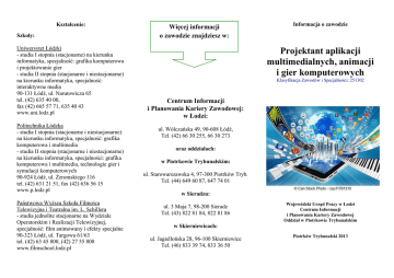 Kształcenie: Szkoły: Uniwersytet Łódzki - studia I stopnia (stacjonarne) na kierunku informatyka, specjalność: grafika komputerowa i projektowanie gier - studia II stopnia (stacjonarne i niestacjonarne) na kierunku informatyka, specjalność: interaktywne media 90-131 Łódź, ul. Narutowicza 65 tel. (42) 635 40 00, fax (42) 665 57 71, 635 40 43 www.uni.lodz.pl Politechnika Łódzka - studia I stopnia (stacjonarne i niestacjonarne) na kierunku informatyka, specjalność: grafika komputerowa i multimedia - studia II stopnia (stacjonarne i niestacjonarne) na kierunku informatyka, specjalności: grafika komputerowa i multimedia, technologie gier i symulacji komputerowych 90-924 Łódź, ul. śeromskiego 116 tel. (42) 631 21 51, fax (42) 636 56 15 www.p.lodz.pl Państwowa WyŜsza Szkoła Filmowa Telewizyjna i Teatralna im. L. Schillera - studia jednolite stacjonarne na Wydziale Operatorskim i Realizacji Telewizyjnej, specjalność: film animowany i efekty specjalne 90-323 Łódź, ul. Targowa 61/63 tel. (42) 63 45 800, (42) 27 55 800 www.filmschool.lodz.pl Więcej informacji o zawodzie znajdziesz w: Informacja o zawodzie Projektant aplikacji multimedialnych, animacji i gier komputerowych Klasyfikacja Zawodów i Specjalności: 251302 Centrum Informacji i Planowania Kariery Zawodowej: w Łodzi: ul. Wólczańska 49, 90-608 Łódź, Tel. (42) 66 30 255, 66 30 273 oraz oddziałach: w Piotrkowie Trybunalskim: ul. Starowarszawska 4, 97-300 Piotrków Tryb. Tel. (44) 649 60 87, 647 74 01 w Sieradzu: ul. 3 Maja 7, 98-200 Sieradz Tel. (43) 822 81 84, 822 81 86 Wojewódzki Urząd Pracy w Łodzi Centrum Informacji i Planowania Kariery Zawodowej Oddział w Piotrkowie Trybunalskim w Skierniewicach: ul. Jagiellońska 28, 96-100 Skierniewice Tel. (46) 833 39 74, 833 36 50 Piotrków Trybunalski 2013 Projektant aplikacji multimedialnych, animacji i gier komputerowych to specjalista, który na postawie analizy wymagań zleceniodawcy tworzy projekt danej aplikacji/gry, realizowany następnie przez programistów. Zadania zawodowe: • opracowanie ogólnych załoŜeń projektu na podstawie zebranych informacji od klienta; w przypadku gry komputerowej jest to tzw. mechanizm gry: fabułę, bohaterów, konstrukcję mapy lub planszy; • przygotowanie projektu technicznego, tj. określenie odpowiedniej metodyki projektowej oraz technologii koniecznej do wykonania danej aplikacji multimedialnej czy gry; • rozpisanie szczegółowych załoŜeń w formie scenariusza (gry, animacji, projektu multimedialnego); • przygotowanie projektu funkcjonalnego opisującego sposób pracy danej aplikacji z punktu widzenia jego uŜytkownika; • testowanie funkcjonalności, atrakcyjności i dostępności aplikacji/gry dla uŜytkownika; • współpraca z innymi projektantami w ramach zespołu projektowego, z programistami i analitykami oraz z klientem zamawiającym dany projekt. Warunki podjęcia pracy w zawodzie: Przeciwwskazania do wykonywania zawodu: Praca w zawodzie projektanta multimediów nie wymaga co prawda wykształcenia technicznego, jednak pracodawcy najchętniej zatrudniają absolwentów kierunków informatycznych o specjalnościach: grafika komputerowa i multimedia, projektowanie gier itp. Podstawowym kryterium jest wiedza na temat realizacji projektów multimedialnych, najlepiej poparta doświadczeniem (portfolio), umiejętność posługiwania się programami graficznymi (np. pakiet Adobe, CorelDraw) oraz znajomość podstaw programowania. Do tworzenia fabuły, dialogów czy opisu miejsc w grze zwykle poŜądane są osoby z dorobkiem literackim. Mile widziana jest takŜe dobra znajomość języka angielskiego. Osoba niepełnosprawna poruszająca się na wózku inwalidzkim oraz z zaburzeniami w zakresie ruchów kończyn dolnych moŜe pracować w zawodzie, o ile nie uniemoŜliwia ono przemieszczania się poza stanowisko pracy. Osoby niewidome oraz z duŜymi zaburzeniami wzroku nie mogą liczyć na zatrudnienie z uwagi na specyfikę pracy przed monitorem. Konieczność częstych kontaktów ze współpracownikami utrudnia wykonywanie pracy przez osoby niesłyszące lub głuchonieme. RównieŜ upośledzenie umysłowe, ze względu na zadania wymagające duŜej sprawności intelektualnej, uniemoŜliwia wykonywanie tego zawodu. Wymagania psychofizyczne: Projektant specjalizujący się w grafice multimedialnej moŜe podjąć pracę w kaŜdej większej firmie posiadającej dział reklamy, w studiach reklamowych i fotograficznych bądź otworzyć własne studio projektowe. Projektant gier z kolei znajdzie zatrudnienie u producentów i wydawców gier komputerowych. Specyfika pracy projektanta wymaga od kandydata przede wszystkim duŜej kreatywności, twórczego podejścia do problemu oraz bogatej wyobraźni. Przydają się uzdolnienia artystyczne, zwłaszcza literackie. Od kandydatów oczekuje się duŜej inicjatywy, odpowiedzialności i zaangaŜowania w realizację projektu, takŜe cierpliwości i wytrwałości (przygotowanie np. gry moŜe trwać kilka lat). Kontakty z członkami zespołu projektowego wymagają posiadania umiejętności ułatwiających komunikację interpersonalną. Ciągłe zmiany na rynku gier i multimediów wymuszają konieczność ciągłego śledzenia nowinek i dokształcania się w tym zakresie. MoŜliwości i szanse zatrudnienia: Płace: Projektant animacji moŜe liczyć na wynagrodzenie w przedziale od 2,0 do 3,0 tys. złotych. Projektant aplikacji multimedialnych: od 3,4 tys. do 7,1 tys. złotych. Średnia pensja projektanta gier wynosi 3,9 tys. złotych (3370 początkujący, a 5500 doświadczony projektant). [www.moja-pensja.pl - dostępna dn.01.08.2013]