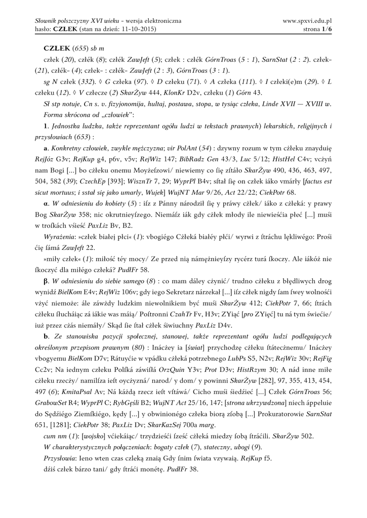 Słownik polszczyzny XVI wieku - wersja elektroniczna hasło: CZŁEK (stan na dzień: 11-10-2015) www.spxvi.edu.pl strona 1/6 CZŁEK (655) sb m człek (20), człék (8); człék ZawJeft (5); człek : człék GórnTroas (5 : 1), SarnStat (2 : 2). człek(21), człék- (4); człek- : człék- ZawJeft (2 : 3), GórnTroas (3 : 1). sg N człek (332). ◊ G człeka (97). ◊ D człeku (71). ◊ A człeka (111). ◊ I człeki(e)m (29). ◊ L człeku (12). ◊ V człecze (2) SkarŻyw 444, KlonKr D2v, człeku (1) Górn 43. Sł stp notuje, Cn s. v. fizyjonomija, hultaj, postawa, stopa, w tysiąc człeka, Linde XVII — XVIII w. Forma skrócona od „człowiek”: 1. Jednostka ludzka, także reprezentant ogółu ludzi w tekstach prawnych) lekarskich, religijnych i przysłowiach (653) : a. Konkretny człowiek, zwykle mężczyzna; vir PolAnt (54) : dzywny rozum w tym cżłeku znayduię RejJóz G3v; RejKup g4, p6v, v5v; RejWiz 147; BibRadz Gen 43/3, Luc 5/12; HistHel C4v; vcżyń nam Bogi [...] bo cżłeku onemu Moyżeſzowi/ niewiemy co ſię zſtáło SkarŻyw 490, 436, 463, 497, 504, 582 (39); CzechEp [393]; WisznTr 7, 29; WyprPl B4v; sſtał ſię on człek iáko vmárły [factus est sicut mortuus; i sstał się jako umarly, Wujek] WujNT Mar 9/26, Act 22/22; CiekPotr 68. α. W odniesieniu do kobiety (5) : iſz z Pánny národził ſię y práwy cżłek/ iáko z cżłeká: y prawy Bog SkarŻyw 358; nic okrutnieyſzego. Niemáſz iák gdy cżłek młody ile niewieśćia płeć [...] muśi w troſkách vśieść PaxLiz Bv, B2. Wyrażenia: »człek białej płci« (1): vbogiégo Cżłeká białéy płći/ wyrwi z ſtráchu lękliwégo: Prośi ćię ſámá ZawJeft 22. »miły człek« (1): miłość téy mocy/ Ze przed nią námężnieyſzy rycérz turá ſkoczy. Ale iákóż nie ſkoczyć dla miłégo człeká? PudłFr 58. β. W odniesieniu do siebie samego (8) : co mam dáley cżynić/ trudno cżłeku z błędliwych drog wynidź BielKom E4v; RejWiz 106v; gdy iego Sekretarz nárzekał [...] iſz cżłek nigdy ſam ſwey wolnośći vżyć niemoże: ále záwżdy ludzkim niewolnikiem być muśi SkarŻyw 412; CiekPotr 7, 66; ſtrách cżłeku ſłucháiąc zá iákie was máią/ Poſtronni CzahTr Fv, H3v; ZYiąć [pro ZYięć] tu ná tym świećie/ iuż przez cżás niemáły/ Skąd ſie ſtał cżłek śiwiuchny PaxLiz D4v. b. Ze stanowiska pozycji społecznej, stanowej, także reprezentant ogółu ludzi podlegających określonym przepisom prawnym (80) : Inácżey ia [świat] przychodzę cżłeku ſtátecżnemu/ Inácżey vbogyemu BielKom D7v; Rátuyćie w vpádku cżłeká potrzebnego LubPs S5, N2v; RejWiz 30v; RejFig Cc2v; Na iednym człeku Polſká záwiſłá OrzQuin Y3v; Prot D3v; HistRzym 30; A nád inne miłe cżłeku rzecży/ namilſza ieſt oycżyzná/ narod/ y dom/ y powinni SkarŻyw [282], 97, 355, 413, 454, 497 (6); KmitaPsal Av; Ná káżdą rzecz ieſt vſtáwá/ Cicho muśi śiedźieć [...] Człek GórnTroas 56; GrabowSet R4; WyprPl C; RybGęśli B2; WujNT Act 25/16, 147; [strona ukrzywdzona] niech áppeluie do Sędźiégo Ziemſkiégo, kędy [...] y obwinionégo człeka biorą zſobą [...] Prokuratorowie SarnStat 651, [1281]; CiekPotr 38; PaxLiz Dv; SkarKazSej 700a marg. cum nm (1): [wojsko] vćiekáiąc/ trzydzieśći ſześć cżłeká miedzy ſobą ſtráćili. SkarŻyw 502. W charakterystycznych połączeniach: bogaty człek (7), stateczny, ubogi (9). Przysłowia: Ieno wten czas czleką znaią Gdy ſnim ſwiata vzywaią. RejKup f5. dźiś człek bárzo tani/ gdy ſtráći monétę. PudłFr 38. Słownik polszczyzny XVI wieku - wersja elektroniczna hasło: CZŁEK (stan na dzień: 11-10-2015) www.spxvi.edu.pl strona 2/6 Wyrażenia: »dobry człek« [szyk 3 : 1] (4): RejWiz 132; żebrakow v kośćiołá [...] śiedzących: ieden dobry cżłek wyſłuchał SkarŻyw 413, 311; cżłek dobry gdyby w ſukni ſzárey Przyiechał/ y ſług nie miał do ſwoiey wśi ſtárey: Smieią ſie z niego BielRozm 30. »człek myśliwy« (1): Ktorego [ptaka] zſobą nieśie cżłek myśliwy. GrabowSet N2. »nędzny człek« [szyk 3 : 1] (4): Gdy Cżlek nedzny przepadł winy RejKup ee3v; RejPos 308v; Niemogę ná ták nędznego cżłeká [odartego ubogiego] pátrzić SkarŻyw 135, 601. Cf »podły człek«. »niewinny człek« [szyk 7 : 4] (11): LubPs Ev, 13; Aby [...] kreẃ roźlał cżłeká niewinnego. RejWiz 134v, 133v; HistRzym 85v; RejZwierc 202; SkarŻyw 329, 389, 436, 444, 487. »podły (a. napodlejszy) człek« (3): iáko napodleyſzym á nanędznieyſzym cżłekiem gárdzić [Pan Bóg] nie racży. RejPos 308v; SkarŻyw 81; CzechEp 74 marg. »człek prosty« [szyk 3 : 2] (5): kupcza iednego Woſſobie czleka proſtego. Też ſnimy ſpolu pozwanego RejKup b3v; powiedam/ że Sláchćić [!] zábił proſtego cżłeká [a nobili plebeium occisum]/ ktorego głowę trochą pieniędzy zápłáćić wolno ModrzBaz 31; [o Synu Bożym] rozumiáno/ iſz był proſtego cżłeká ſynem SkarŻyw 242, 165, 271. »przednieyszy człek« (1): Był teſz tu drugi bogáty y przednieyſzy cżłek SkarŻyw 103. »rycerski człek« [szyk 4 : 1] (5): cżłeku Rycerſkiemu/ Coby ſłużył Koronie RejZwierz 104v; Ktoby [...] mieczá dobył [...] Przed Rycérzkim człekiem ſzláchćicem. SarnStat 501, 1306; Ná przykład ludźiom Rycerſkim [...] PRzypomnię tu kroćiucżko Rycerſkiego cżłeká CzahTr B4, I3v. »jeden szczegulny człek« = zwykły, pojedynczy człowiek (1): [Mojżesz] ná wſzytkim iáko ieden ſzcżegulny cżłek przeſtawał. (marg) Z vrzędu bogátym nie był. (—) SkarŻyw 482. »człek świecki« (1): [ganiąc] iż Ignácego [...] zmiátáć á cżłeká świeckiego mocą ná nię [stolicę apostolską] ſtáwić śmiał. SkarJedn 214 [cf porucżáiąc/ áby Phociuſzá zá Laiká mieli ibid.]. »człek upadły« (2): powinność Krolá pocżćiwego/ Aby dármo rátował/ cżłeká vpádłego. RejZwierz 21v; GórnTroas 27. »zacny człek« [szyk 5 : 5] (10): Ieſłi ią damy zá iákiego bo