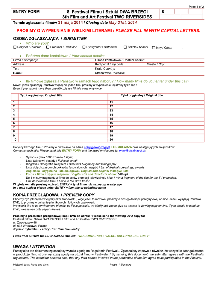 Page 1 of 2 ENTRY FORM 8. Festiwal Filmu i Sztuki DWA BRZEGI 8th Film and Art Festival TWO RIVERSIDES 8 Termin zgłaszania filmów 31 maja 2014 / Closing date May 31st, 2014 PROSIMY O WYPEŁNIANIE WIELKIMI LITERAMI / PLEASE FILL IN WITH CAPITAL LETTERS. OSOBA ZGŁASZAJĄCA / SUBMITTER Who are you? Reżyser / Director Producer / Producer Inny / Other: . Państwa dane kontaktowe / Your contact details: Firma / Company: Address: Tel.: E-mail: Szkoła / School Dystrybutor / Distributor Osoba kontaktowa / Contact person: Kod poczt./ Zip code: Miasto / City: Kraj / Country: Strona www / Website: Ile filmowe zgłaszają Państwo w ramach tego naboru? / How many films do you enter under this call? Nawet jeżeli zgłaszają Państwo więcej niż jeden film, prosimy o wypełnienie tej strony tylko raz / Even if you submit more then one title, please fill this page only once. Tytuł oryginalny / Original title: 1 2 3 4 5 6 7 8 9 10 Tytuł oryginalny / Original title: 11 12 13 14 15 16 17 18 19 20 Dotyczy każdego filmu: Prosimy o przesłanie na adres [email protected] FORMULARZA oraz następujących załączników: Concerns each title: Please send this ENTRY FORM and the listed enclosures to: [email protected]: Synopsis (max 1000 znaków / signs) Lista twórców i obsady / Full cast, credit Biografia i filmografia Reżysera / Director’s biography and filmography Lista dotychczasowych pokazów festiwalowych i nagród / List of festival screenings, awards Angielska i oryginalna lista dialogowa / English and original dialogue lists Fotos z filmu i zdjęcie reżysera: / Digital still and director’s photo: 300 dpi Do 1 minuty fragmentu z filmu do celów promocji telewizyjnej / Max 1 minut fragment of the film for the TV promotion. Link do zwiastuna filmu / A link to the film’s trailer. W tytule e-maila prosimy wpisać: ENTRY + tytuł filmu lub nazwę zgłaszającego In e-mail subject please write: ENTRY + film title or submitter name KOPIA PRZEGLĄDOWA / PREVIEW COPY Chcemy być jak najbardziej przyjaźni środowisku, więc jeżeli to możliwe, prosimy o dostęp do kopii przeglądowej on-line. Jeżeli wysyłają Państwo DVD, to prosimy o unikanie plastikowych i foliowych opakowań. We would like to be environment friendly, so if it is possible, we kindly ask you to give us access to viewing copy on-line. If you decide to send us DVD, please use only paper sleeves. Prosimy o przesłanie przeglądowej kopii DVD na adres: / Please send the viewing DVD copy to: Festiwal Filmu i Sztuki DWA BRZEGI / Film and Art Festival TWO RIVERSIDES ul. Zwyciezcow 48 03-938 Warszawa, Poland dopisek: ‘tytuł filmu - entry’ / ‘ref. ‘film title - entry’ Films from outside the EU should be labeled: “NO COMMERCIAL VALUE. CULTURAL USE ONLY" UWAGA / ATTENTION Przesyłając ten dokument zgłaszający wyraża zgodę na Regulamin Festiwalu. Zgłaszający zapewnia również, że wszystkie zaangażowane w produkcję filmu strony wyrażają zgodę na udział filmu w Festiwalu. / By sending this document, the submitter agrees with the Festival’s regulations. The submitter ensures also, that any third parties involved in the production of the film agree to its participation in the Festival. Miejsce i data / Place and date: Podpis / Signature … … Page 2 of 2 ENTRY FORM 8. Festiwal Filmu i Sztuki DWA BRZEGI 8th Film and Art Festival TWO RIVERSIDES 8 Termin zgłaszania filmów 31 maja 2014 / Closing date May 31st, 2014 PROSIMY O WYPEŁNIANIE WIELKIMI LITERAMI / PLEASE FILL IN WITH CAPITAL LETTERS. FILM (prosimy wypełnić dla każdego filmu oddzielnie / please fill individually for each title) Tytuł oryginalny / Original title: Tytuł polski / Polish title – if different: Tytuł angielski / English title – if different: Oryginalny język filmu / Original language: Rok produkcji /Year of production: Kraj produkcji / Country of production: Czas / Running time: Kraje koproducentów / Countries of co-producers: Shooting format 35 mm 16 mm Fabuła / Fiction Super 8 Super 16 Dokument / Documentary Betacam SP Animacja / Animation Digital Betacam MiniDV Eksperymentalny / Experimental HD Inny / Other Polska premiera / Polish premiere Data / Date: Miejsce i/lub wydarzenie / Place and/or event: Odbędzie się na 8. Edycji Festival DWA BRZEGI / Is to be at 8th TWO RIVERSIDES Festival REŻYSER / DIRECTOR Imie / Name Nazwisko / Last name: Dane kontaktowe (jeśli inne niż osoby zgłaszającej)/ Contact details (if different than submitter) E-mail: Fax: Tel.: Strona www / Website: Czy jest to debiut reżysera? Is this director’s debut? TAK / YES : NIE / NO EKIPA / CREW Scenariusz / Screenplay: Zdjęcia / Photography: Muzyka / Music: Montaż / Edition: OBSADA / CAST Aktorka pierwszoplanowa / Leading actress: Aktor pierwszoplanowy / Leading actor: Aktorka drugoplanowa / Supporting actrees: Aktor drugoplanowy / Supporting actor: Inni / Others: PRODUCENT / PRODUCER Imię i nazwisko / Name: Nazwa firmy / Company name: Dane kontaktowe (jeśli inne niż osoby zgłaszającej)/ Contact details (if different than submitter) Tel.: Fax: E-mail: Strona www / Website: KOPIA PROJEKCYJNA / SCREENING COPY FOR THE FESTIVAL FORMAT SOUND 35 mm Betacam SP PAL Digital Betacam PAL DVD/Blu Ray DCP Optical Magnetic Mono Stereo ASPECT RATIO Dolby SR Dolby A Dolby Digital Silent 1:1,37 1:1,66 1:1,85 Scope COLOUR 16:9 4:3 Letter Box Anamorph Kolor / Colour Czarno-niały / b&w WERSJA JĘZYKOWA / LANGUAGE Dialogi / Dialogues : Napisy / subtitles : Polski / Polish Polski / Polish Angielski / English Angielski / English Inne / Others Inne / Others Miejsce i data / Place and date: Podpis / Signature … … … … Bez dialogów /No dialogues