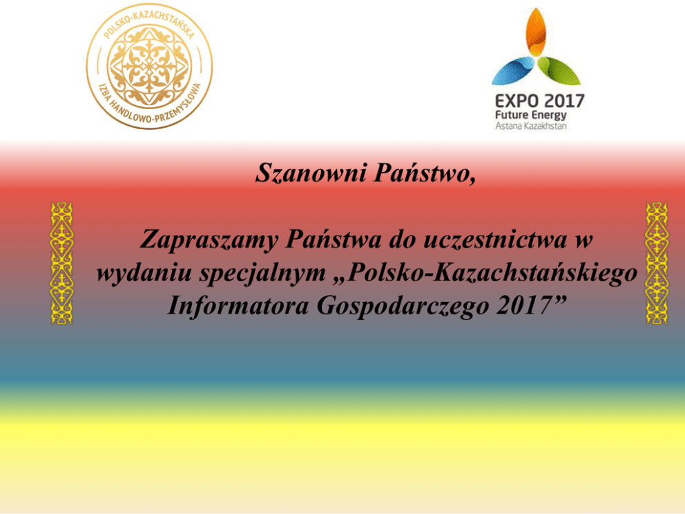 Szanowni Państwo, Zapraszamy Państwa do uczestnictwa w wydaniu specjalnym „Polsko-Kazachstańskiego Informatora Gospodarczego 2017” Jaki jest cel wydania Informatora? Prezentacja firmy na Światowej Wystawie EXPO w Astanie; Promocja produktów i usług polskich przedsiębiorstw na rynku kazachstańskim; Pozyskanie nowych kontaktów handlowych z kazachstańskimi firmami zainteresowanymi rozszerzeniem polsko-kazachskiej współpracy handlowej; Pozyskanie nowych klientów, zainteresowanych działalnością, usługami oraz produkcją polskich firm; Znalezienie nisz rynkowych; Zwiększenie świadomości polskich firm w aspekcie potrzeby udziału w przedsięwzięciach informacyjno-promocyjno-wydawniczych, których celem jest prezentacja oferty eksportowej firm przy wchodzeniu na zagraniczne rynki zbytu; Tworzenie pozytywnego wizerunku polskich produktów, przede wszystkim z punktu widzenia ich wysokiej, jakości; Umocnienie wizerunku Polski i polskich przedsiębiorców w Kazachstanie; Polsko-Kazachstańska Izba Handlowo-Przemysłowa ul. Trębacka 4, 00-074 Warszawa Gdzie będzie rozpowszechniany Informator? Podczas Światowej Wystawy EXPO 2017 Podczas imprez targowo-wystawienniczych w 2017 roku Wydarzeń promujących współpracę Polsko-Kazachstańską W placówkach dyplomatycznych oraz organizacjach zrzeszających przedsiębiorców kazachstańskich: - Ambasada Republiki Kazachstanu w Polsce, - Ambasada Rzeczypospolitej Polskiej w Kazachstanie, - Wydział Promocji Handlu i Inwestycji Ambasady Rzeczypospolitej Polskiej w Astanie, z siedzibą w Ałmaty, - Przedstawicielstwo PKIHP w Astanie, Szymkencie, Pawłodarze, - Oddziały Niezależnej Asocjacji Przedsiębiorców Kazachstanu, - Narodowa Izba Kazachstanu w Astanie, - Narodowa Agencja Kazachstanu ds. Eksportu i Inwestycji Kaznex Invest Polsko-Kazachstańska Izba Handlowo-Przemysłowa ul. Trębacka 4, 00-074 Warszawa Dane techniczne Format A4 Nakład 10 000 egz. Druk Arkuszowy, offset, CMYK Oprawa Klejona Papier Kreda mat 125g/m2, okładka: papier kredowy Uszlachetnienie druku Zewnętrzna część okładki (I i IV strona) lakierowana Materiały CD – zgodne ze specyfikacją Data publikacji maj 2017r. l Polsko-Kazachstańska Izba Handlowo-Przemysłowa ul. Trębacka 4, 00-074 Warszawa Warunki techniczne dla dostarczanych reklam: - preferowane formaty plików: pdf, tif, jpg (dobrej, jakości); - wymiary fizyczne reklamy winne być adekwatne do wybranej powierzchni druku; - rozdzielczość grafiki bitmapowej 300 dpi.; - kolor CMYK; - w przypadku gotowych reklam tekst winien być scalony z tłem lub zapisany, jako krzywe. Polsko-Kazachstańska Izba Handlowo-Przemysłowa ul. Trębacka 4, 00-074 Warszawa Rozszerzenie oferty W przypadku, gdy nie dysponują Państwo gotowym materiałem reklamowym, oferujemy bezpłatne wykonanie reklamy. Do tego celu wymagane jest przysłanie przez Państwa treści tekstowej, jaką chcą Państwo zamieścić w reklamie (opis produktów / usług, dane teleadresowa), a także przesłanie logotypu firmy oraz fotografii towarów / głównej grafiki. Oferujemy również bezpłatne tłumaczenie tekstu na język kazachski. Polsko-Kazachstańska Izba Handlowo-Przemysłowa ul. Trębacka 4, 00-074 Warszawa KONTAKT: Polsko-Kazachstańska Izba Handlowo-Przemysłowa ul. Trębacka 4, 00-074 Warszawa tel/fax: + 48 22 630 97 82; tel: + 48 22 630 96 53; e-mail: [email protected], www.pkihp.pl Ewelina Gądek Kierownik Biura [email protected] tel. 501 510 904