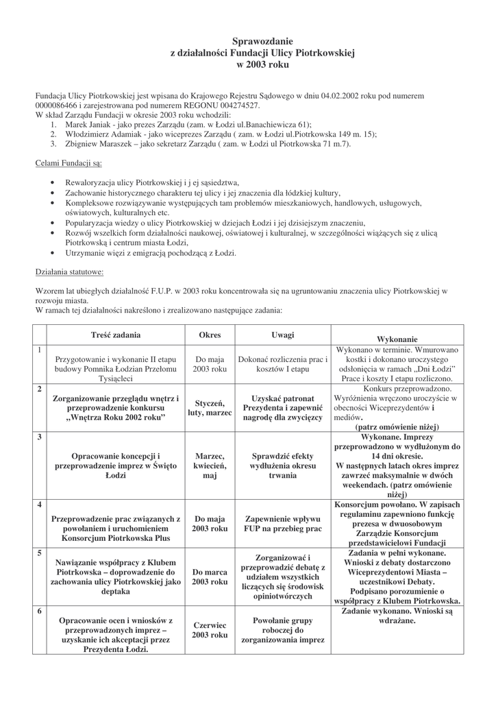 Sprawozdanie z działalno ci Fundacji Ulicy Piotrkowskiej w 2003 roku Fundacja Ulicy Piotrkowskiej jest wpisana do Krajowego Rejestru S dowego w dniu 04.02.2002 roku pod numerem 0000086466 i zarejestrowana pod numerem REGONU 004274527. W skład Zarz du Fundacji w okresie 2003 roku wchodzili: 1. Marek Janiak - jako prezes Zarz du (zam. w Łodzi ul.Banachiewicza 61); 2. Włodzimierz Adamiak - jako wiceprezes Zarz du ( zam. w Łodzi ul.Piotrkowska 149 m. 15); 3. Zbigniew Maraszek – jako sekretarz Zarz du ( zam. w Łodzi ul Piotrkowska 71 m.7). Celami Fundacji s : • • • • • • Rewaloryzacja ulicy Piotrkowskiej i j ej s siedztwa, Zachowanie historycznego charakteru tej ulicy i jej znaczenia dla łódzkiej kultury, Kompleksowe rozwi zywanie wyst puj cych tam problemów mieszkaniowych, handlowych, usługowych, o wiatowych, kulturalnych etc. Popularyzacja wiedzy o ulicy Piotrkowskiej w dziejach Łodzi i jej dzisiejszym znaczeniu, Rozwój wszelkich form działalno ci naukowej, o wiatowej i kulturalnej, w szczególno ci wi cych si z ulic Piotrkowsk i centrum miasta Łodzi, Utrzymanie wi zi z emigracj pochodz c z Łodzi. Działania statutowe: Wzorem lat ubiegłych działalno F.U.P. w 2003 roku koncentrowała si na ugruntowaniu znaczenia ulicy Piotrkowskiej w rozwoju miasta. W ramach tej działalno ci nakre lono i zrealizowano nast puj ce zadania: Tre 1 2 3 4 5 6 zadania Okres Uwagi Wykonanie Wykonano w terminie. Wmurowano Przygotowanie i wykonanie II etapu kostki i dokonano uroczystego Do maja Dokona rozliczenia prac i budowy Pomnika Łodzian Przełomu 2003 roku kosztów I etapu odsłoni cia w ramach „Dni Łodzi” Tysi cleci Prace i koszty I etapu rozliczono. Konkurs przeprowadzono. Wyró nienia wr czono uroczy cie w Zorganizowanie przegl du wn trz i Uzyska patronat Stycze , obecno ci Wiceprezydentów i Prezydenta i zapewni przeprowadzenie konkursu luty, marzec „Wn trza Roku 2002 roku” nagrod dla zwyci zcy mediów. (patrz omówienie ni ej) Wykonane. Imprezy przeprowadzono w wydłu onym do Opracowanie koncepcji i Marzec, Sprawdzi efekty 14 dni okresie. przeprowadzenie imprez w wi to kwiecie , wydłu enia okresu W nast pnych latach okres imprez Łodzi maj trwania zawrze maksymalnie w dwóch weekendach. (patrz omówienie ni ej) Konsorcjum powołano. W zapisach regulaminu zapewniono funkcj Przeprowadzenie prac zwi zanych z Do maja Zapewnienie wpływu prezesa w dwuosobowym powołaniem i uruchomieniem 2003 roku FUP na przebieg prac Zarz dzie Konsorcjum Konsorcjum Piotrkowska Plus przedstawicielowi Fundacji Zadania w pełni wykonane. Zorganizowa i Nawi zanie współpracy z Klubem Wnioski z debaty dostarczono przeprowadzi debat z Piotrkowska – doprowadzenie do Do marca Wiceprezydentowi Miasta – udziałem wszystkich zachowania ulicy Piotrkowskiej jako 2003 roku uczestnikowi Debaty. licz cych si rodowisk deptaka Podpisano porozumienie o opiniotwórczych współpracy z Klubem Piotrkowska. Zadanie wykonano. Wnioski s Opracowanie ocen i wniosków z Powołanie grupy wdra ane. Czerwiec przeprowadzonych imprez – roboczej do 2003 roku uzyskanie ich akceptacji przez zorganizowania imprez Prezydenta Łodzi. 7 8 9 10 11 12 13 14 15 Umowy nie zawarto. Władze miasta stosuj zasad przetargów, które Fundacja wygrywa. Wniosek o podpisanie umowy zło ony zostanie ponownie po uzyskaniu statusu organizacji po ytku publicznego. Opracowanie i wdro enie programu działa zwi zanych z imprezami - na drug połow roku 2003 i na rok 2004 Czerwiec 2003 roku Zawarcie umowy z władzami miasta Łodzi Współpraca z mediami Cały okres Konferencje prasowe, Wywiady, artykuły tematyczne itp. Podj cie prac przy opracowaniu koncepcji budowy fontanny na placu D browskiego Czerwiec 2003 roku Powołanie Komitetu Organizacyjnego Komitet zorganizowano. Prace organizacyjne trwaj Do grudnia 2003 roku Z udziałem władz miasta Zadanie wykonano w mo liwym ze wzgl du na nikłe rodki finansowe zakresie. (patrz omówienie ni ej) Zorganizowanie wła ciwego o wietlenia ulicy Piotrkowskiej w okresie wi t Bo ego Narodzenia i sylwestra 2003 roku Przeprowadzenie w okresie grudnia szeregu imprez handlowych i kulturalno-sportowych Czerwiec – grudzie 2003 roku Z udziałem Klubu Piotrkowska Zawarcie umowy z Bankiem BPH PBK S.A. w sprawie wydania wspólnej z Fundacj Ulicy Piotrkowskiej karty kredytowej. Zapewnienie partycypacji FUP w dochodach z obrotów rejestrowanych na kontach karty. Umowa do czerwcaprace w całym okresie Podj działania dla rozpropagowania karty celem uzyskania jak najwi kszej jej sprzeda y. Podj cie prac zwi zanych z III etapem budowy Pomnika Podj cie zada w celu wykonania elementów Pomnika dla innych miast Polski Wzi cie udziału w II Festiwalu Dialogu 4 Kultur po uzyskaniu akceptacji scenariusza przez Biuro Festiwalu. Od maja 2003 roku Zadanie wykonano. Zadanie wykonano przy nikłym udziale Klubu Piotrkowska. (patrz omówienie ni ej) Zadanie wykonano. Wysłano ofert do 1000 osób posiadaj cych swoje kostki w Pomniku Łodzian. Dalsze prace nad propagowaniem karty trwaj . Zadanie wykonano. Od czerwca 2003 roku Z udziałem Twórcy Idei Pomnika Mimo przeprowadzenia szeregu ustale z przedstawicielami miasta Bydgoszczy brak zamówienia. Od czerwca 2003 roku Nawi za kontakt z wykonawcami Wielkich Instalacji Mimo akceptacji zgłoszonego scenariusza, ze wzgl du na brak rodków finansowych Festiwalu udziału nie wzi to. Ad 2: 27 lutego 2003 roku po raz trzynasty wr czono nagrod w zorganizowanym przez Fundacj Ulicy Piotrkowskiej konkursie na "Najlepsze Wn trze Roku". Bior w nim udział tzw. wn trza u yteczno ci publicznej, a wi c ogólnodost pne, zrealizowane i oddane do u ytku w poprzednim roku. Pierwszy raz w historii konkursu nie udało si nominowa do nagrody ustalonej regulaminem ilo ci dziesi ciu wn trz. W głównej kategorii oceniane s wn trza z ulicy Piotrkowskiej oraz z przyległych kwartałów, dodatkowa kategoria to wn trza z całej Łodzi, których realizacja dokonała si pod opiek konserwatora zabytków. Jury