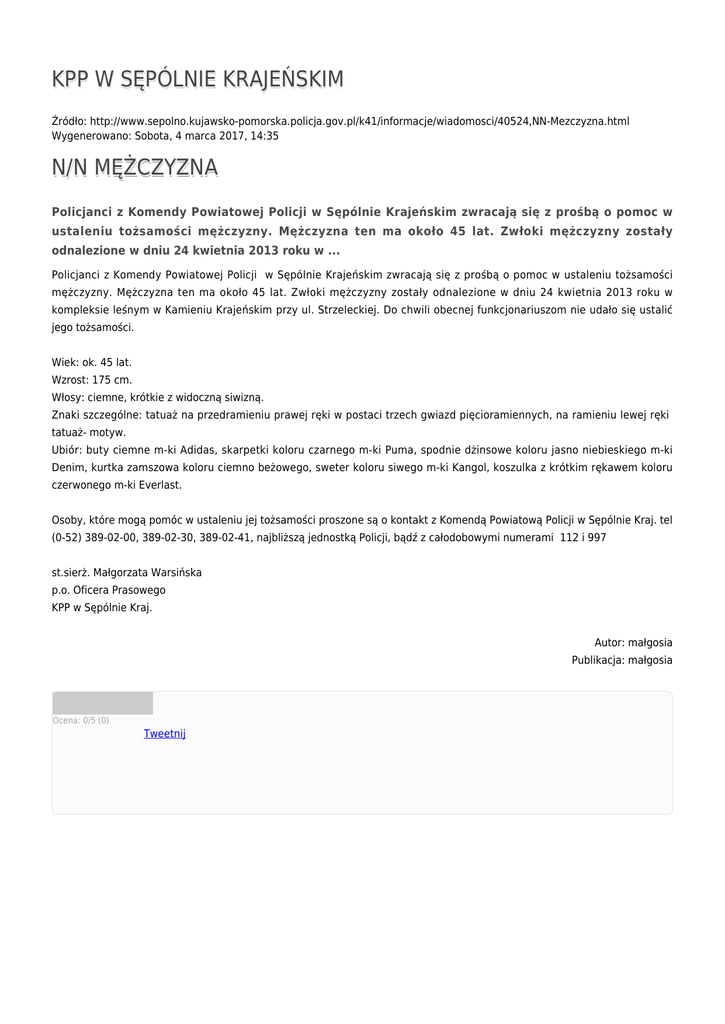 KPP W SĘPÓLNIE KRAJEŃSKIM Źródło: http://www.sepolno.kujawsko-pomorska.policja.gov.pl/k41/informacje/wiadomosci/40524,NN-Mezczyzna.html Wygenerowano: Sobota, 4 marca 2017, 14:35 N/N MĘŻCZYZNA Policjanci z Komendy Powiatowej Policji w Sępólnie Krajeńskim zwracają się z prośbą o pomoc w ustaleniu tożsamości mężczyzny. Mężczyzna ten ma około 45 lat. Zwłoki mężczyzny zostały odnalezione w dniu 24 kwietnia 2013 roku w ... Policjanci z Komendy Powiatowej Policji w Sępólnie Krajeńskim zwracają się z prośbą o pomoc w ustaleniu tożsamości mężczyzny. Mężczyzna ten ma około 45 lat. Zwłoki mężczyzny zostały odnalezione w dniu 24 kwietnia 2013 roku w kompleksie leśnym w Kamieniu Krajeńskim przy ul. Strzeleckiej. Do chwili obecnej funkcjonariuszom nie udało się ustalić jego tożsamości. Wiek: ok. 45 lat. Wzrost: 175 cm. Włosy: ciemne, krótkie z widoczną siwizną. Znaki szczególne: tatuaż na przedramieniu prawej ręki w postaci trzech gwiazd pięcioramiennych, na ramieniu lewej ręki tatuaż- motyw. Ubiór: buty ciemne m-ki Adidas, skarpetki koloru czarnego m-ki Puma, spodnie dżinsowe koloru jasno niebieskiego m-ki Denim, kurtka zamszowa koloru ciemno beżowego, sweter koloru siwego m-ki Kangol, koszulka z krótkim rękawem koloru czerwonego m-ki Everlast. Osoby, które mogą pomóc w ustaleniu jej tożsamości proszone są o kontakt z Komendą Powiatową Policji w Sępólnie Kraj. tel (0-52) 389-02-00, 389-02-30, 389-02-41, najbliższą jednostką Policji, bądź z całodobowymi numerami 112 i 997 st.sierż. Małgorzata Warsińska p.o. Oficera Prasowego KPP w Sępólnie Kraj. Autor: małgosia Publikacja: małgosia Ocena: 0/5 (0) Tweetnij