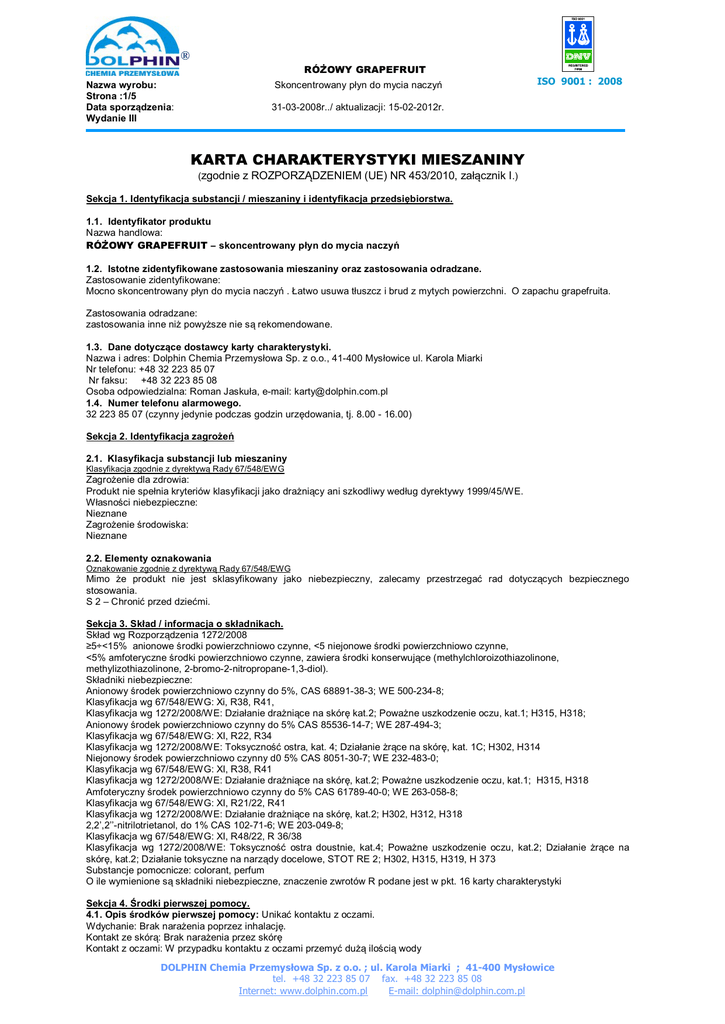® RÓŻOWY GRAPEFRUIT Skoncentrowany płyn do mycia naczyń Nazwa wyrobu: Strona :1/5 Data sporządzenia: Wydanie III ISO 9001 : 2008 31-03-2008r../ aktualizacji: 15-02-2012r. KARTA CHARAKTERYSTYKI MIESZANINY (zgodnie z ROZPORZĄDZENIEM (UE) NR 453/2010, załącznik I.) Sekcja 1. Identyfikacja substancji / mieszaniny i identyfikacja przedsiębiorstwa. 1.1. Identyfikator produktu Nazwa handlowa: RÓŻOWY GRAPEFRUIT – skoncentrowany płyn do mycia naczyń 1.2. Istotne zidentyfikowane zastosowania mieszaniny oraz zastosowania odradzane. Zastosowanie zidentyfikowane: Mocno skoncentrowany płyn do mycia naczyń . Łatwo usuwa tłuszcz i brud z mytych powierzchni. O zapachu grapefruita. Zastosowania odradzane: zastosowania inne niż powyższe nie są rekomendowane. 1.3. Dane dotyczące dostawcy karty charakterystyki. Nazwa i adres: Dolphin Chemia Przemysłowa Sp. z o.o., 41-400 Mysłowice ul. Karola Miarki Nr telefonu: +48 32 223 85 07 Nr faksu: +48 32 223 85 08 Osoba odpowiedzialna: Roman Jaskuła, e-mail: [email protected] 1.4. Numer telefonu alarmowego. 32 223 85 07 (czynny jedynie podczas godzin urzędowania, tj. 8.00 - 16.00) Sekcja 2. Identyfikacja zagrożeń 2.1. Klasyfikacja substancji lub mieszaniny Klasyfikacja zgodnie z dyrektywą Rady 67/548/EWG Zagrożenie dla zdrowia: Produkt nie spełnia kryteriów klasyfikacji jako drażniący ani szkodliwy według dyrektywy 1999/45/WE. Własności niebezpieczne: Nieznane Zagrożenie środowiska: Nieznane 2.2. Elementy oznakowania Oznakowanie zgodnie z dyrektywą Rady 67/548/EWG Mimo że produkt nie jest sklasyfikowany jako niebezpieczny, zalecamy przestrzegać rad dotyczących bezpiecznego stosowania. S 2 – Chronić przed dziećmi. Sekcja 3. Skład / informacja o składnikach. Skład wg Rozporządzenia 1272/2008 ≥5÷<15% anionowe środki powierzchniowo czynne, <5 niejonowe środki powierzchniowo czynne, <5% amfoteryczne środki powierzchniowo czynne, zawiera środki konserwujące (methylchloroizothiazolinone, methylizothiazolinone, 2-bromo-2-nitropropane-1,3-diol). Składniki niebezpieczne: Anionowy środek powierzchniowo czynny do 5%, CAS 68891-38-3; WE 500-234-8; Klasyfikacja wg 67/548/EWG: Xi, R38, R41, Klasyfikacja wg 1272/2008/WE: Działanie drażniące na skórę kat.2; Poważne uszkodzenie oczu, kat.1; H315, H318; Anionowy środek powierzchniowo czynny do 5% CAS 85536-14-7; WE 287-494-3; Klasyfikacja wg 67/548/EWG: XI, R22, R34 Klasyfikacja wg 1272/2008/WE: Toksyczność ostra, kat. 4; Działanie żrące na skórę, kat. 1C; H302, H314 Niejonowy środek powierzchniowo czynny d0 5% CAS 8051-30-7; WE 232-483-0; Klasyfikacja wg 67/548/EWG: XI, R38, R41 Klasyfikacja wg 1272/2008/WE: Działanie drażniące na skórę, kat.2; Poważne uszkodzenie oczu, kat.1; H315, H318 Amfoteryczny środek powierzchniowo czynny do 5% CAS 61789-40-0; WE 263-058-8; Klasyfikacja wg 67/548/EWG: XI, R21/22, R41 Klasyfikacja wg 1272/2008/WE: Działanie drażniące na skórę, kat.2; H302, H312, H318 2,2’,2’’-nitrilotrietanol, do 1% CAS 102-71-6; WE 203-049-8; Klasyfikacja wg 67/548/EWG: XI, R48/22, R 36/38 Klasyfikacja wg 1272/2008/WE: Toksyczność ostra doustnie, kat.4; Poważne uszkodzenie oczu, kat.2; Działanie żrące na skórę, kat.2; Działanie toksyczne na narządy docelowe, STOT RE 2; H302, H315, H319, H 373 Substancje pomocnicze: colorant, perfum O ile wymienione są składniki niebezpieczne, znaczenie zwrotów R podane jest w pkt. 16 karty charakterystyki Sekcja 4. Środki pierwszej pomocy. 4.1. Opis środków pierwszej pomocy: Unikać kontaktu z oczami. Wdychanie: Brak narażenia poprzez inhalację. Kontakt ze skórą: Brak narażenia przez skórę Kontakt z oczami: W przypadku kontaktu z oczami przemyć dużą ilością wody DOLPHIN Chemia Przemysłowa Sp. z o.o. ; ul. Karola Miarki ; 41-400 Mysłowice tel. +48 32 223 85 07 fax. +48 32 223 85 08 Internet: www.dolphin.com.pl E-mail: [email protected] ® RÓŻOWY GRAPEFRUIT Nazwa wyrobu: Strona :2/5 Data sporządzenia: Wydanie III Skoncentrowany płyn do mycia naczyń ISO 9001 : 2008 31-03-2008r../ aktualizacji: 15-02-2012r. Spożycie: Przepłukać usta wodą, nie podawać nic do picia. Nie wywoływać wymiotów 4.2. Najważniejsze ostre i opóźnione objawy oraz skutki narażenia. Kontakt ze skórą: przy długotrwałym kontakcie może występować niewielkie podrażnienie Kontakt z oczami: przy kontakcie może występować niewielkie podrażnienie Po spożyciu: Możliwe, wymioty, biegunka. Po wymiotach niebezpieczeństwo uduszenia się w wyniku tworzenia się piany. Objawy mogą wystąpić z opóźnieniem do 24 godzin od narażenia. 4.3. Wskazania dotyczące wszelkiej natychmiastowej pomocy lekarskiej i szczególnego postępowania z poszkodowanym Zdjąć zanieczyszczoną odzież, płukać skórę i oczy wodą. Leczenie objawowe. W przypadku połknięcia podać środek przeciwdziałający pienieniu, Sekcja 5. Postępowanie w przypadku pożaru 5.1. Środki gaśnicze. Pożary w obecności produktu gasić środkami odpowiednimi dla palących się materiałów. 5.2. Szczególne zagrożenia związane z mieszaniną Produkt niepalny, 5.3. Informacje dla straży pożarnej. Sam produkt nie pali się; pożar w otoczeniu gasić środkami odpowiednimi dla przyczyny pożaru Sekcja 6. Postępowanie w przypadku niezamierzonego uwolnienia do środowiska. 6.1. Indywidualne środki ostrożności, wyposażenie ochronne i procedury w sytuacjach awaryjnych Założyć odpowiedni sprzęt ochrony osobistej. Zapewnić właściwa wentylację. Unikać bezpośredniego kontaktu z uwalnianą substancją 6.2. Środki ostrożności w zakresie ochrony środowiska. Zapobiec zanieczyszczaniu wody i gleby. Zapobiec rozprzestrzenianiu się lub dostaniu do kanalizacji. 6.3. Metody i materiały zapobiegające rozprzestrzenianiu się skażenia i służące do usuwania skażenia. Rozlewy przysypać materiałem chłonnym i zebrać do zamykanego pojemnika. Zanieczyszczoną powierzchnię spłukać wodą 6.4. Odniesienie do innych 