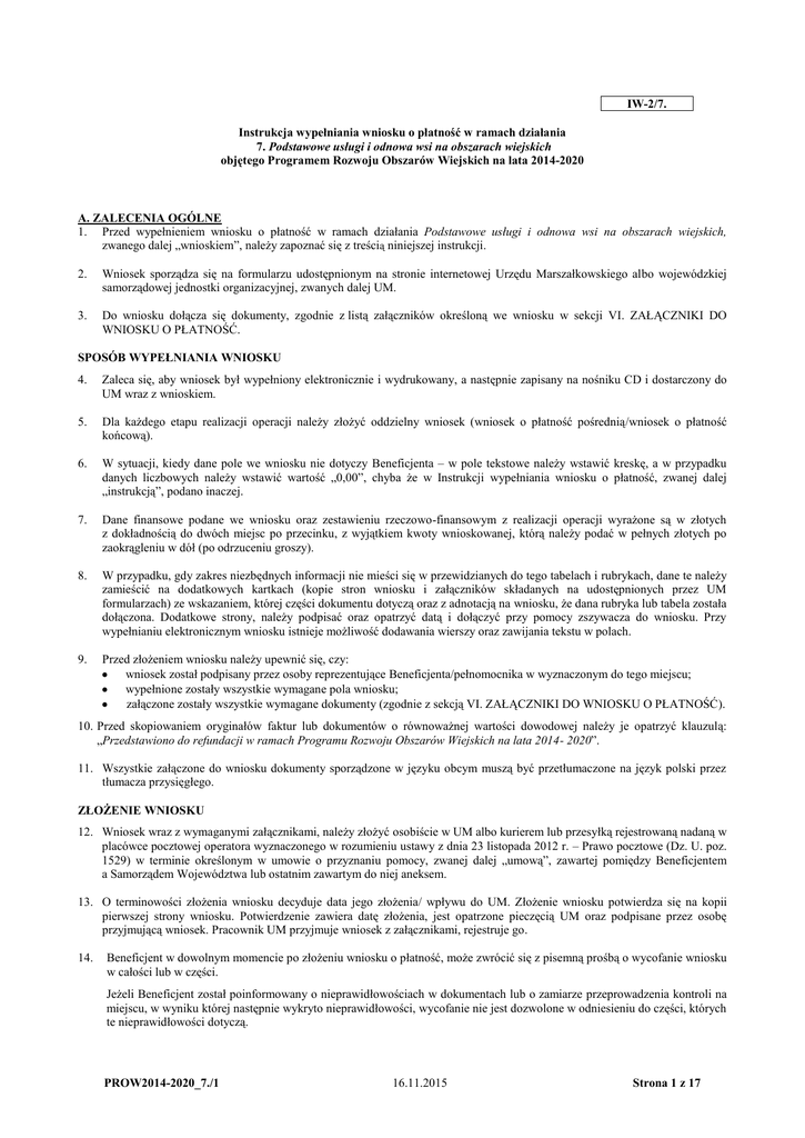 IW-2/7. Instrukcja wypełniania wniosku o płatność w ramach działania 7. Podstawowe usługi i odnowa wsi na obszarach wiejskich objętego Programem Rozwoju Obszarów Wiejskich na lata 2014-2020 A. ZALECENIA OGÓLNE 1. Przed wypełnieniem wniosku o płatność w ramach działania Podstawowe usługi i odnowa wsi na obszarach wiejskich, zwanego dalej „wnioskiem”, należy zapoznać się z treścią niniejszej instrukcji. 2. Wniosek sporządza się na formularzu udostępnionym na stronie internetowej Urzędu Marszałkowskiego albo wojewódzkiej samorządowej jednostki organizacyjnej, zwanych dalej UM. 3. Do wniosku dołącza się dokumenty, zgodnie z listą załączników określoną we wniosku w sekcji VI. ZAŁĄCZNIKI DO WNIOSKU O PŁATNOŚĆ. SPOSÓB WYPEŁNIANIA WNIOSKU 4. Zaleca się, aby wniosek był wypełniony elektronicznie i wydrukowany, a następnie zapisany na nośniku CD i dostarczony do UM wraz z wnioskiem. 5. Dla każdego etapu realizacji operacji należy złożyć oddzielny wniosek (wniosek o płatność pośrednią/wniosek o płatność końcową). 6. W sytuacji, kiedy dane pole we wniosku nie dotyczy Beneficjenta – w pole tekstowe należy wstawić kreskę, a w przypadku danych liczbowych należy wstawić wartość „0,00”, chyba że w Instrukcji wypełniania wniosku o płatność, zwanej dalej „instrukcją”, podano inaczej. 7. Dane finansowe podane we wniosku oraz zestawieniu rzeczowo-finansowym z realizacji operacji wyrażone są w złotych z dokładnością do dwóch miejsc po przecinku, z wyjątkiem kwoty wnioskowanej, którą należy podać w pełnych złotych po zaokrągleniu w dół (po odrzuceniu groszy). 8. W przypadku, gdy zakres niezbędnych informacji nie mieści się w przewidzianych do tego tabelach i rubrykach, dane te należy zamieścić na dodatkowych kartkach (kopie stron wniosku i załączników składanych na udostępnionych przez UM formularzach) ze wskazaniem, której części dokumentu dotyczą oraz z adnotacją na wniosku, że dana rubryka lub tabela została dołączona. Dodatkowe strony, należy podpisać oraz opatrzyć datą i dołączyć przy pomocy zszywacza do wniosku. Przy wypełnianiu elektronicznym wniosku istnieje możliwość dodawania wierszy oraz zawijania tekstu w polach. 9. Przed złożeniem wniosku należy upewnić się, czy: wniosek został podpisany przez osoby reprezentujące Beneficjenta/pełnomocnika w wyznaczonym do tego miejscu; wypełnione zostały wszystkie wymagane pola wniosku; załączone zostały wszystkie wymagane dokumenty (zgodnie z sekcją VI. ZAŁĄCZNIKI DO WNIOSKU O PŁATNOŚĆ). 10. Przed skopiowaniem oryginałów faktur lub dokumentów o równoważnej wartości dowodowej należy je opatrzyć klauzulą: „Przedstawiono do refundacji w ramach Programu Rozwoju Obszarów Wiejskich na lata 2014- 2020”. 11. Wszystkie załączone do wniosku dokumenty sporządzone w języku obcym muszą być przetłumaczone na język polski przez tłumacza przysięgłego. ZŁOŻENIE WNIOSKU 12. Wniosek wraz z wymaganymi załącznikami, należy złożyć osobiście w UM albo kurierem lub przesyłką rejestrowaną nadaną w placówce pocztowej operatora wyznaczonego w rozumieniu ustawy z dnia 23 listopada 2012 r. – Prawo pocztowe (Dz. U. poz. 1529) w terminie określonym w umowie o przyznaniu pomocy, zwanej dalej „umową”, zawartej pomiędzy Beneficjentem a Samorządem Województwa lub ostatnim zawartym do niej aneksem. 13. O terminowości złożenia wniosku decyduje data jego złożenia/ wpływu do UM. Złożenie wniosku potwierdza się na kopii pierwszej strony wniosku. Potwierdzenie zawiera datę złożenia, jest opatrzone pieczęcią UM oraz podpisane przez osobę przyjmującą wniosek. Pracownik UM przyjmuje wniosek z załącznikami, rejestruje go. 14. Beneficjent w dowolnym momencie po złożeniu wniosku o płatność, może zwrócić się z pisemną prośbą o wycofanie wniosku w całości lub w części. Jeżeli Beneficjent został poinformowany o nieprawidłowościach w dokumentach lub o zamiarze przeprowadzenia kontroli na miejscu, w wyniku której następnie wykryto nieprawidłowości, wycofanie nie jest dozwolone w odniesieniu do części, których te nieprawidłowości dotyczą. PROW2014-2020_7./1 16.11.2015 Strona 1 z 17 Jeśli UM poinformował już Beneficjenta o jakichkolwiek przypadkach niezgodności w dokumentach, lub jeśli powiadomił go o zamiarze przeprowadzenia kontroli na miejscu lub jeśli ta kontrola ujawni jakiekolwiek przypadki niezgodności, wycofanie nie jest dozwolone odnośnie do części tych dokumentów, których dotyczy niezgodność. Wycofanie wniosku w całości nie wywołuje żadnych skutków prawnych, powstaje więc sytuacja jakby Beneficjent tego wniosku nie złożył. Natomiast wycofanie wniosku w części lub innej deklaracji (załącznika) sprawia, że Beneficjent znajduje się w sytuacji sprzed złożenia odnośnych dokumentów lub ich części. ROZPATRZENIE WNIOSKU 15. Jeżeli wniosek o płatność zawiera braki (np. brak poprawnego dokumentu / niedołączenie wymaganego dokumentu / brak poprawnie wypełnionych pól wniosku / brak wypełnionego pola wniosku), UM wzywa Beneficjenta, w formie pisemnej do ich usunięcia w terminie 14 dni od dnia doręczenia wezwania. Termin uważa się za zachowany, jeżeli przed jego upływem nadano przesyłkę rejestrowaną w placówce pocztowej operatora wyznaczonego. 16. Jeżeli Beneficjent pomimo wezwania, nie usunął (uzupełnił) braków w wyznaczonym terminie, UM ponownie wzywa Beneficjenta, w formie pisemnej, do usunięcia braków w terminie 14 dni od dnia doręczenia wezwania. 17. Jeżeli Beneficjent, pomimo ponownego wezwania do usunięcia braków nie usunął ich w wyznaczonym terminie UM rozpatruje wniosek w zakresie, w jakim został wypełniony oraz na podstawie dołączonych i poprawnie sporządzonych dokumentów. 18. W trakcie rozpatrywania wniosku, UM może wzywać Beneficjenta na piśmie, do wyjaśnienia faktów istotnych 