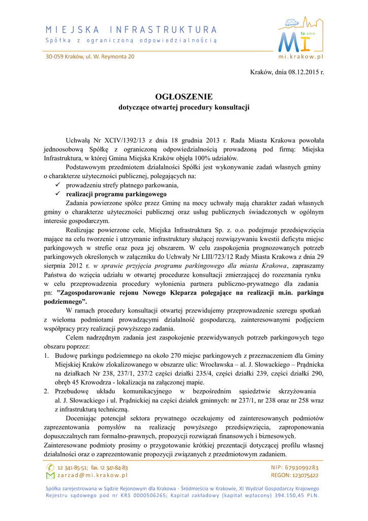 Kraków, dnia 08.12.2015 r. OGŁOSZENIE dotyczące otwartej procedury konsultacji Uchwałą Nr XCIV/1392/13 z dnia 18 grudnia 2013 r. Rada Miasta Krakowa powołała jednoosobową Spółkę z ograniczoną odpowiedzialnością prowadzoną pod firmą: Miejska Infrastruktura, w której Gmina Miejska Kraków objęła 100% udziałów. Podstawowym przedmiotem działalności Spółki jest wykonywanie zadań własnych gminy o charakterze użyteczności publicznej, polegających na: prowadzeniu strefy płatnego parkowania, realizacji programu parkingowego Zadania powierzone spółce przez Gminę na mocy uchwały mają charakter zadań własnych gminy o charakterze użyteczności publicznej oraz usług publicznych świadczonych w ogólnym interesie gospodarczym. Realizując powierzone cele, Miejska Infrastruktura Sp. z. o.o. podejmuje przedsięwzięcia mające na celu tworzenie i utrzymanie infrastruktury służącej rozwiązywaniu kwestii deficytu miejsc parkingowych w strefie oraz poza jej obszarem. W celu zaspokojenia prognozowanych potrzeb parkingowych określonych w załączniku do Uchwały Nr LIII/723/12 Rady Miasta Krakowa z dnia 29 sierpnia 2012 r. w sprawie przyjęcia programu parkingowego dla miasta Krakowa, zapraszamy Państwa do wzięcia udziału w otwartej procedurze konsultacji zmierzającej do rozeznania rynku w celu przeprowadzenia procedury wyłonienia partnera publiczno-prywatnego dla zadania pn: ”Zagospodarowanie rejonu Nowego Kleparza polegające na realizacji m.in. parkingu podziemnego”. W ramach procedury konsultacji otwartej przewidujemy przeprowadzenie szeregu spotkań z wieloma podmiotami prowadzącymi działalność gospodarczą, zainteresowanymi podjęciem współpracy przy realizacji powyższego zadania. Celem nadrzędnym zadania jest zaspokojenie przewidywanych potrzeb parkingowych tego obszaru poprzez: 1. Budowę parkingu podziemnego na około 270 miejsc parkingowych z przeznaczeniem dla Gminy Miejskiej Kraków zlokalizowanego w obszarze ulic: Wrocławska – al. J. Słowackiego – Prądnicka na działkach Nr 238, 237/1, 237/2 części działki 235/4, części działki 239, części działki 290, obręb 45 Krowodrza - lokalizacja na załączonej mapie. 2. Przebudowę układu komunikacyjnego w bezpośrednim sąsiedztwie skrzyżowania al. J. Słowackiego i ul. Prądnickiej na części działek gminnych: nr 237/1, nr 238 oraz nr 258 wraz z infrastrukturą techniczną. Doceniając potencjał sektora prywatnego oczekujemy od zainteresowanych podmiotów zaprezentowania pomysłów na realizację powyższego przedsięwzięcia, zaproponowania dopuszczalnych ram formalno-prawnych, propozycji rozwiązań finansowych i biznesowych. Zainteresowane podmioty prosimy o przygotowanie krótkiej prezentacji dotyczącej profilu własnej działalności oraz o zaprezentowanie propozycji związanych z przedmiotowym zadaniem. Licząc na Państwa doświadczenie w podobnych przedsięwzięciach, mamy nadzieję, że wykażą Państwo zainteresowanie tematem i będziemy mogli zapoznać się Państwa propozycją podczas krótkiego spotkania w siedzibie naszej firmy w uzgodnionym wcześniej, dogodnym dla Państwa terminie. Osobą do kontaktów i ustalenia terminarza spotkań z ramienia naszej firmy jest Zbigniew Putaj Wiceprezes Zarządu tel: 12 341-85-51. Oczekiwany termin spotkań z zainteresowanymi podmiotami: od 3 stycznia do 15 luty 2016 r. Dalszy etap postępowania zostanie określony po przeprowadzeniu powyższych rozmów. Ze swej strony gwarantujemy zachowanie poufności przy jednoczesnym zachowaniu zasad konkurencyjności w ramach obowiązującego prawa. Jeżeli jesteście Państwo zainteresowani powyższą propozycją prosimy o przesłanie do dnia 31 grudnia 2015 r. do godziny 15-tej maila na adres [email protected] w którym wyrazicie chęć udziału w otwartej procedurze konsultacyjnej, wraz podaniem danych adresowych podmiotu zainteresowanego i osoby do kontaktu (numer telefonu i mail).