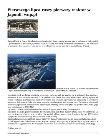 Pierwszego lipca ruszy pierwszy reaktor w Japonii, wnp.pl Kansai Electric Power Co planuje uruchomienie 1 lipca reaktor numer trzy w elektrowni jądrowej Oi - poinformował koncern.Japoński rząd już kilka miesięcy wcześniej informował, że zamierza uruchomić dwa reaktory atomowe w elektrowni atomowej Oi w prefekturze Fukui. Kansai Electric Power Co planuje uruchomienie 1 lipca reaktor numer trzy w elektrowni jądrowej Oi - poinformował koncern. Japoński rząd już kilka miesięcy wcześniej informował, że zamierza uruchomić dwa reaktory atomowe w elektrowni atomowej Oi w prefekturze Fukui. Reaktory elektrowni zostały wyłączone ponad rok temu, jak trzęsienie ziemi i wywołane nim tsunami, spowodowało katastrofę w elektrowni atomowej Fukushima. Jako pierwszy zostanie uruchomiony blok numer trzy. To jeden z młodszych bloków w japońskich elektrowniach atomowych. Oddany został do użytku 18 grudnia 1991 roku. Jego moc elektryczna to 1180 MW. Zgodnie z planem japońskiego koncernu blok osiągnie pełnię mocy ósmego lipca. Kolejnym blokiem, przewidzianym do uruchomienia, jest blok numer cztery także w elektrowni Oi. Jest on jeszcze młodszy niż „trójka”, bo został oddany do użytku drugiego lutego 1993 roku. Dysponuje on identyczną mocą co blok numer trzy. Kansai planuje uruchomić blok numer cztery 17 lipca. Pelnię mocy ma on osiągnąć tydzień później. Przed wypadkiem Fukushimy około 30 proc. energii elektrycznej w Japonii było wytwarzanych w elektrowniach jądrowych. Po wypadku wszystkie elektrownie atomowe wstrzymały produkcję. Źródło: wnp.pl http://elektrownia-jadrowa.pl/ 1 Autor: Dariusz Malinowski http://elektrownia-jadrowa.pl/ 2
