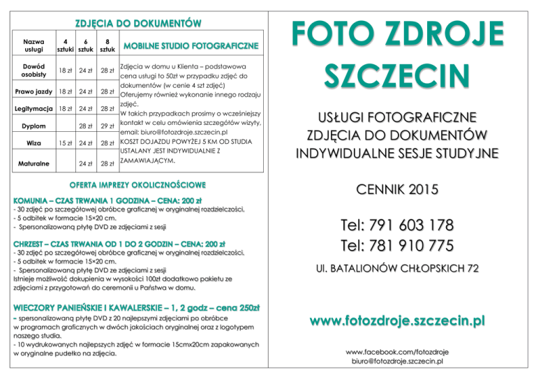 ZDJĘCIA DO DOKUMENTÓW Nazwa usługi 4 6 sztuki sztuk 8 sztuk 18 zł 24 zł 28 zł Prawo jazdy 18 zł 24 zł 28 zł Legitymacja 18 zł 24 zł 28 zł 28 zł 29 zł 24 zł 28 zł 24 zł 28 zł ZAMAWIAJĄCYM. Dowód osobisty Dyplom Wiza Maturalne 15 zł Zdjęcia w domu u Klienta – podstawowa cena usługi to 50zł w przypadku zdjęć do dokumentów (w cenie 4 szt zdjęć) Oferujemy również wykonanie innego rodzaju zdjęć. W takich przypadkach prosimy o wcześniejszy kontakt w celu omówienia szczegółów wizyty, email: [email protected] KOSZT DOJAZDU POWYŻEJ 5 KM OD STUDIA USTALANY JEST INDYWIDUALNIE Z OFERTA IMPREZY OKOLICZNOŚCIOWE - 30 zdjęć po szczegółowej obróbce graficznej w oryginalnej rozdzielczości, - 5 odbitek w formacie 15×20 cm. - Spersonalizowaną płytę DVD ze zdjęciami z sesji - 30 zdjęć po szczegółowej obróbce graficznej w oryginalnej rozdzielczości, - 5 odbitek w formacie 15×20 cm. - Spersonalizowaną płytę DVD ze zdjęciami z sesji Istnieje możliwość dokupienia w wysokości 100zł dodatkowo pakietu ze zdjęciami z przygotowań do ceremonii u Państwa w domu. spersonalizowaną płytę DVD z 20 najlepszymi zdjęciami po obróbce w programach graficznych w dwóch jakościach oryginalnej oraz z logotypem naszego studia. - 10 wydrukowanych najlepszych zdjęć w formacie 15cmx20cm zapakowanych w oryginalne pudełko na zdjęcia. FOTO ZDROJE SZCZECIN USŁUGI FOTOGRAFICZNE ZDJĘCIA DO DOKUMENTÓW INDYWIDUALNE SESJE STUDYJNE CENNIK 2015 Tel: 791 603 178 Tel: 781 910 775 Ul. BATALIONÓW CHŁOPSKICH 72 www.fotozdroje.szczecin.pl www.facebook.com/fotozdroje [email protected] SESJE NARZECZEŃSKIE - spersonalizowaną płytę DVD z 30 zdjęciami po obróbce w programach graficznych w dwóch jakościach – oryginalnej oraz z logotypem naszego studia, - 10 wydrukowanych najlepszych zdjęć w formacie 15cmx20cm zapakowanych w oryginalne OFERTA SESJE ŚLUBNE Przedstawione niżej pakiety można modyfikować w dowolny sposób tak, aby konfiguracja pakietu najlepiej Państwu odpowiadała Dojazd na miejsce ceremonii w obrębie Szczecina jest darmowy. Poza Szczecinem koszt dojazdu obliczany jest indywidualnie z Klientem SESJA CIĄŻOWA – Sesja zdjęciowa w domu klienta/ w plenerze/ w studio, – Fotografie poddane cyfrowej obróbce w programach graficznych, – Spersonalizowaną płytę DVD ze zdjęciami z sesji, – 10 zdjęć po szczegółowej obróbce graficznej w oryginalnej rozdzielczości, – 10 zdjęć po szczegółowej obróbce graficznej z logotypem studia przygotowanych do publikacji w internecie, – 5 odbitek w formacie 15×20 cm. SESJE RODZINNE - Sesja zdjęciowa w domu klienta/ w plenerze/ w studio, - Fotografie poddane cyfrowej obróbce w programach graficznych, - Spersonalizowaną płytę DVD ze zdjęciami z sesji, - 10 zdjęć po szczegółowej obróbce graficznej w oryginalnej rozdzielczości, - 10 zdjęć po szczegółowej obróbce graficznej z logotypem studia przygotowanych do publikacji w internecie, - 5 odbitek w formacie 15×20 cm - Każde dodatkowe zdjęcie – 10 zł, - Dodatkową odbitka w formacie 15×20 cm – 1,70 zł, - Istnieje również możliwość zamówienia kubków z wybranym przez Państwa zdjęciem, obrazów na płótnie, fotoksiążek, wydruków wielkoformatowych i wielu innych fotogadżetów ze zdjęciami z sesji. - ceremonia w kościele/USC, wesele (do oczepin) - 2 fotografów - plener – brak - 200 zdjęć na DVD (w etui) - multimedialny pokaz slajdów z 30 najlepszych ujęć - jeden foto-album z 30 zdjęciami (format 15×20) - ceremonia w kościele/USC, wesele (do oczepin) - 2 fotografów - plener – brak - 300 zdjęć na DVD (w etui x2) - multimedialny pokaz slajdów z 50 najlepszych ujęć - jeden foto-album z 30 zdjęciami (format 15×20) - przygotowania, ceremonia w kościele/USC, wesele (do oczepin) - 2 fotografów - plener – 5 godzin - 300 zdjęć na DVD (w etui x3) - multimedialny pokaz slajdów z 30 najlepszych ujęć - 3 foto-albumy z 50 zdjęciami (format 15×20) - dodatkowy album w cenie 100 zł - plener (3-4 godziny) 50 zdjęć na DVD, 30 w albumie – 600 zł - sesja w USC 30 zdjęć, 10 odbitek (format 15×20) – 300zł - auto do ślubu – Mercedes CLS rocznik 2006 – 450zł do 100km od Szczecina. Świadczymy również usługę wynajęcia auta na inne okazje.