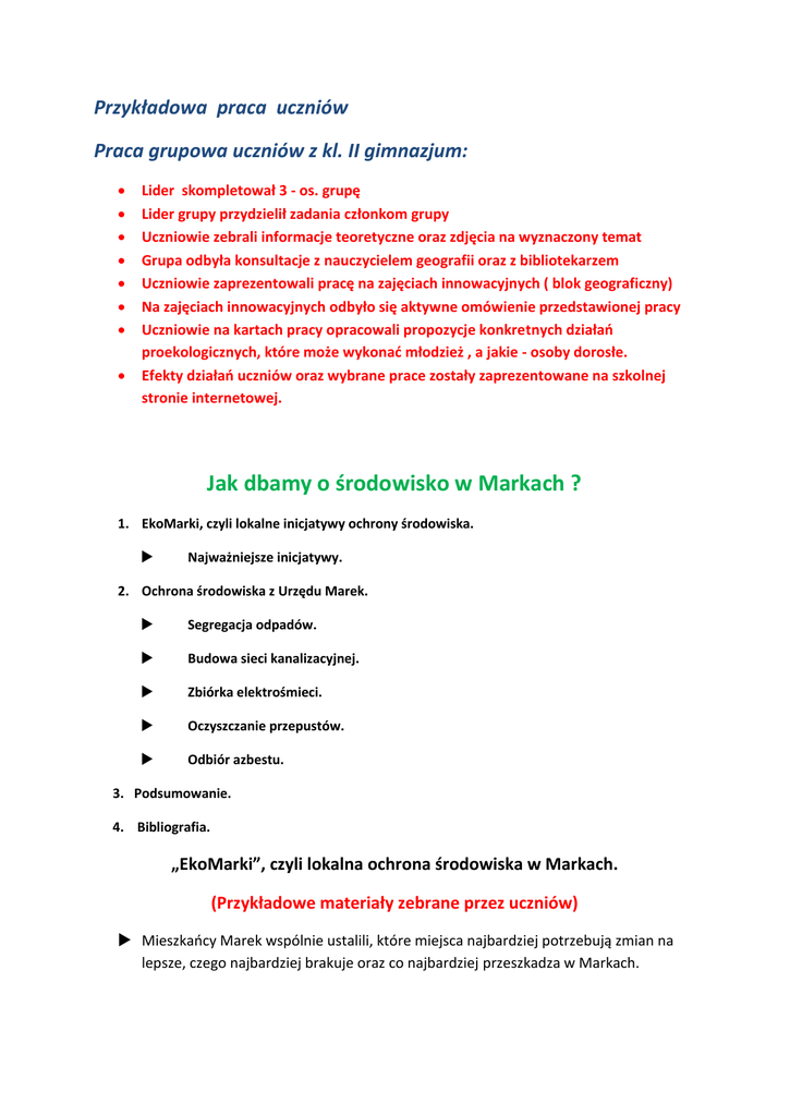 Przykładowa praca uczniów Praca grupowa uczniów z kl. II gimnazjum: Lider skompletował 3 - os. grupę Lider grupy przydzielił zadania członkom grupy Uczniowie zebrali informacje teoretyczne oraz zdjęcia na wyznaczony temat Grupa odbyła konsultacje z nauczycielem geografii oraz z bibliotekarzem Uczniowie zaprezentowali pracę na zajęciach innowacyjnych ( blok geograficzny) Na zajęciach innowacyjnych odbyło się aktywne omówienie przedstawionej pracy Uczniowie na kartach pracy opracowali propozycje konkretnych działań proekologicznych, które może wykonać młodzież , a jakie - osoby dorosłe. Efekty działań uczniów oraz wybrane prace zostały zaprezentowane na szkolnej stronie internetowej. Jak dbamy o środowisko w Markach ? 1. EkoMarki, czyli lokalne inicjatywy ochrony środowiska. Najważniejsze inicjatywy. 2. Ochrona środowiska z Urzędu Marek. Segregacja odpadów. Budowa sieci kanalizacyjnej. Zbiórka elektrośmieci. Oczyszczanie przepustów. Odbiór azbestu. 3. Podsumowanie. 4. Bibliografia. „EkoMarki”, czyli lokalna ochrona środowiska w Markach. (Przykładowe materiały zebrane przez uczniów) Mieszkańcy Marek wspólnie ustalili, które miejsca najbardziej potrzebują zmian na lepsze, czego najbardziej brakuje oraz co najbardziej przeszkadza w Markach. Tak powstało 17 inicjatyw lokalnych, w których mieszkańcy wspólnie będą sprzątać i zmieniać Marki na jeszcze bardziej zielone i eko. Projekt „EkoMarki…” realizowany w ramach programu „Edukacja ekologiczna” ma na celu wzmocnienie działań społeczności lokalnych na rzecz zrównoważonego rozwoju Monitoring pomników przyrody w Gminie Miasto Marki - akcja inwentaryzacji pomników przyrody w gminie przeprowadzona przez uczniów szkół gimnazjalnych, w ramach której powstanie mapa on-line. Sponsoring dla skrzydlatych - akcja zakładania budek dla ptaków i nietoperzy w celu zwiększenia liczby potencjalnych miejsc lęgowych i gniazdowych tych zwierząt Nasz las - nasze życie - społeczna akcja sprzątania lasu Ścieżka przyrodnicza w "Dębowym lesie" - społeczna akcja sprzątania terenu leśnego w okolicy osiedla oraz zapewnienie ptakom potencjalnych miejsc lęgowych przez wywieszenie budek lęgowych Oczyszczenie zbiorników wodnych w "Dębowym lesie" - społeczne akcje sprzątania obszarów nad zbiornikami wodnymi, ustawienie koszy na odpady. Przeciwdziałanie zanikaniu owadów zapylających - zakup i montaż w terenie w okolicy jednego z osiedli w Markach budek i domków dla owadów zapylających (pszczół, błonkówek) Zagospodarowanie i pielęgnacja zbiornika Meksyk - zbudowanie pomostu w celu ograniczenia zadeptywania szuwarów przez mieszkańców Marek, postawienie tablic informacyjnych Odtworzenie warstwy krzewów w parku Dziesięciu Powieszonych - przywrócenie siedlisk niewielkich ptaków wróblowatych. ................................................................. Ochrona środowiska realizowana przez Urząd Miasta Marki: Segregacja odpadów: Odpady segregujemy do odpowiednich worków lub pojemników : 1. Worek zielony – szkło (np.: opakowania ze szkła białego lub kolorowego; słoiki) 2. Worek żółty – plastik i metal (butelki PET; AGD z plastiku – miski, wiadra reklamówki; puszki aluminiowe) 3. Worek niebieski – papier (karton, książki zeszyty, gazety, torby papierowe) 4. 5. Worek brązowy – bioodpady zielone (trawa, kora, obierki, trociny, owoce, warzywa) Odpady wielkogabarytowe (meble, stolarka budowlana, sprzęt sportowy, małe i duże AGD, RTV) ...................................................................... Podsumowanie 1. W Markach powstała lokalny projekt o nazwie „EkoMarki”, w której zwykli mieszkańcy Marek ustalili, które miejsca w Markach potrzebują zmiany na lepsze i tak utworzyli 17 inicjatyw mających na celu zmianę niektórych miejsc w Markach związanych z przyrodą i środowiskiem. 2. W Markach segregacją odpadów zajmuje się wybrana firma. Nasze miasto podzielone jest na 4 sektory ze względu na odbiór odpadów. 3. Budowa kanalizacji niesie za sobą korzyści takie jak: zmniejszanie strat wody dostarczanej odbiorcom, poprawa jakości wody pitnej, poprawa jakości wód powierzchniowych i gleby. 4. Miasto Marki organizuje bezpłatne zbiórki zużytego sprzętu elektronicznego w punkcie odbioru przy ul. Dużej oraz odbiór i utylizacja odpadów zawierających rakotwórczy azbest. Bibliografia marki.net.pl czyste.marki.pl grafika Google.